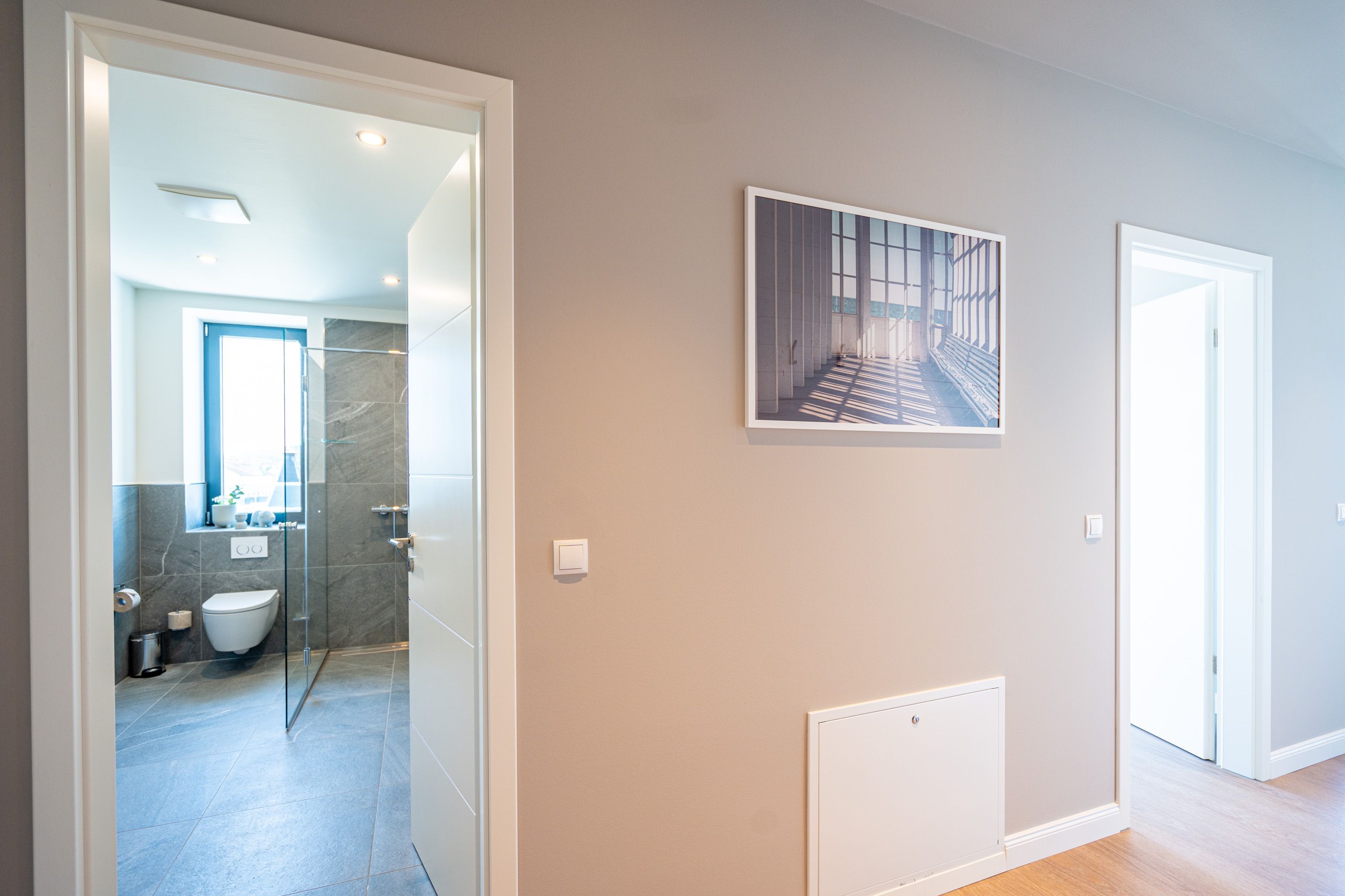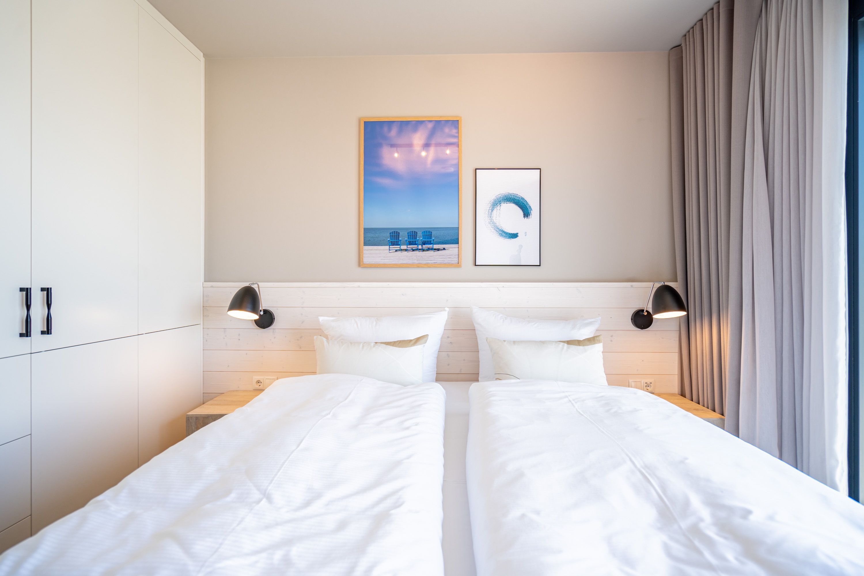 Die 2024 fertig gestellte Strandterrasse liegt direkt an der belebten Strandpromenade und bietet einen einzigartigen Ausblick auf die Grand Dame der historischen Seebrücken sowie die historische Konzertmuschel, einem beliebten Treffpunkt für Kunst und Kultur. Dahinter liegt die Ostsee ein Panorama, das zu den schönsten in den Kaiserbädern gehört. Es ist wie das Abtauchen in eine andere Zeit. In eine Zeit, in der man mit Stock, Sonnenschirm und Hut fürs „Sehen und gesehen werden“ über die Promenade schlenderte; aber auch in eine Zeit, in der damals wie heute Zeit einmal für eine kurze Weile keine Rolle spielt. Weil man angekommen ist im Loslassen, Entspannen und Genießen. Es ist dieser besondere Geruch nach Meeresluft und Freiheit, der in Erinnerung bleibt. Dazu die Bilder, die man mitnimmt. Von langen Strandspaziergängen, vom Lachen in fröhlich schäumenden Ostseewellen, von der Zeit in einem wunderschönen Urlaubsdomizil. Denn genau das ist die Strandterrasse mit ihren 56 modernen und exklusiven Ferienappartements direkt gegenüber der Ahlbecker Seebrücke. Die Ein-, Zwei- oder Dreizimmerwohnungen zwischen 40 und 70 Quadratmeter groß sind von einer Innenarchitektin gemeinsam mit unserem Erfahrungsschatz an Gästewünschen mit viel Liebe zum Detail und ganz individuell konzipiert worden. Entspannung und Wohlfühlen stehen an erster Stelle. Alles ist aufeinander abgestimmt und sorgt für eine gemütliche Atmosphäre. Wählen Sie zwischen einem Domizil in einem hellen, sandfarbenen Designkonzept oder einem Appartement mit anthrazitfarbenen Farbakzenten. Alle Appartements verfügen gleichermaßen über eine stilvolle und komfortable Einrichtung, die passgenau angefertigt worden ist, sowie über moderne Küchen und Bäder. Jedem Schlafzimmer ist ein eigenes Bad mit Dusche zugeordnet (außer App. B4.5). Die Appartements besitzen fast alle einen Balkon viele schauen sogar zur Ostsee hinaus. Die meisten Feriendomizile haben einen Elektrokamin und Infrarotsaunen. Im Erdgeschoss befindet sich ein separater Gemeinschaftsraum für Fahrräder. Außerdem besteht die Möglichkeit, im Gemeinschaftswaschraum 2 Waschmaschinen & Trockner zu nutzen. Ergänzt wird das Angebot durch eine Gemeinschaftssauna, die täglich von 11:00 bis 22:00 Uhr nutzbar ist. In der Tiefgarage (Einfahrtshöhe 2,03 Meter) steht für jede Wohnung 1 Pkw-Stellplatz zur Verfügung. Ist alles zur Zufriedenheit untergebracht? Dann kann der Urlaub ja beginnen. Und beim Blick vom Balkon über die Ostsee treffen sich zum Sonnenaufgang das Heute und das Damals. Gelassenheit legt sich beim Gang hinunter an den Strand auf die Seele. Jetzt darf die Zeit stehenbleiben.