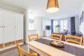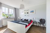 Die Fewo verfügt über zwei Schlafzimmer (1x Doppelbett 1,80 x 2,00m; 1x kl. Doppelbett 1,40 x 2,00m), ein Bad mit Dusche und ein Gäste-WC. Der Wohnbereich ist mit einer gemütlichen Couchecke und einem Essbereich in hellen Farben ausgestattet. Die Küche findet sich etwas abgetrennt, angrenzend an den Wohnbereich.