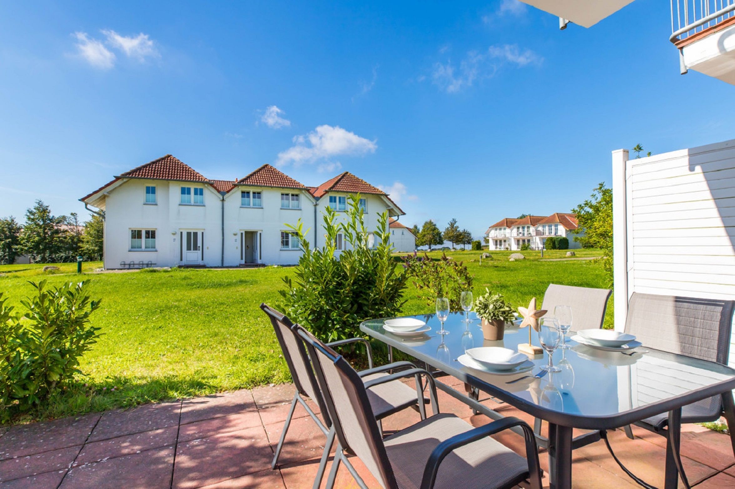 • Terrasse mit Gartenmöbeln & Strandkorb