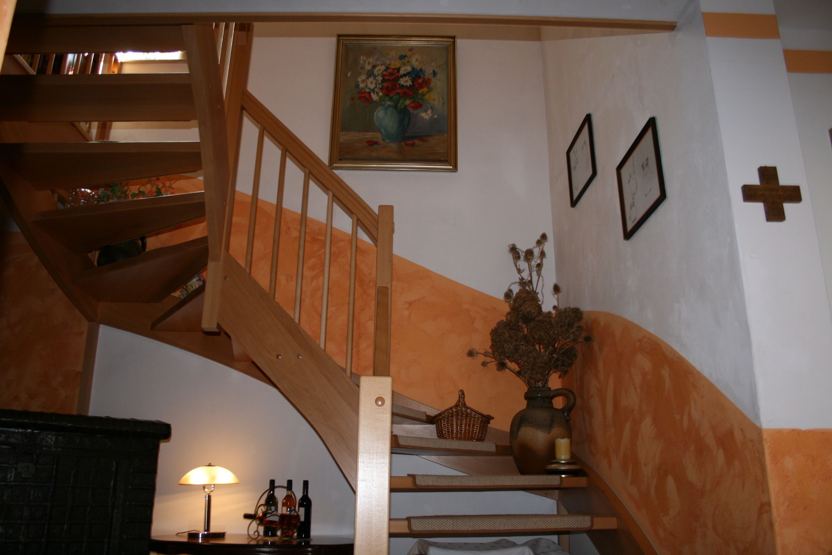 Die mit ca.45m² Wohnfläche versehene 1-Zimmer-Wohnung Kaufmann hat eine offene Wohngestaltung mit einem Wohn-, Eß- und Küchenbereich. Sie kann bis zu 3 Gäste (2 Erwachsene und 1 Kleinkind) als Ferienunterkunft beherbergen. Erzogene und stubenreine Hunde bis zu einer Rißhöhe von ca. 50 cm sind willkommen. Weiterhin steht der im hinteren Bereich des Hauses mit seinen allergikerfreundlichen Ferienwohnungen (ohne Hund) ca. 50m² große, separate Empfangs- und Dielenbereich (ohne Hunde) mit Kamin gemeinschaftlich zur Verfügung und läd zum verweilen bei Spieleabende oder zum lesen eines Buches ein.