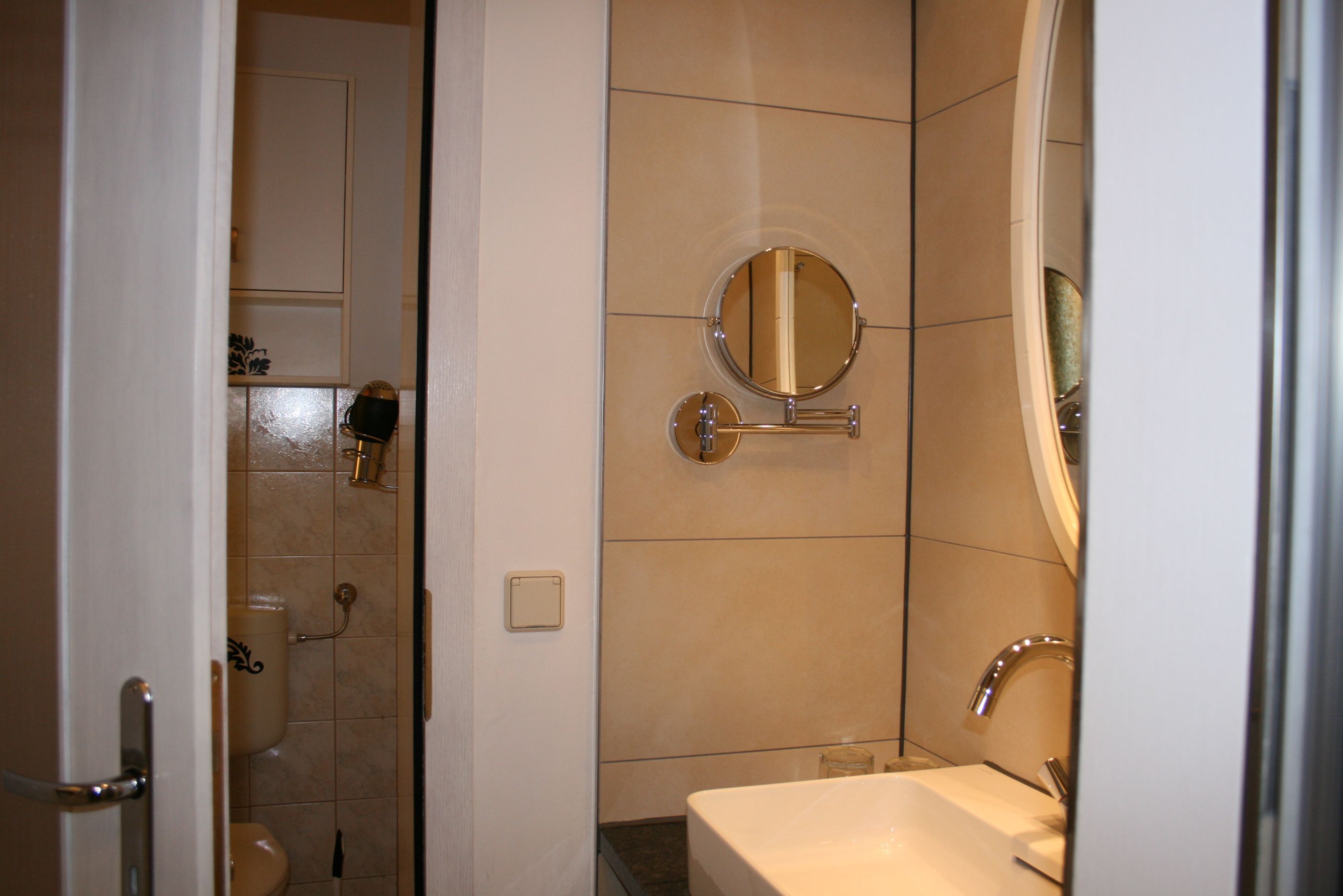 Der Sanitärbereich hat eine ebenerdige Dusche (inkl. Regenbrause). Dort befinden sich bei gewählter Zusatzleistung Handtücher, Waschlappen, Duschvorleger und Badehandtücher. Zudem schließt sich hier ein separates WC an .