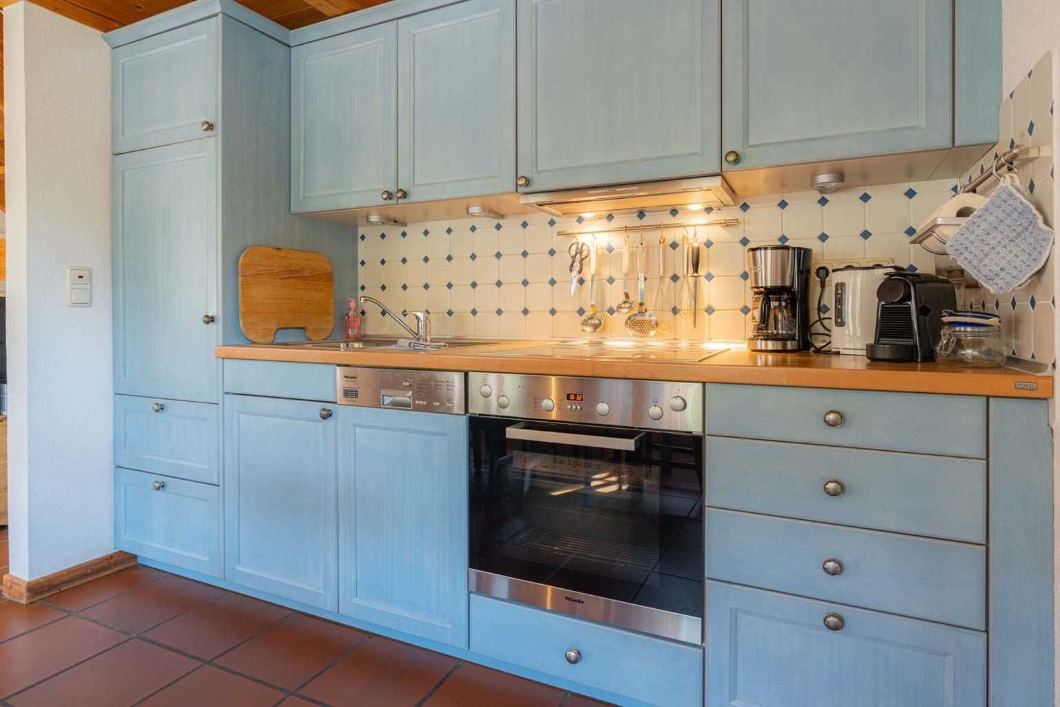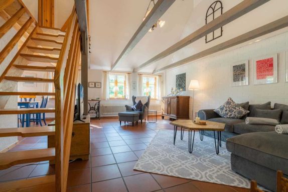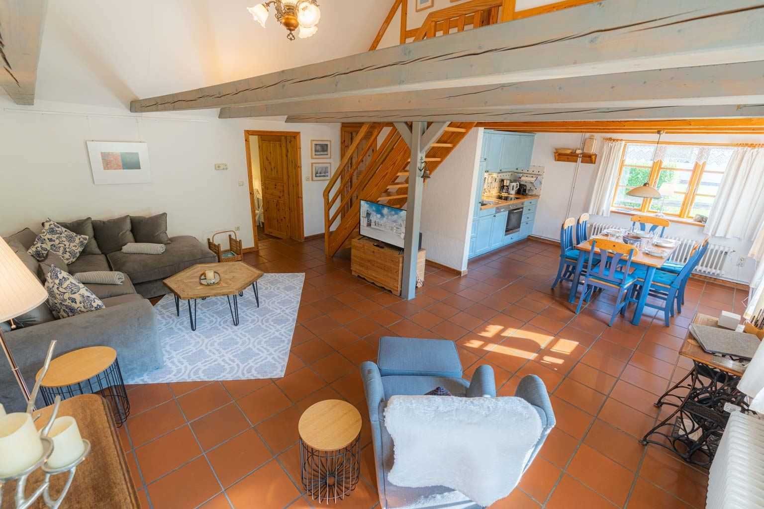 Wohnzimmer mit gemütlicher Wohnlandschaft, bequemem Ohrensessel und SMART-TV (Sat). Die offene Küche bietet mit Backofen, Geschirrspüler, Kühlschrank mit Gefrierfach und Nespresso Kapsel-Kaffeemaschine jeglichen Komfort. Vor der Küche befindet sich der Essbereich mit großem Esstisch.