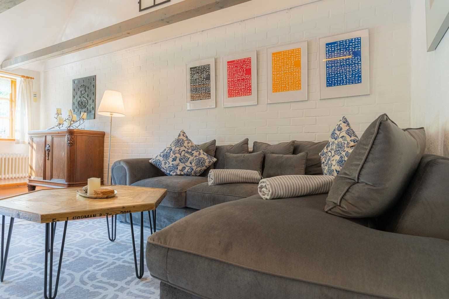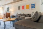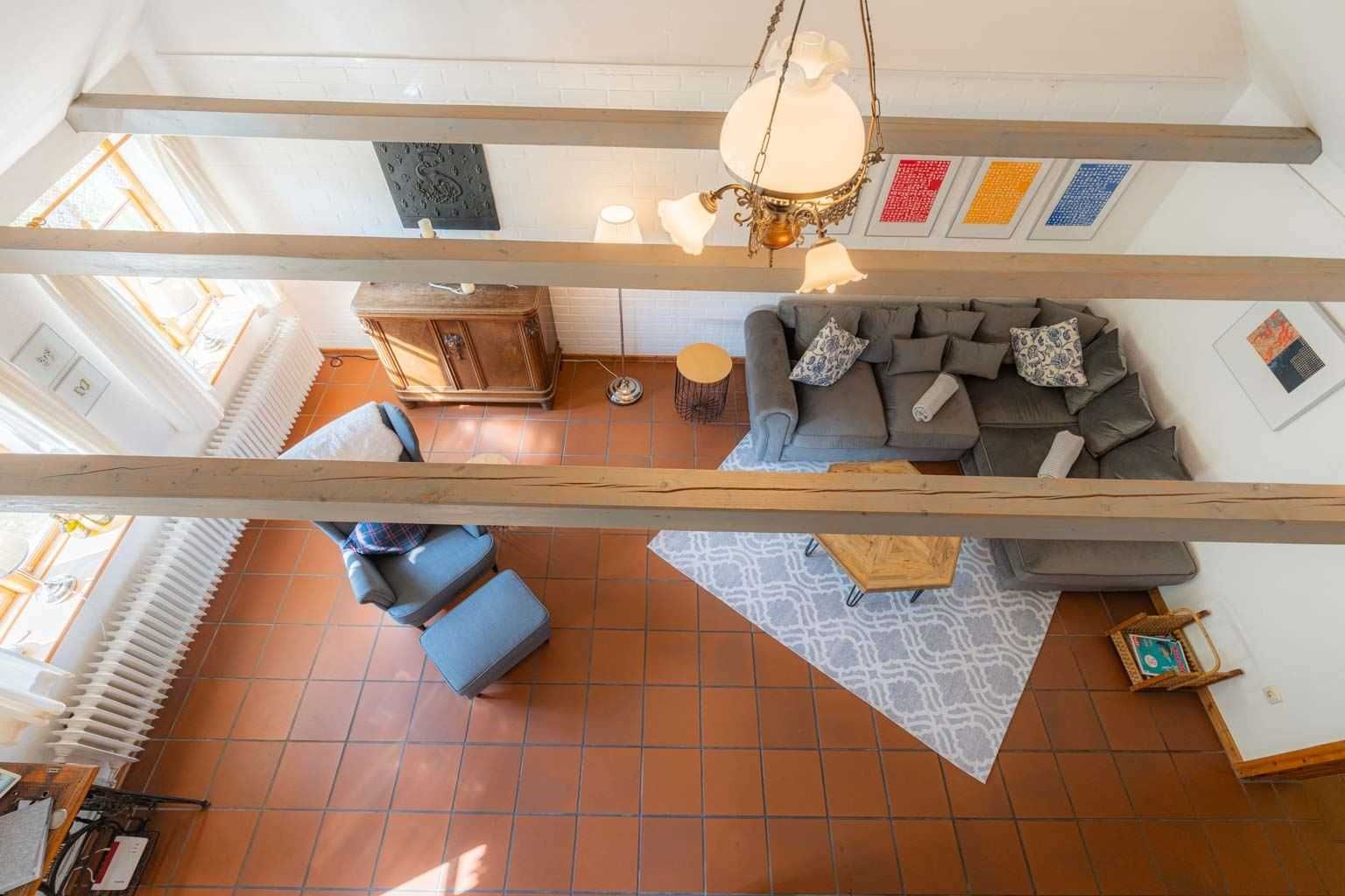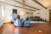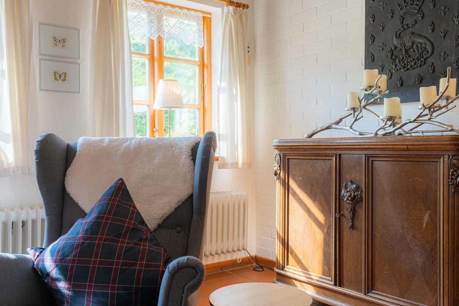 Wohnzimmer mit gemütlicher Wohnlandschaft, bequemem Ohrensessel und SMART-TV (Sat). Die offene Küche bietet mit Backofen, Geschirrspüler, Kühlschrank mit Gefrierfach und Nespresso Kapsel-Kaffeemaschine jeglichen Komfort. Vor der Küche befindet sich der Essbereich mit großem Esstisch.