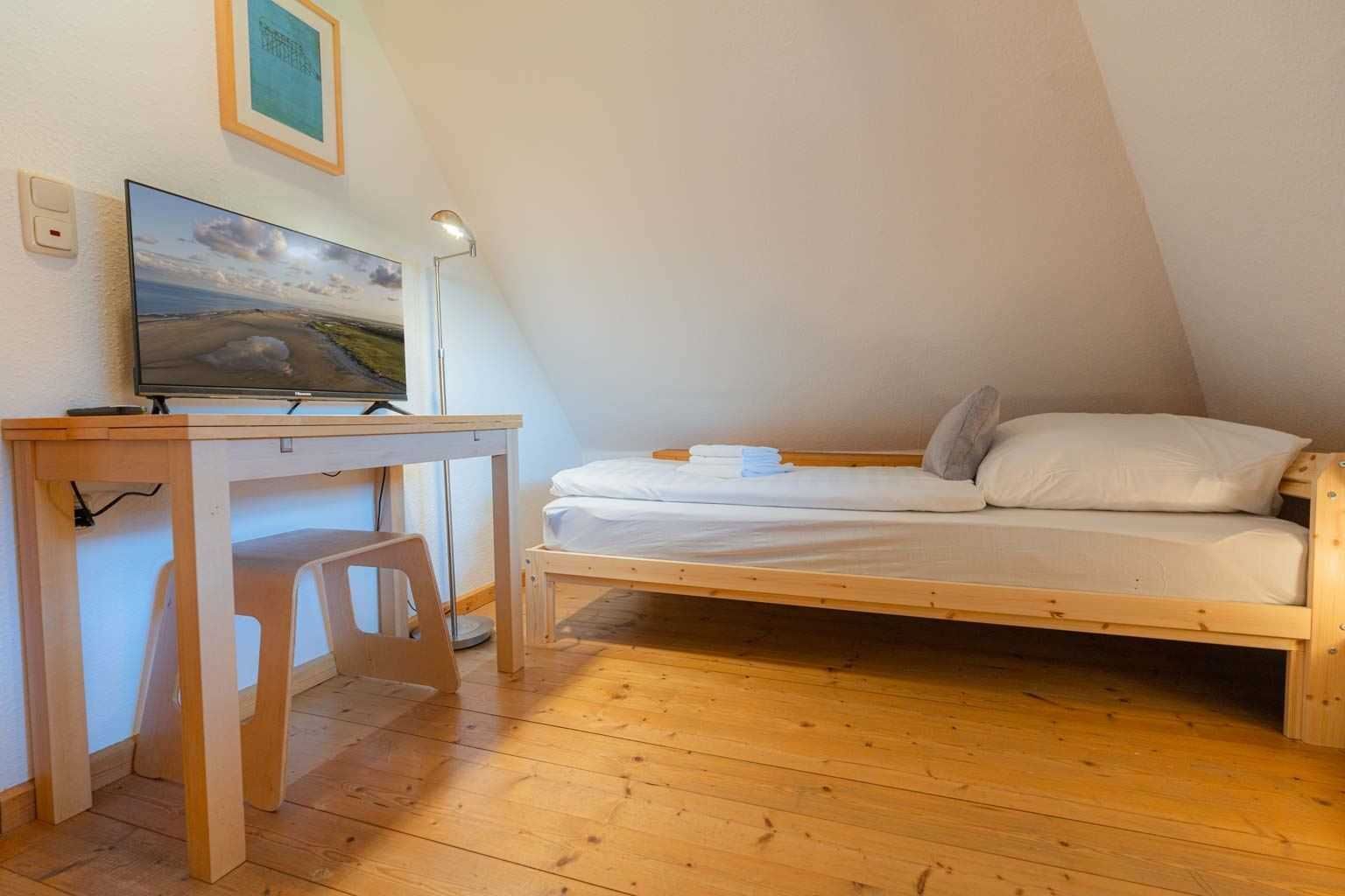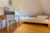 Schlafzimmer mit Doppelbett (2x 90x200cm), SMART-TV (nur Streaming via Fire TV Stick), Kommode und Garderobenstange.