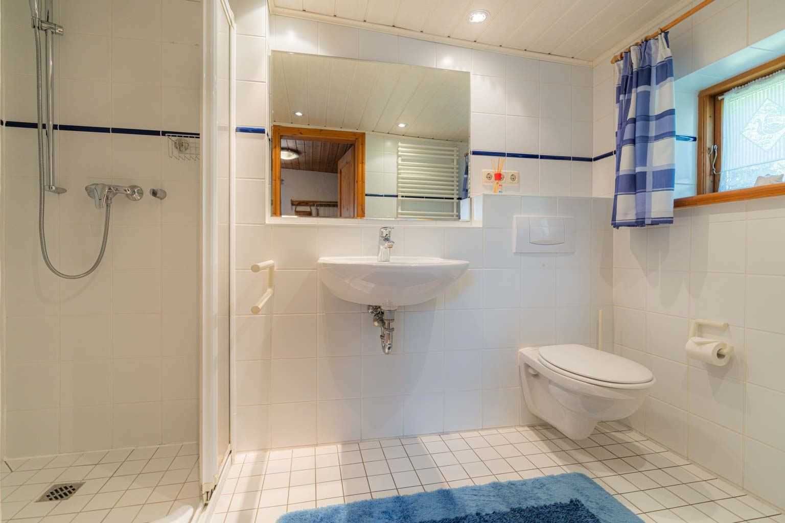 Badezimmer (Duschbad) mit bodengleicher Dusche, WC, Föhn und Tageslicht.