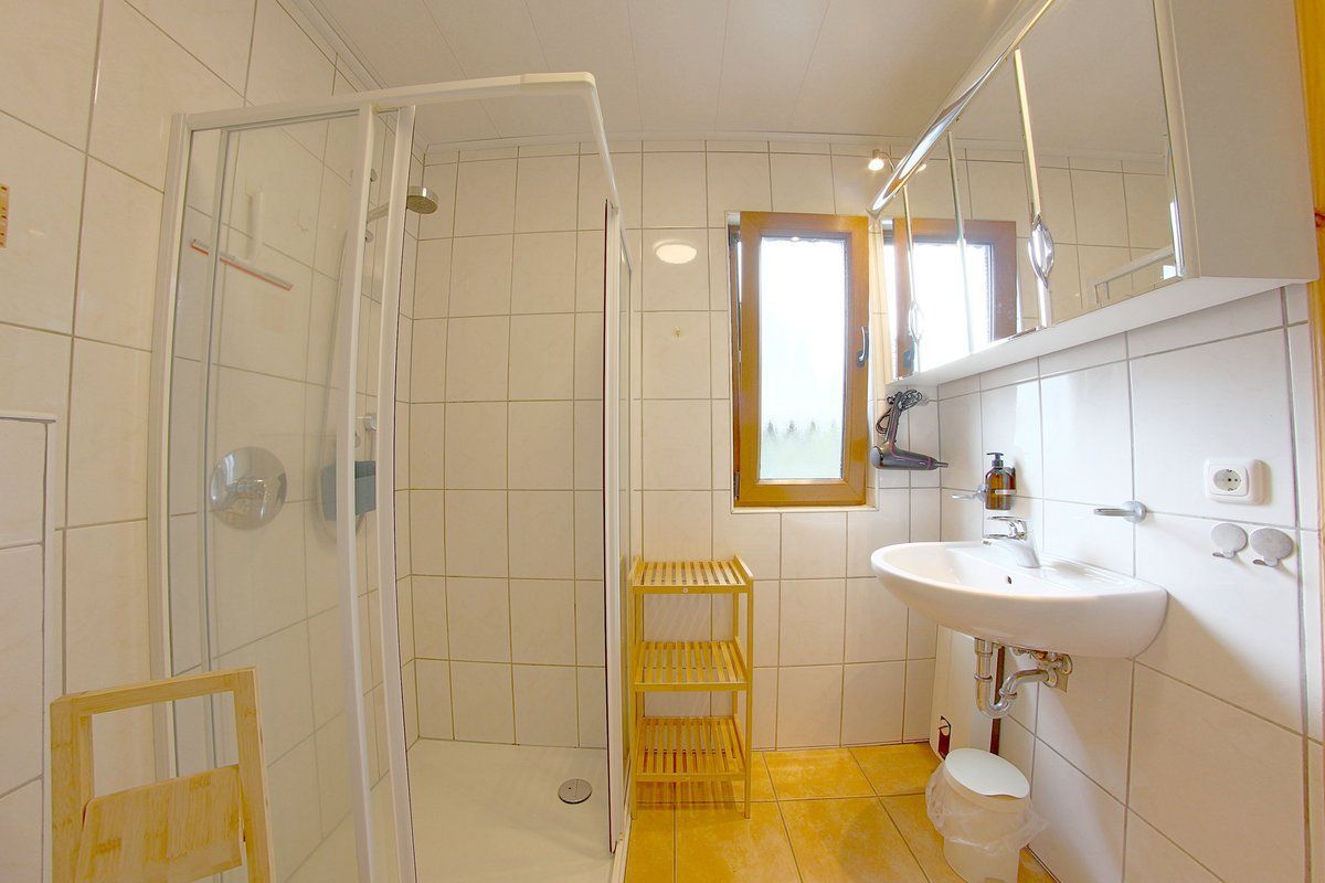 Im OG gibt es 2 weitere Schlafzimmer, eins mit Doppelbett und eins mit 2 aneinander gestellten Einzelbetten ( je 1,00 x 2,00 m ), Flachbildfernseher, Kinderbett und Verdunkelungsmöglichkeit. Ein weiteres Duschbad ist ebenfalls im OG.