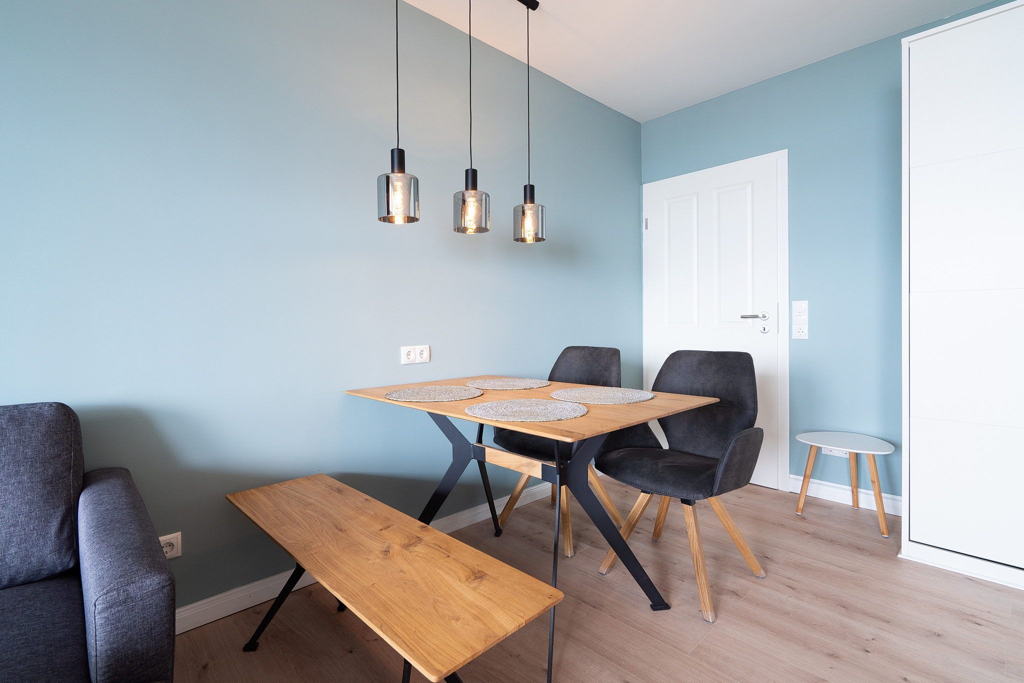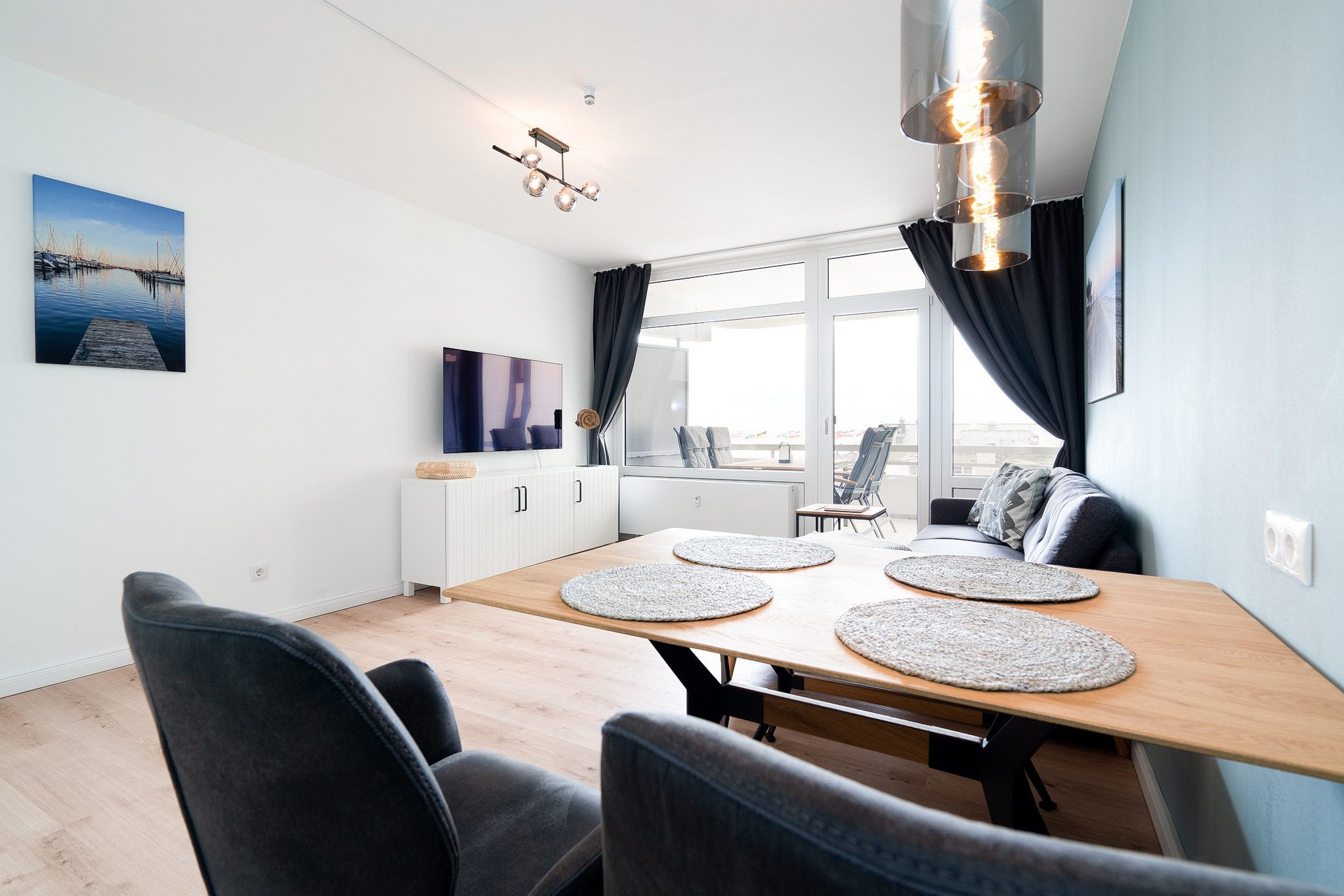 Balkon in südliche Richtung mit Blick auf die Ostsee. Eigener, schmaler PKW-Stellplatz (max. Höhe 1,90 m), Waschmaschine und Trockner gegen Gebühr.