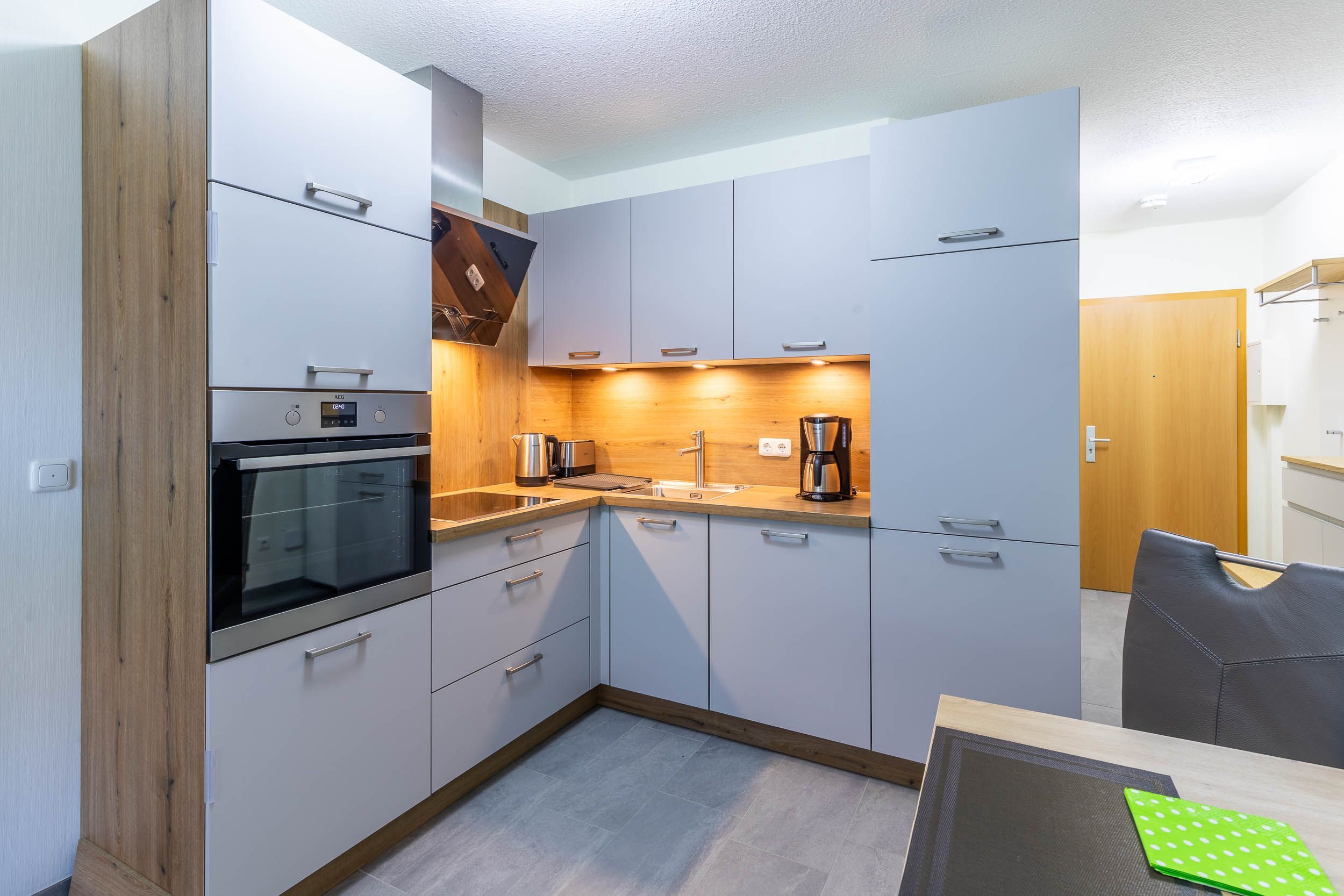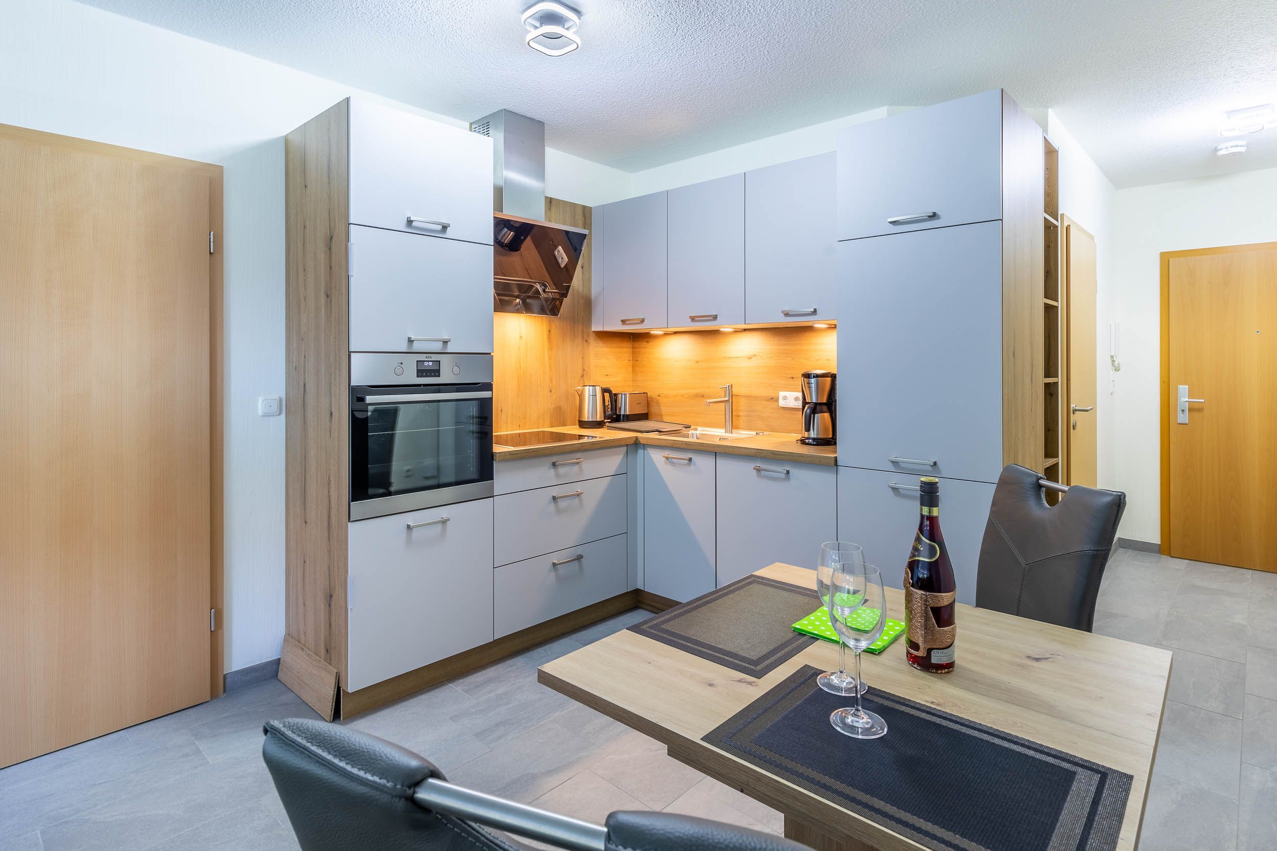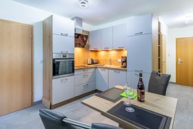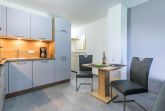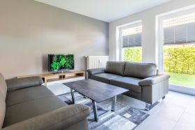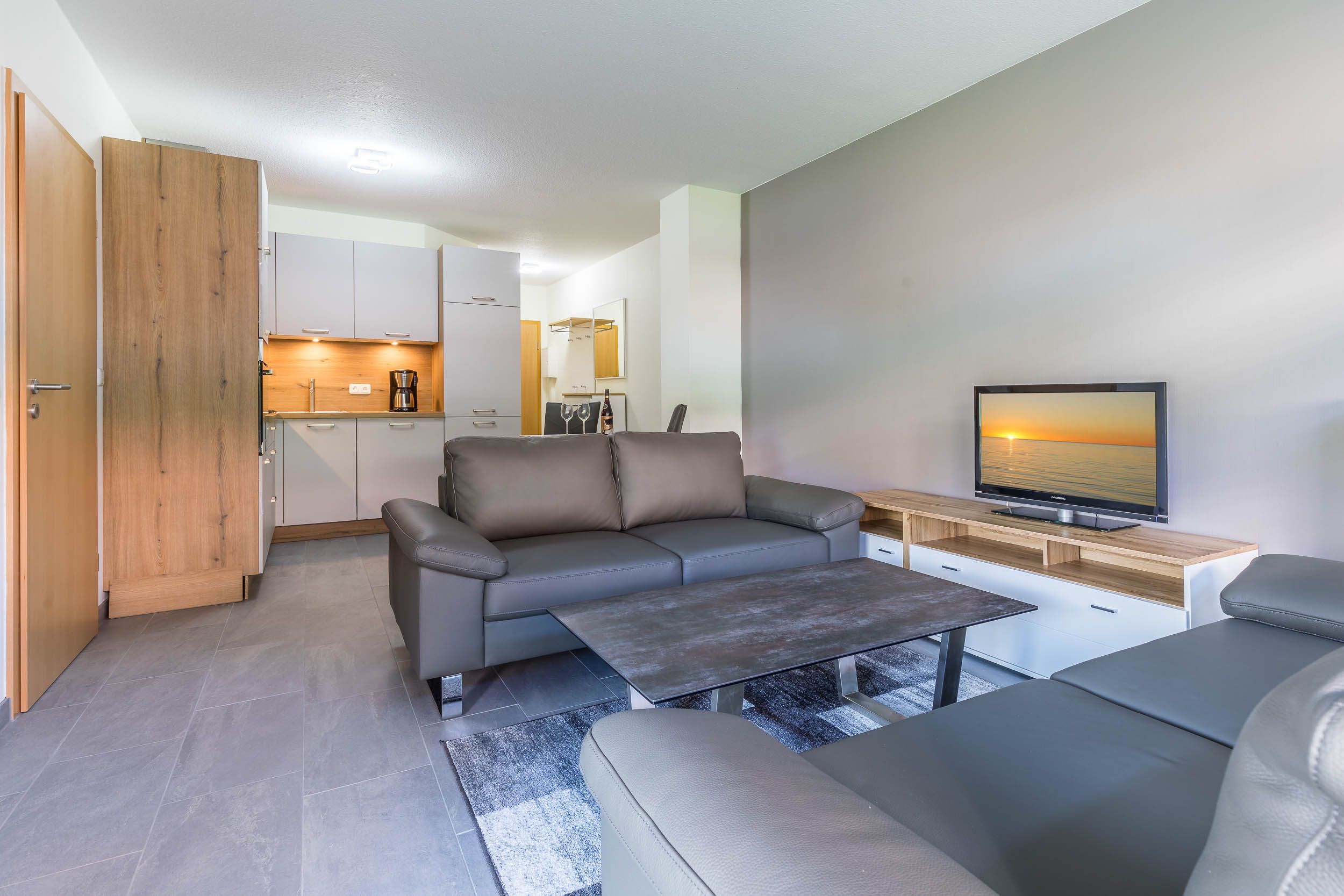 Im kombinierten Wohnbereich stehen eine komfortable Küchenzeile, ein Esstisch und zwei bequeme Sofas zur Verfügung. Ein Flatscreen-TV sorgt für etwas Unterhaltung. Von hier aus gelangen Sie auch auf die schöne möblierte Terrasse.
