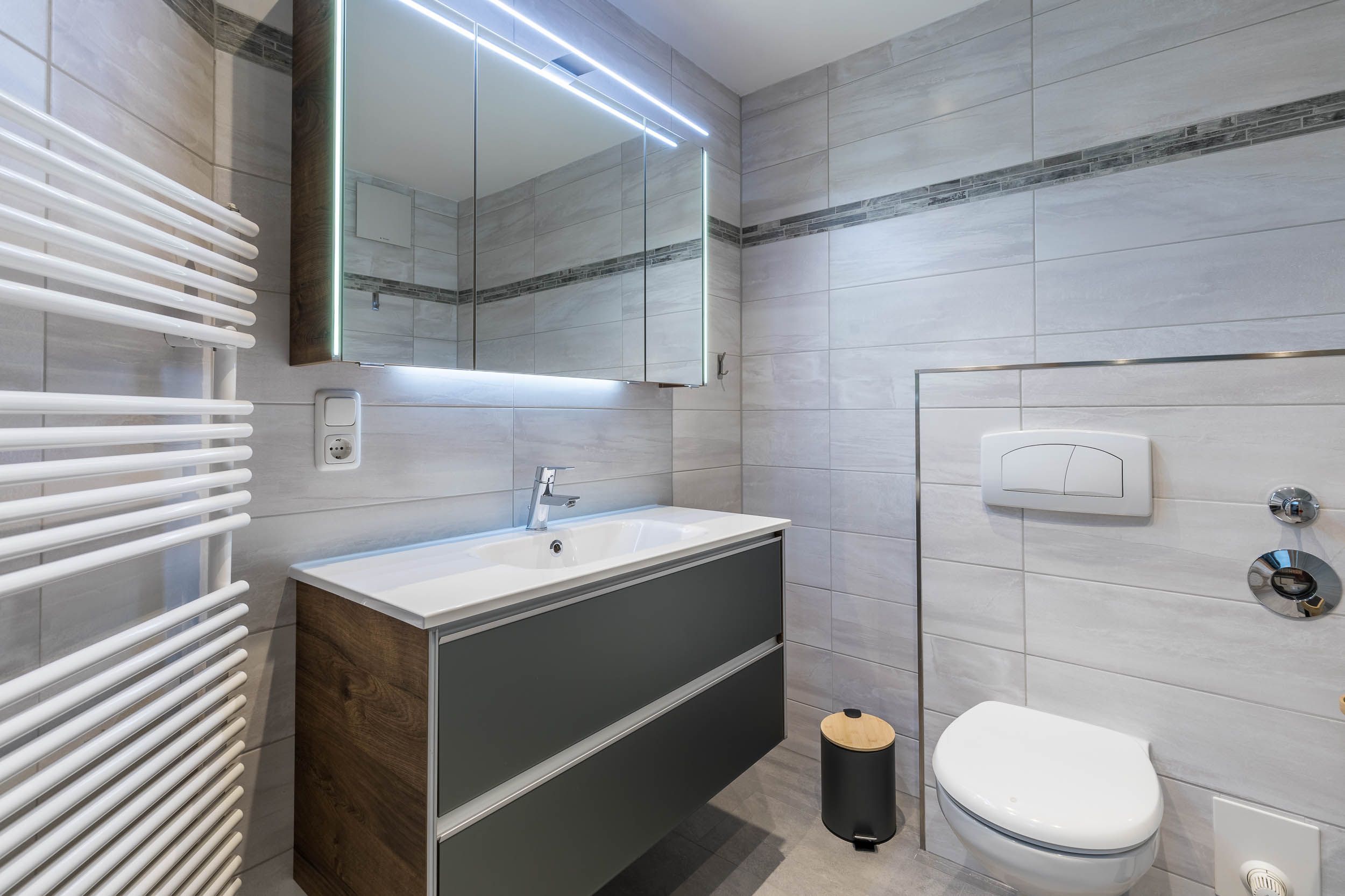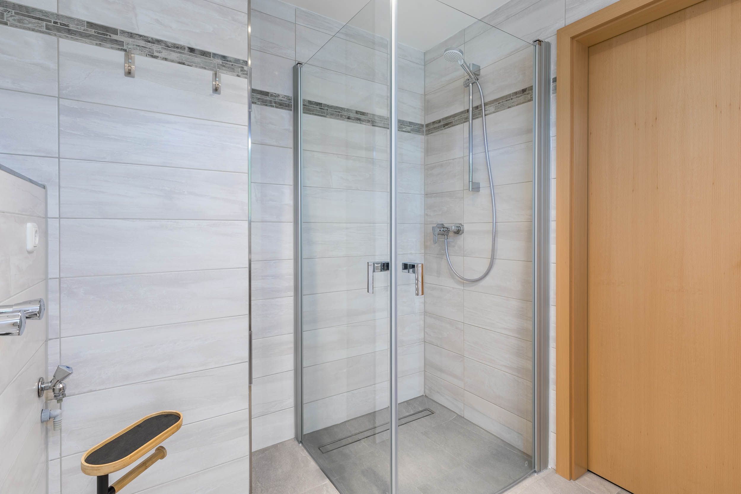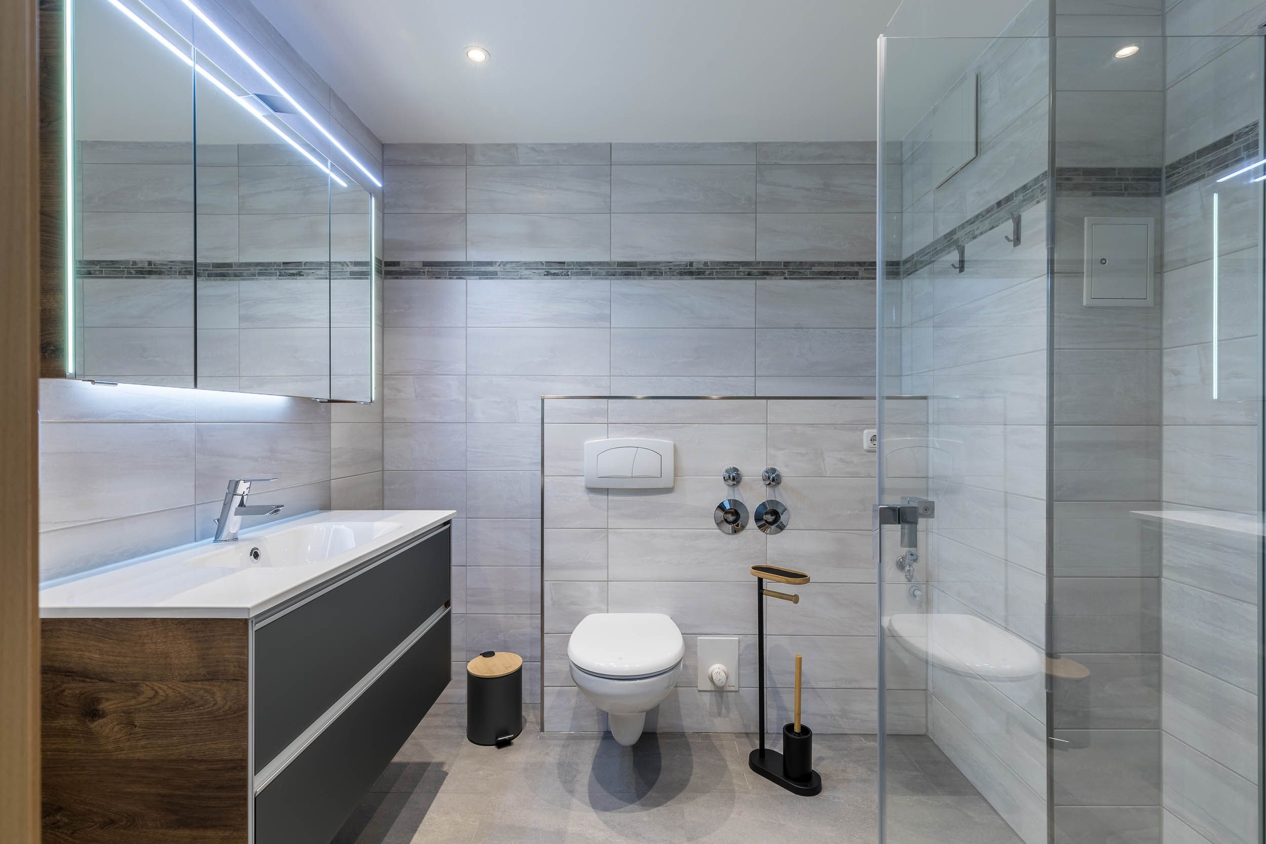 Ein modernes Duschbad mit Dusche und WC schließt sich an.