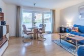 Der Wohnbereich ist mit einem großen Ecksofa, TV und einem Essbereich möbliert. Von hier aus und auch vom Schlafzimmer aus gelangen Sie direkt auf die große Westterrasse mit passenden Gartenmöbeln.
