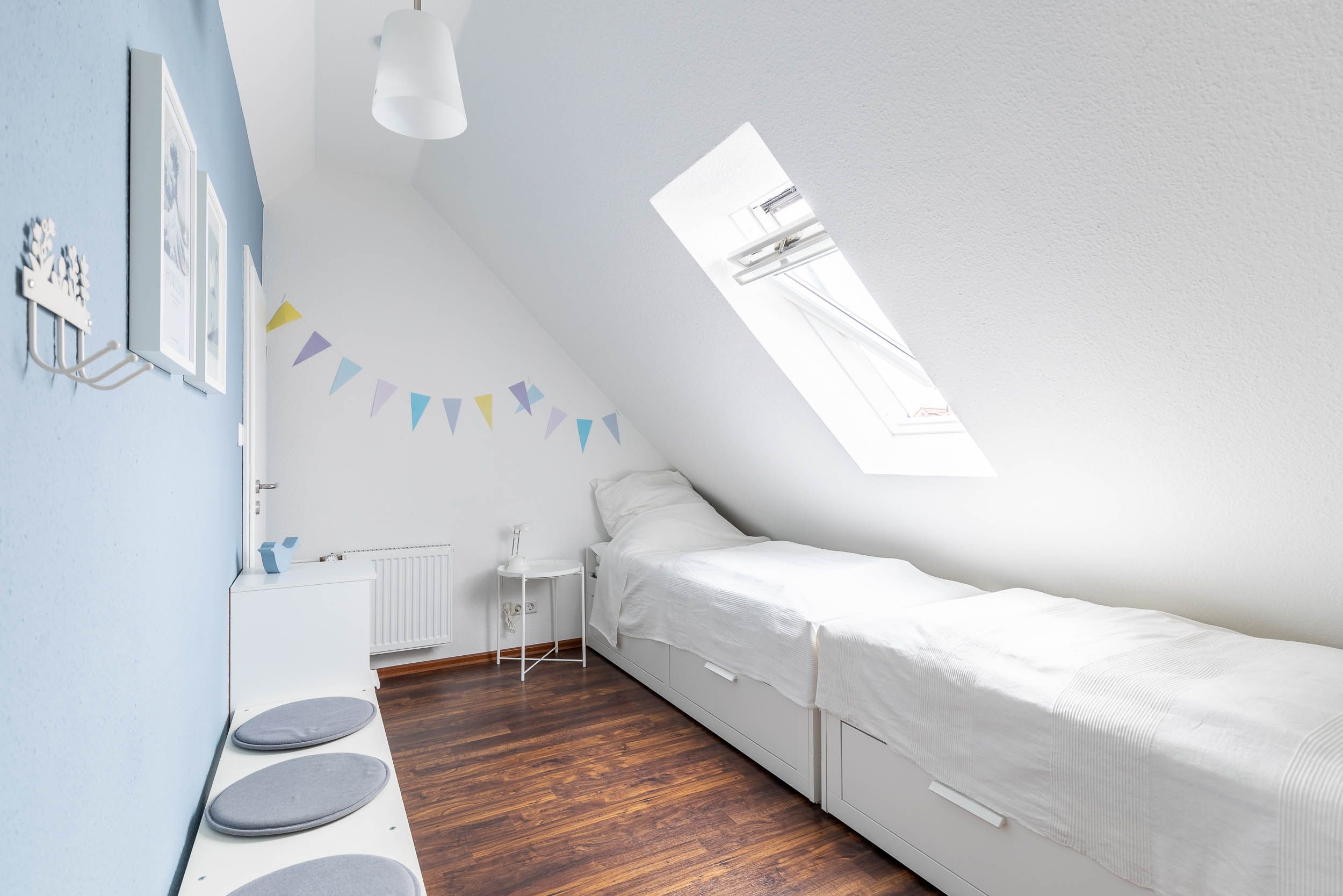 Im 2. Obergeschoss, das durch eine Holztreppe mit Geländer erreichbar ist, befindet sich ein weiteres Schlafzimmer mit zwei Einzelbetten (je 80 x 200cm). Die vorhandene Regalbank bietet die Möglichkeit, sich hier auch tagsüber aufzuhalten. Auf dem Galeriebereich davor steht ein großer Kleiderschrank mit passender Kommode.