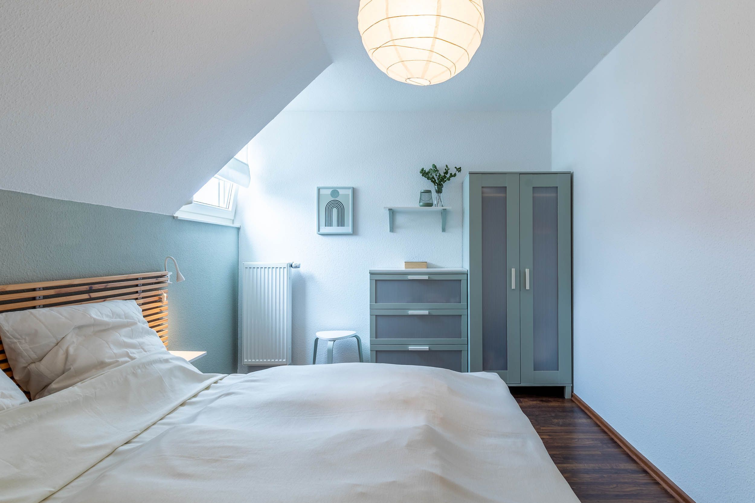Im 1. Obergeschoss befindet sich ein Schlafzimmer mit Doppelbett (zwei Boxspringmodule je 80 x 200cm), geräumigem Kleiderschrank, passender Kommode und ein TV mit ausschließlichen Zugang zu Streaming-Diensten. ( Netflix & Co. ).