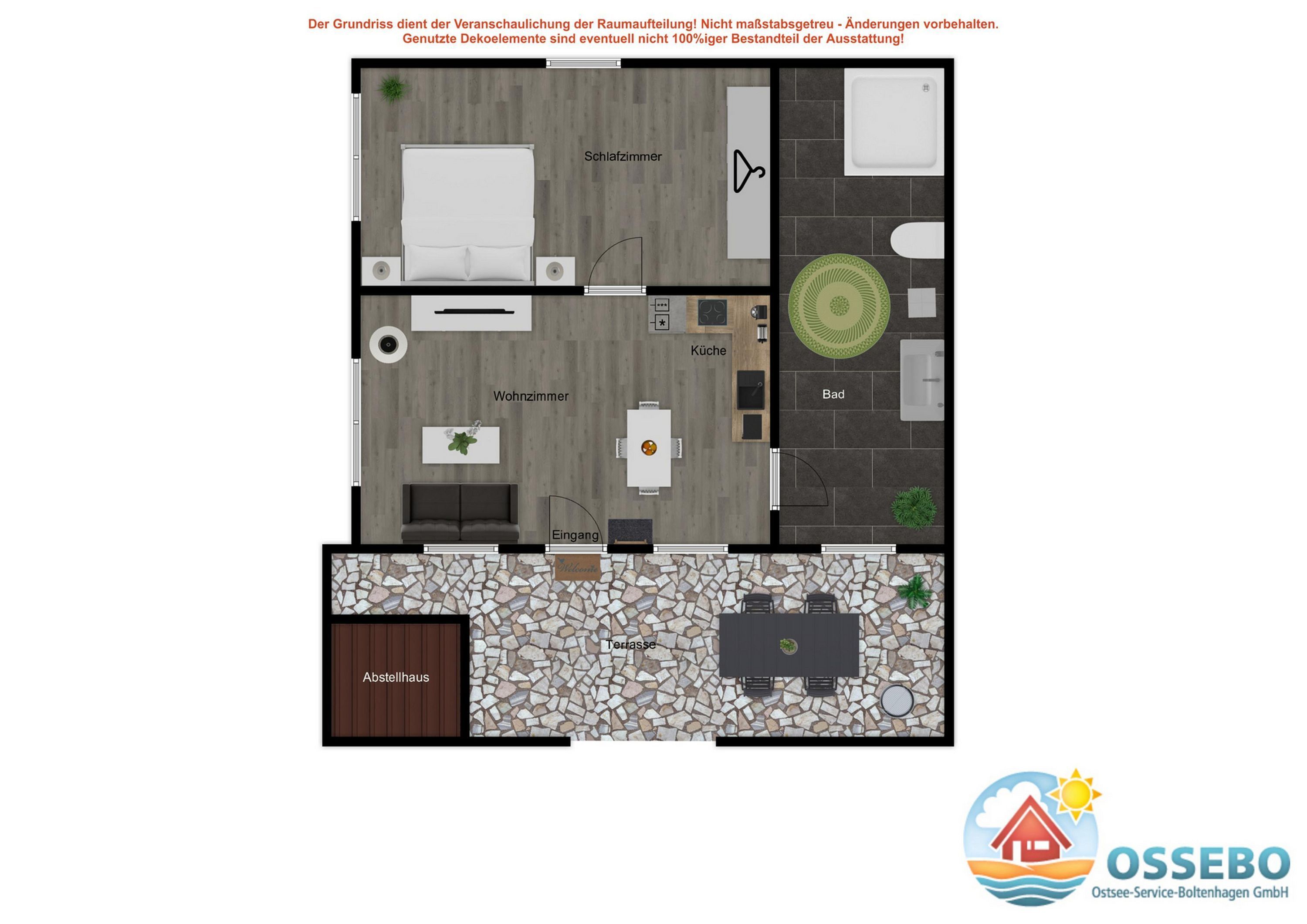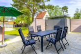 Auf der möblierten Terrasse können Sie die frische Ostseeluft genießen. Das große Rasengrundstück grenzt direkt an das Grundstück. Der Bungalow ist auch für Senioren geeignet, da er sich im Erdgeschoss befindet und einen komfortablen Zugang bietet. Der Strand ist nur 250 Meter entfernt und leicht zu Fuß erreichbar. Rauchen ist nur auf der Terrasse gestattet.