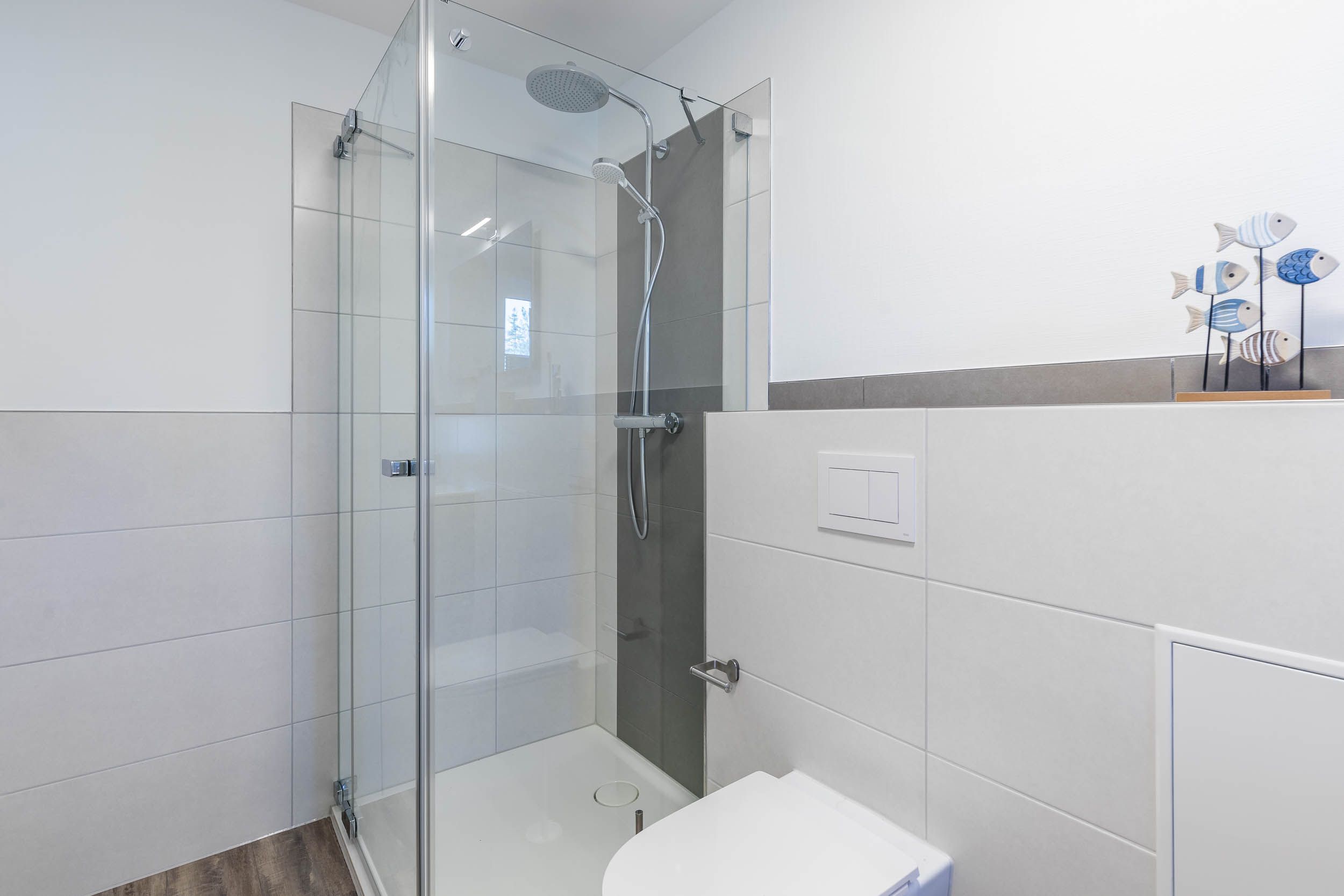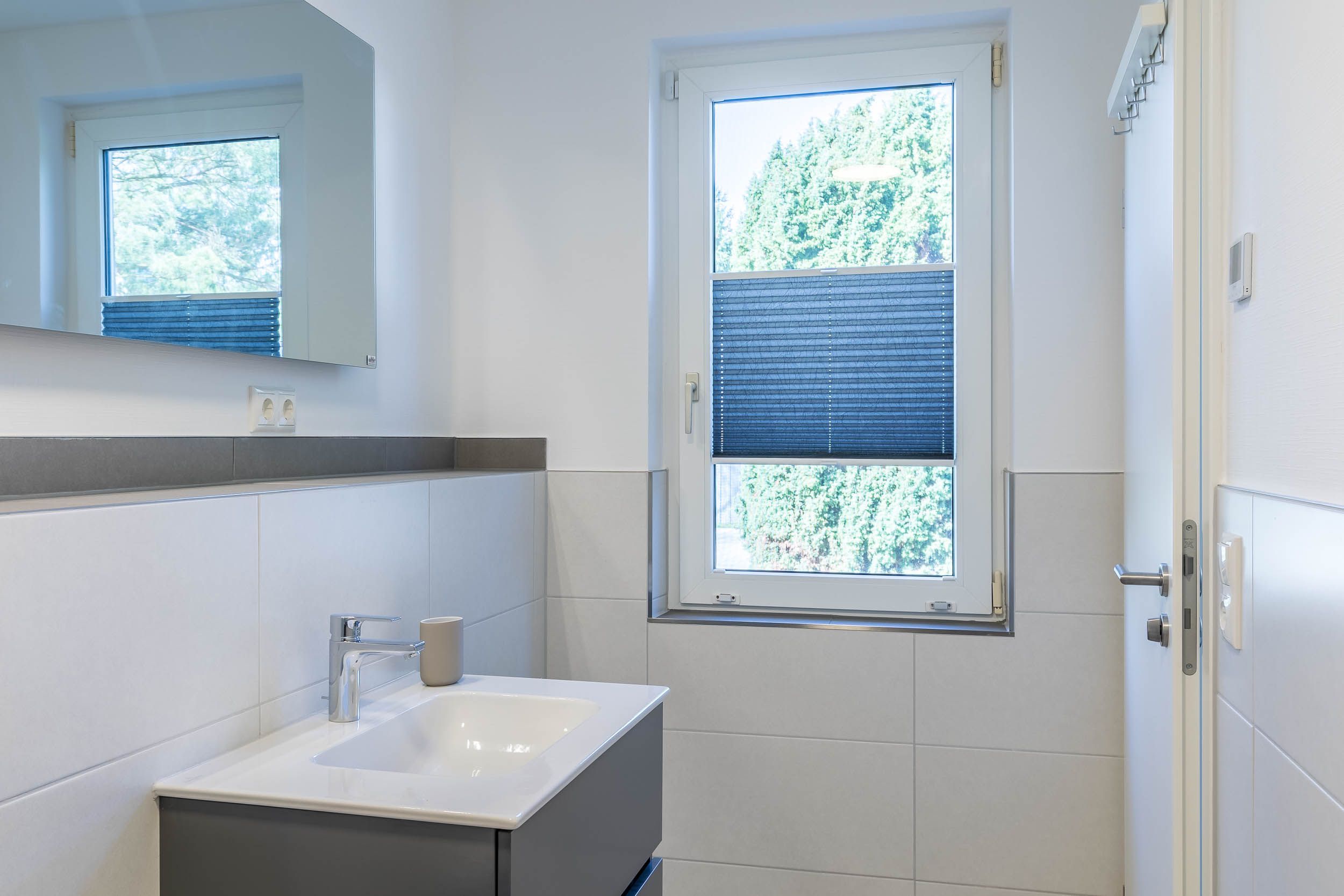 Das geflieste Badezimmer verfügt über eine bodentiefe Dusche, die nicht nur für Senioren geeignet ist. Ein kleines Fenster sorgt für Tageslicht und erleichtert das Lüften nach dem Duschen.
