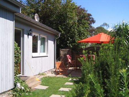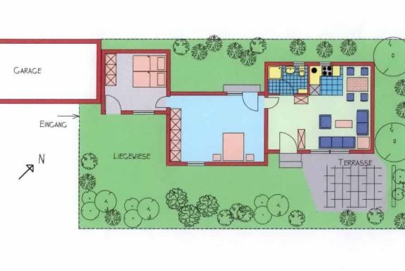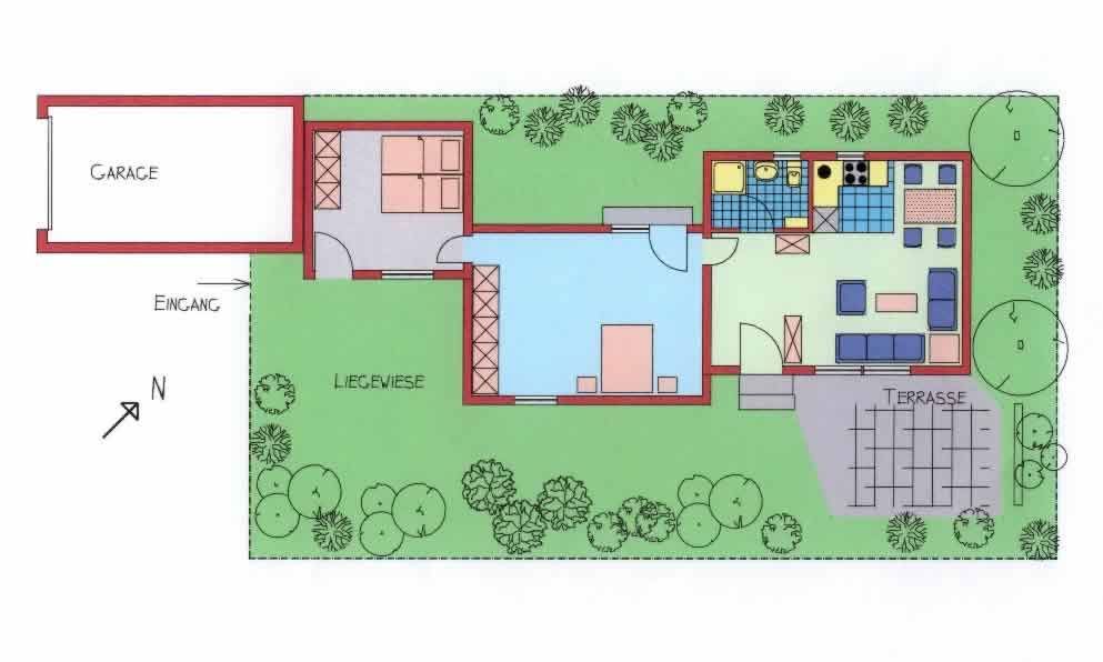 In windgeschützter Lage, direkt vor dem Wohnzimmer auf der Terrasse ist ein Sitzplatz eingerichtet und auf der Liegewiese können Sie schon ab morgens die Sonne genießen. Und wenn Sie einmal keine Lust haben zu kochen, ein Holzkohlegrill ist selbstverständlich vorhanden. Für Ihr Auto ist ebenfalls gesorgt, einStellplatz gehört dazu.