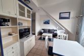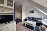 Das Wohnzimmer ist ausgestattet mit einer Schlafcouch, Sat-TV und integriertem Essbereich. Angrenzend ist eine Küchenzeile mit Kühlschrank und Gefrierfach, 2-Platten-Herd, Mikrowelle, Senseo- und Filter- Kaffemaschine, Wasserkocher u. Toaster.