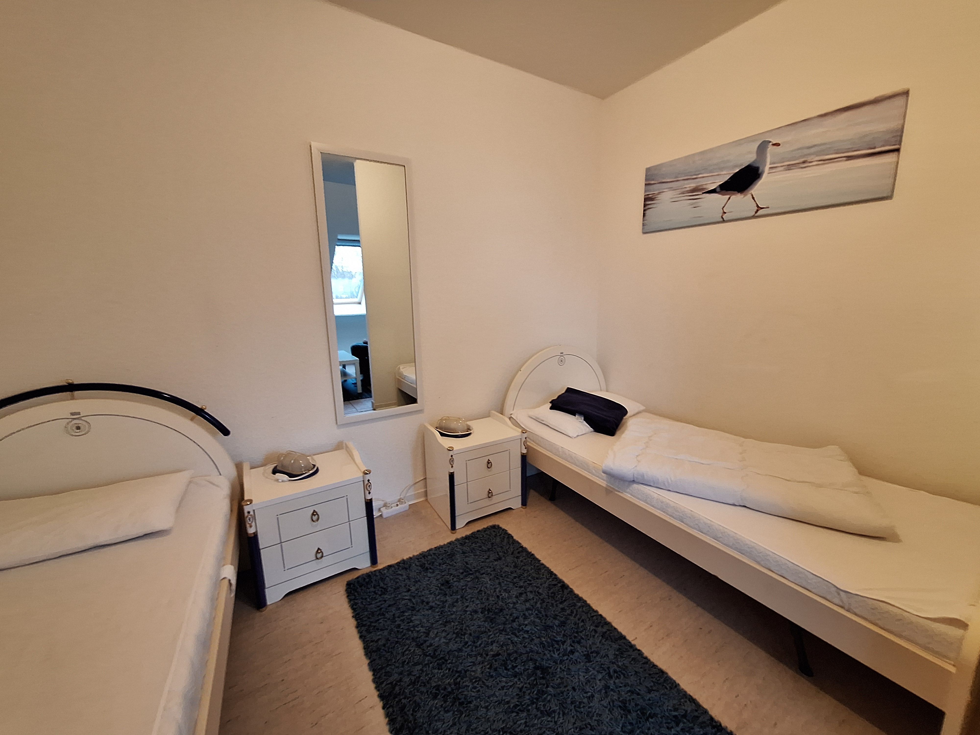 Das offene Schlafzimmer ist mit 2 Einzelbetten ausgestattet.