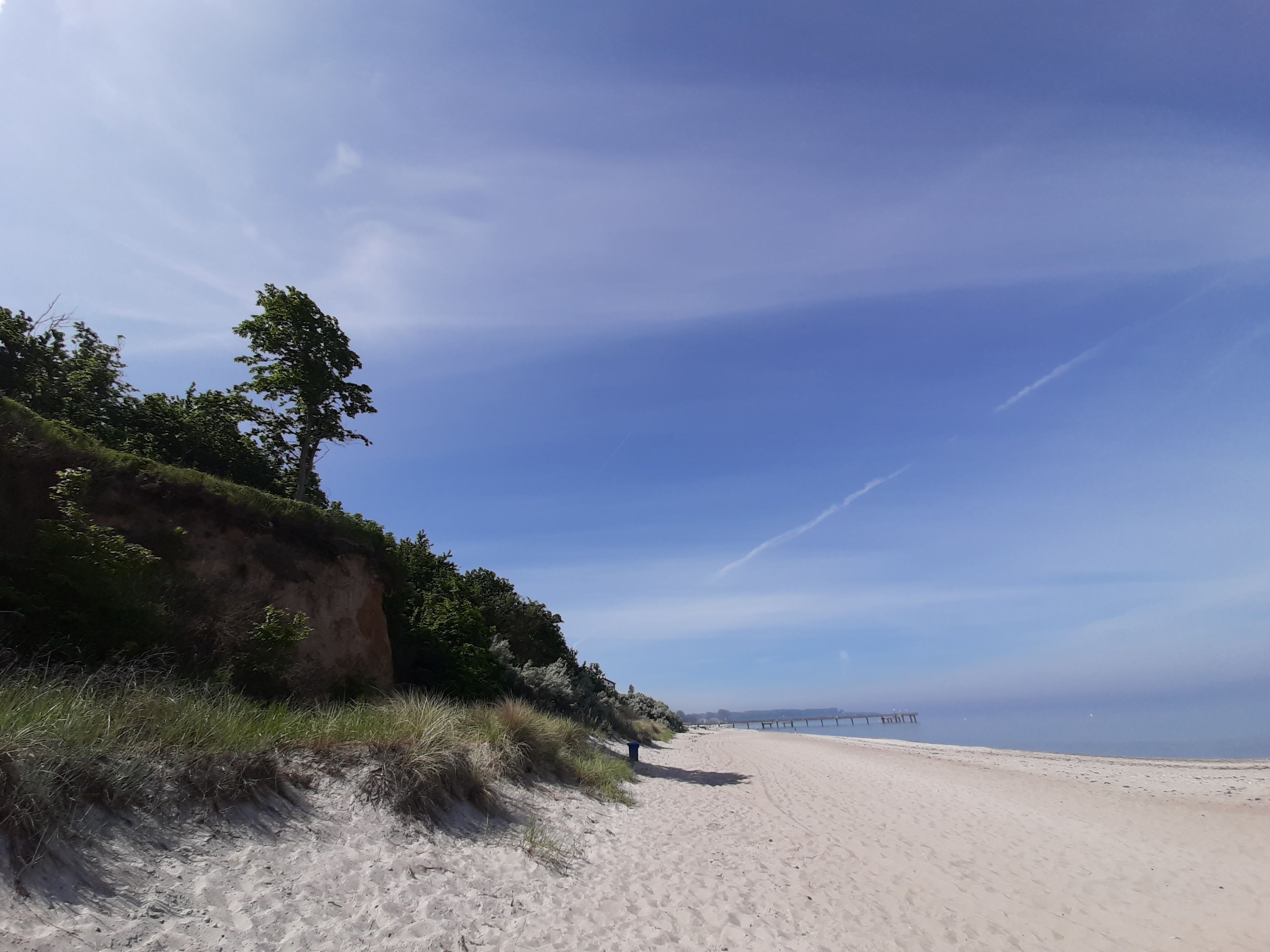 In 150 m Entfernung liegt der gepflegte Ostseestrand mit Strandkörben und einer Seebrücke.
