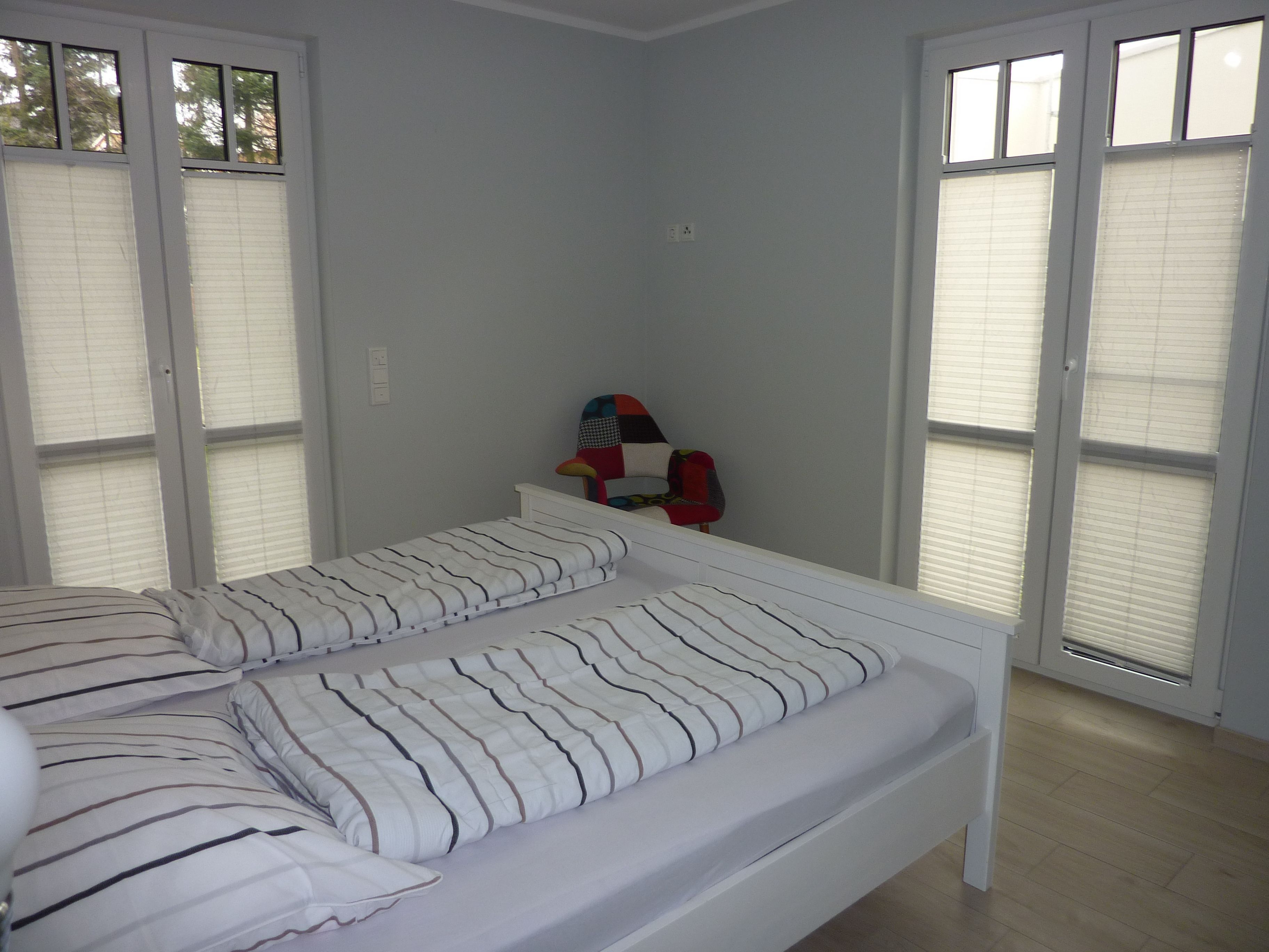 Unsere Ferienwohnung befindet sich im Edgeschoss. Sie verfügt über 2 separate Schlafzimmer. Ein Schlafzimmer mit Doppelbett und das zweite Schlafzimmer mit zwei Einzelbetten normaler Größe und verstellbarer Lattenroste. Als Verdunklungsmöglichkeiten dienen Ihnen Plissees und Außenrolläden. Das Kinderschlafzimmer verfügt über einen Fernseher. Das Elternschlafzimmer nicht.