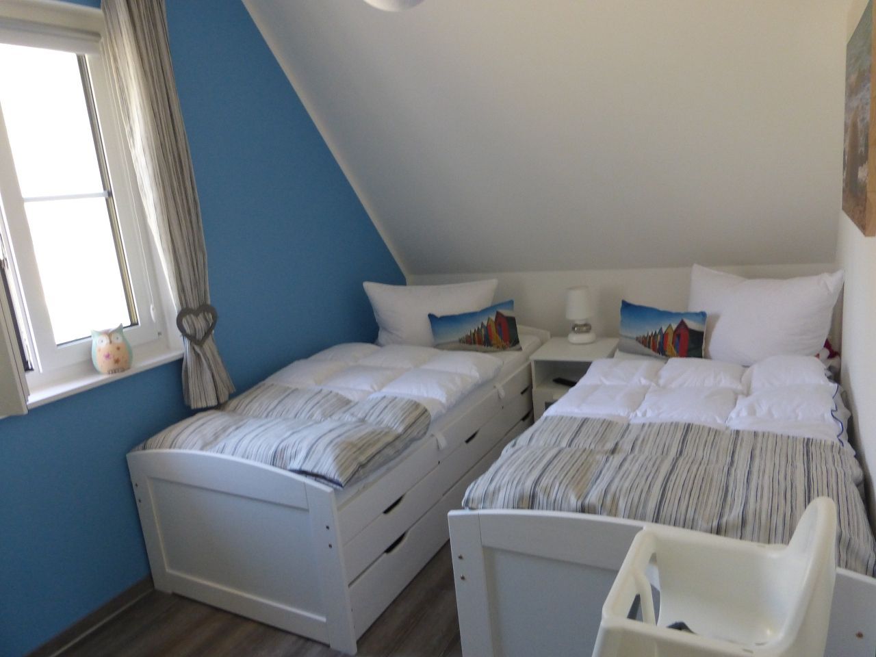 Oben befinden sich drei Schlafzimmer. Zwei davon sind mit Doppelbetten, das Dritte mit zwei Einzelbetten ausgestattet. Alle drei Schlafzimmer verfügen über ein Sat-TV Gerät und ausreichend Staumöglichkeiten. Ein Kinderreisebett für kleine Gäste bis drei Jahre kann auf Wunsch zur Verfügung gestellt werden. Das Bad bietet eine ebenerdige Dusche, Doppelwaschtisch und Eckbadewanne. Alle Bade- und Schlafzimmer sind mit Insektenschutz versehen. Zusätzlich steht Ihnen in beiden Bädern ein Radio, sowie ein Föhn zur Verfügung.