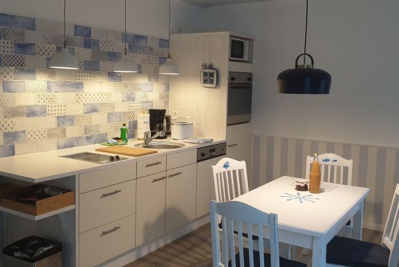 Voll ausgestattete Küche mit kleinem Ceran-Kochfeld, Backofen, Geschirrspüler, Kühlschrank, sowie Filter-Kaffeemaschine. Elektrischer Wasserkocher, Toaster und Microwelle sind selbstverständlich.