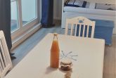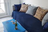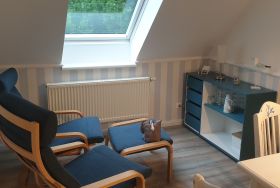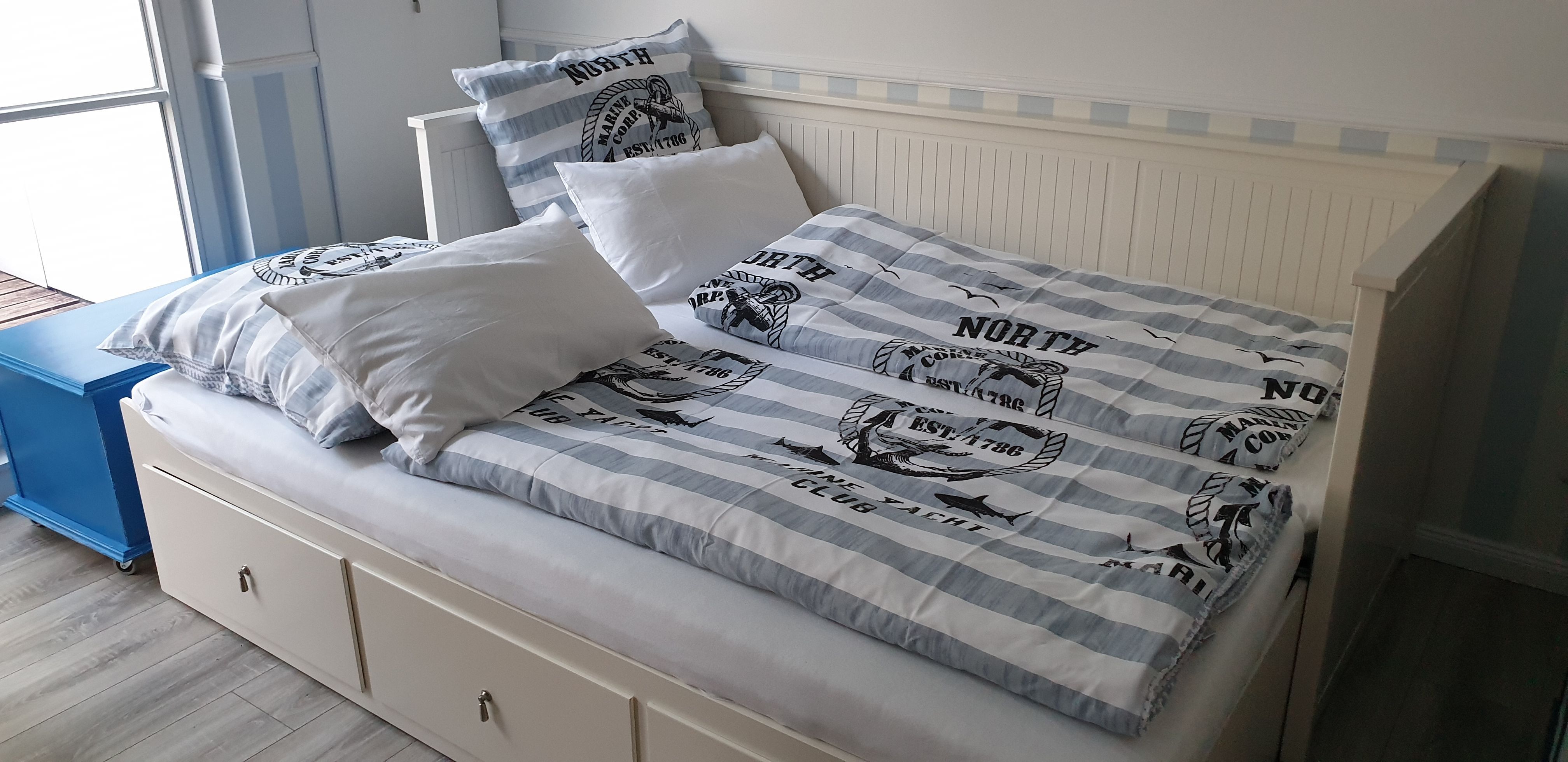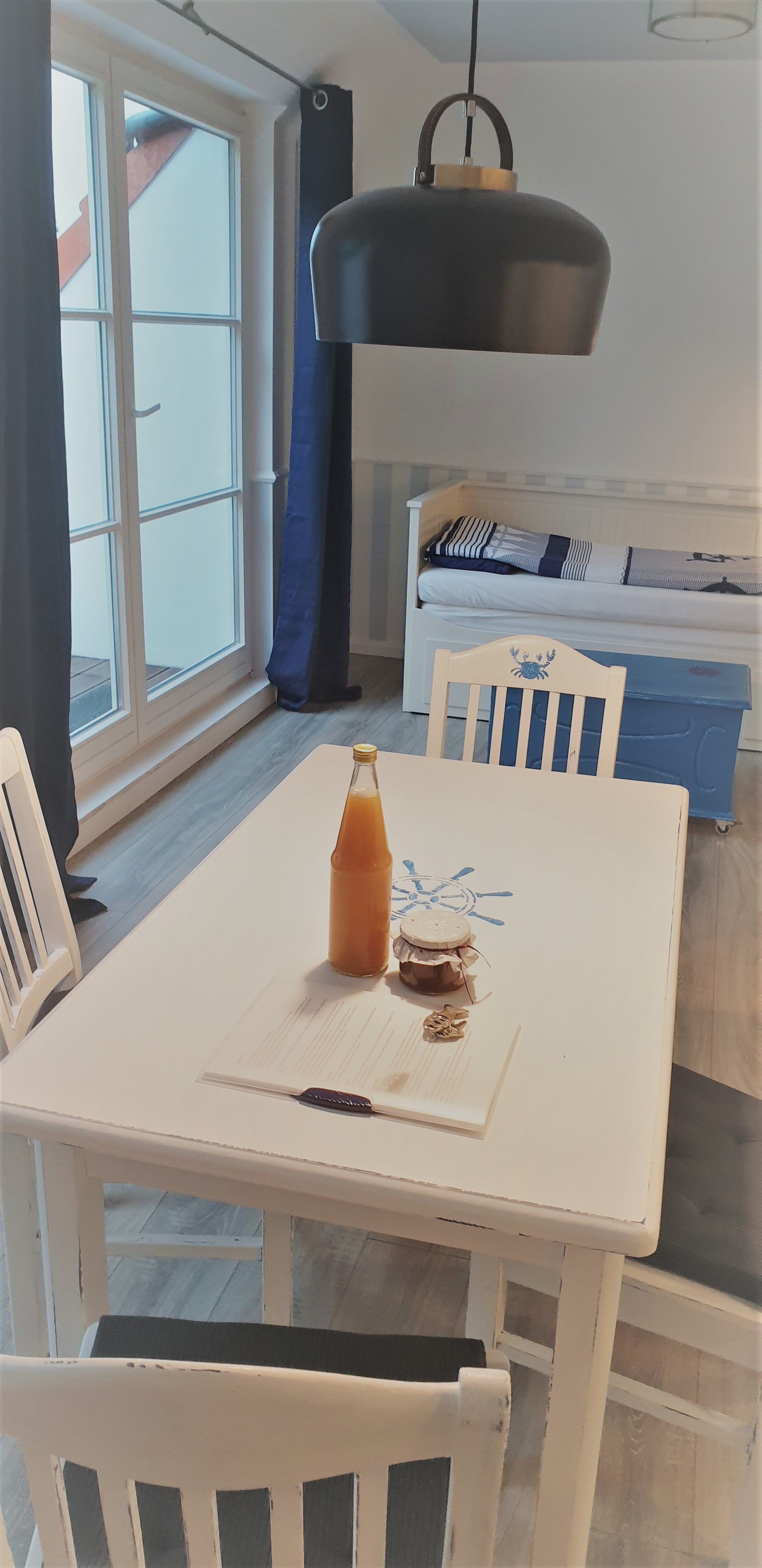 Sie erwartet eine geschmackvolle, maritime Einrichtung und eine Ausstattung, die kaum Wünsche offen lässt. Ein heller Wohnbereich mit Tagesbett/-Sofa und großem Essbereich.