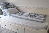 Ein Schlafzimmer mit Doppelbett 180x200 cm und Kleiderschrank. Im Wohnbereich ein Tagesbett mit 2x80x200 cm, Einbauschrank und Kommode.