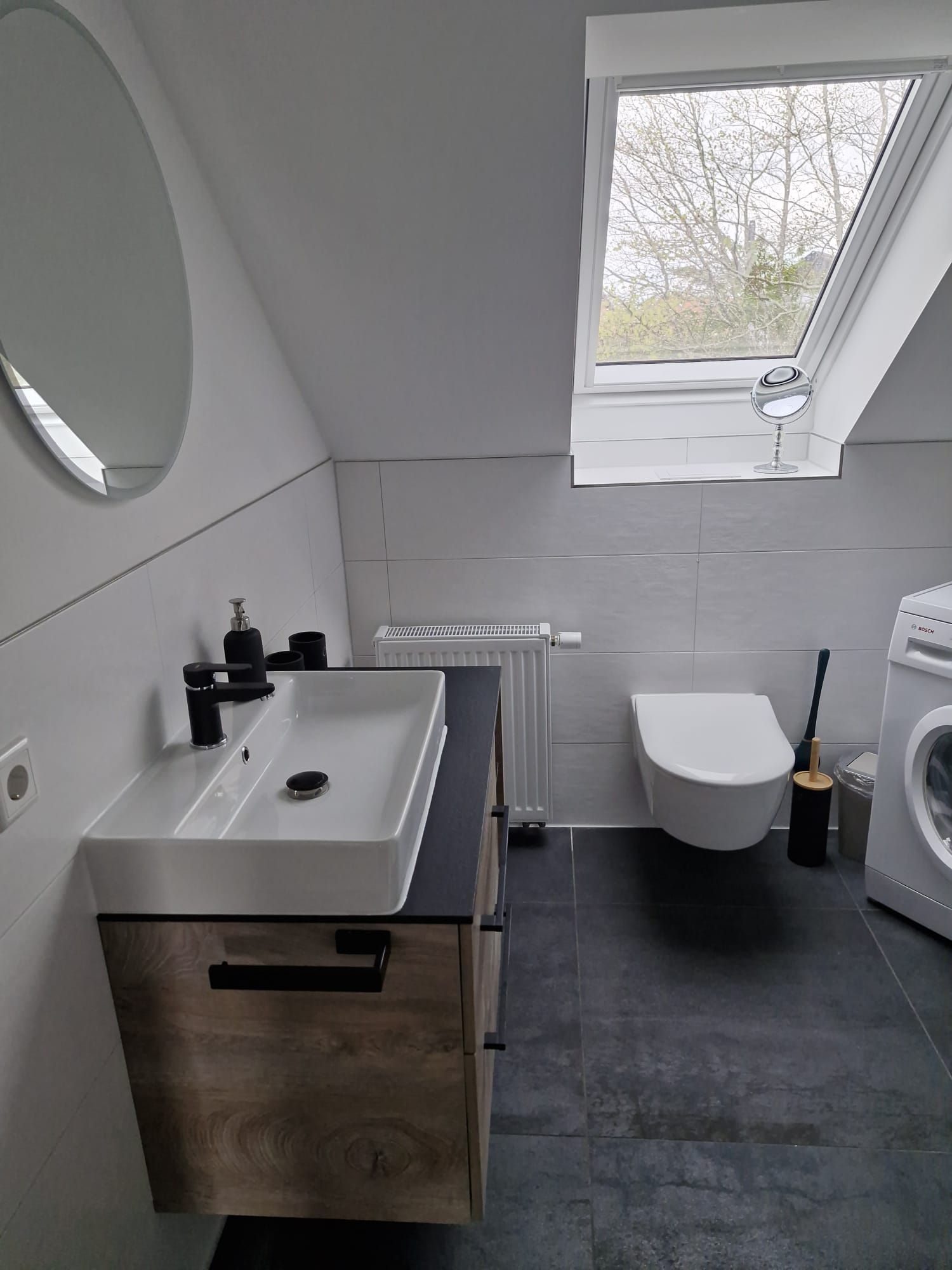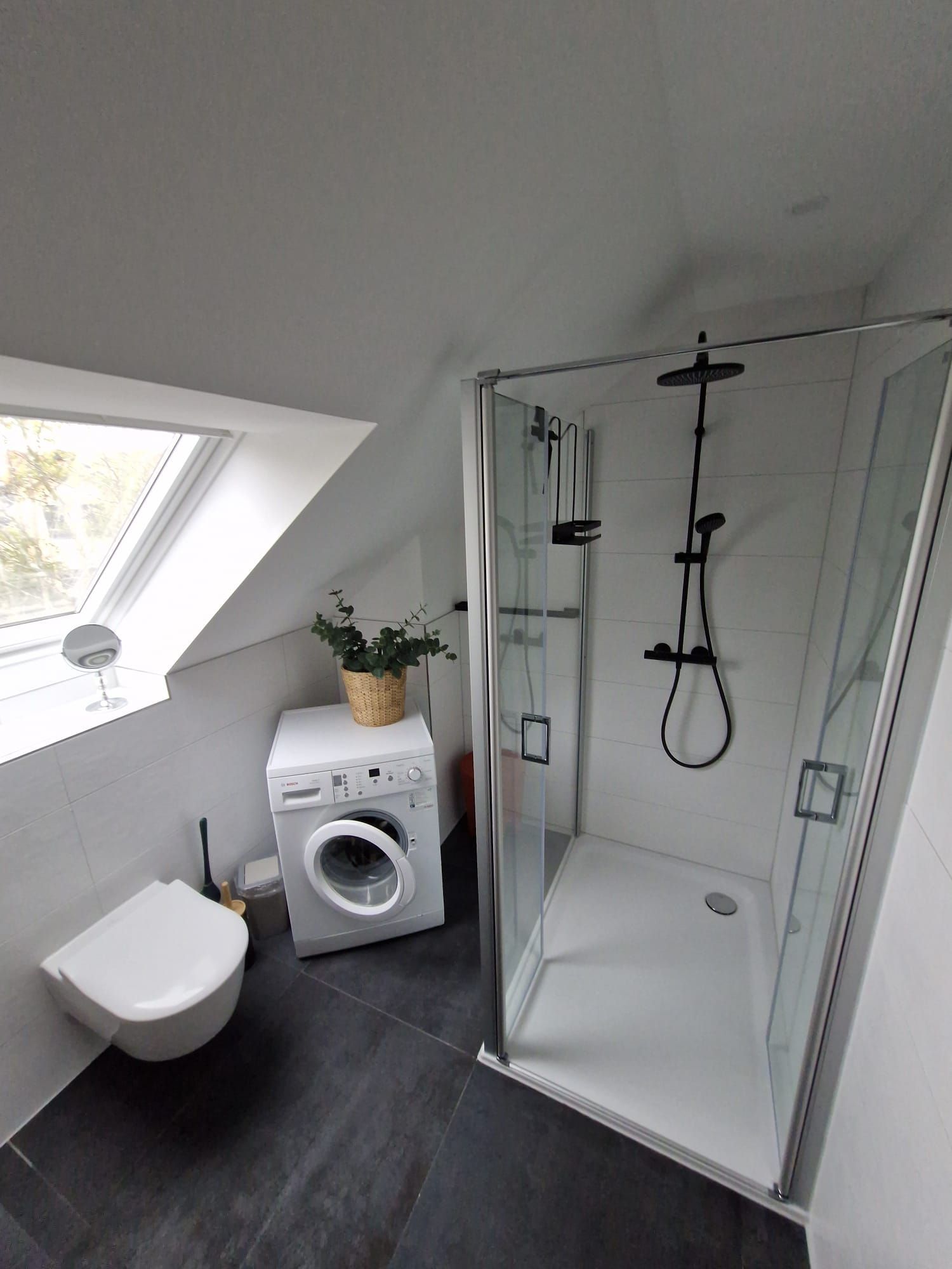 Dort finden sie auch das Badezimmer mit Dusche und WC sowie einer Waschmaschine.