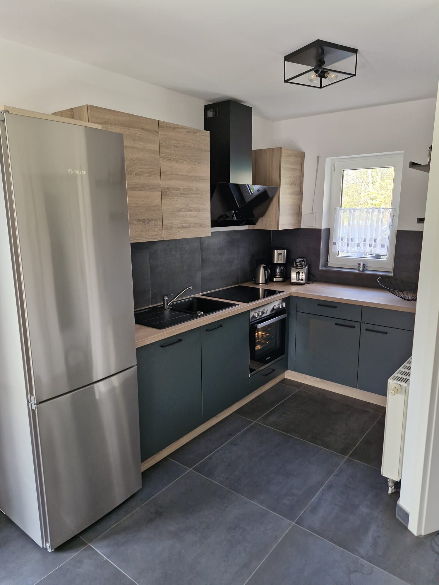 Daran angegliedert ist die komplett ausgestattete Küche mit großer Kühl- Gefrierkombination, Cerankochfeld mit Backofen, Geschirrspüler, Kaffeemasche, Wasserkocher, Toaster und vielem mehr.