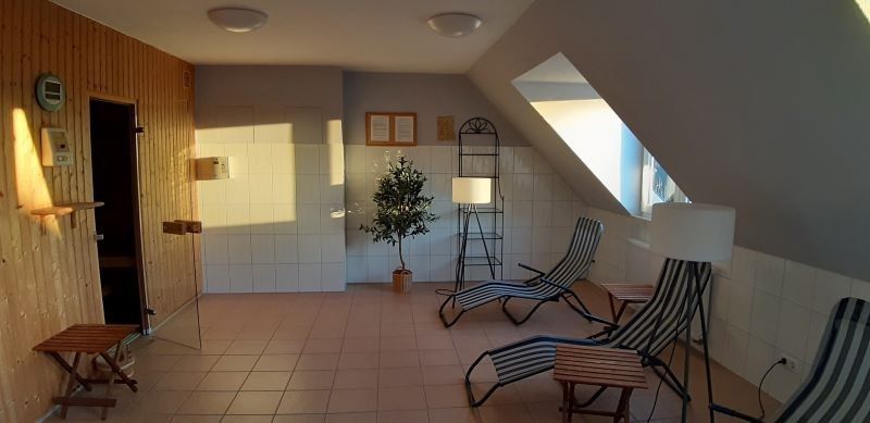 Auf der gleichen Etage befindet sich eine Sauna mit Ruhebereich. Diese sowie die Waschmaschine u. der Trockner im Keller sind im Münzbetrieb nutzbar.