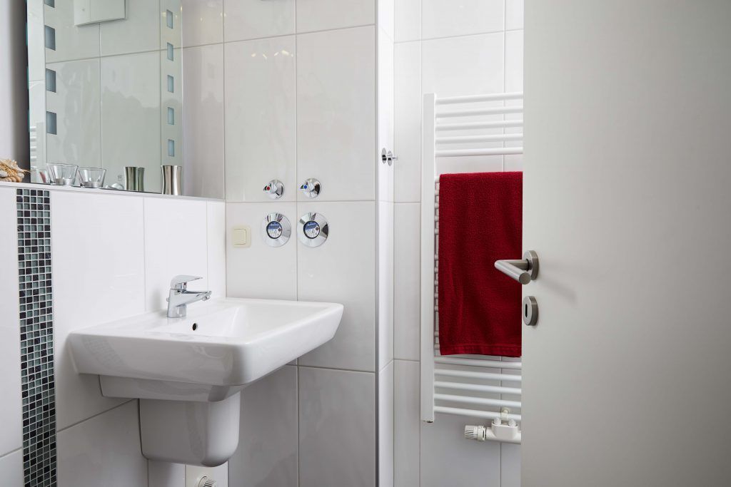 Das Badezimmer verfügt über eine ebenerdige Dusche (160 x 90 cm) und Fußbodenheizung. Ein Schlafzimmer ist mit einem Doppelbett (180 x 200) und 32'' LED-Flachbildschirm ausgestattet. Im zweiten Schlafzimmer sind zwei Einzelbetten (80 x 190) und ein kleiner Kleiderschrank vorhanden. Babybett und Hochstuhl stehen bei Bedarf kostenlos zur Verfügung.
