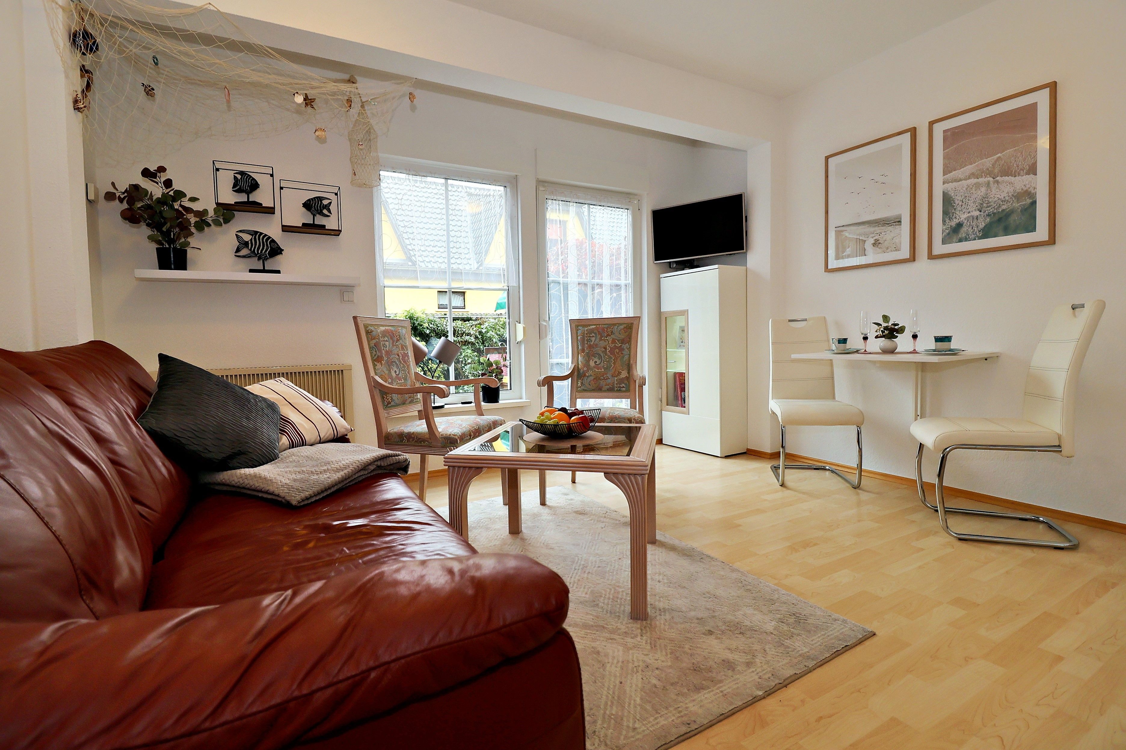 Die Ferienwohnung verfügt über ein Wohnzimmer mit offenem Küchen- und Essbereich, ein separates Schlafzimmer und ein Duschbad.