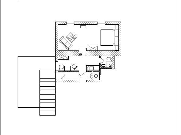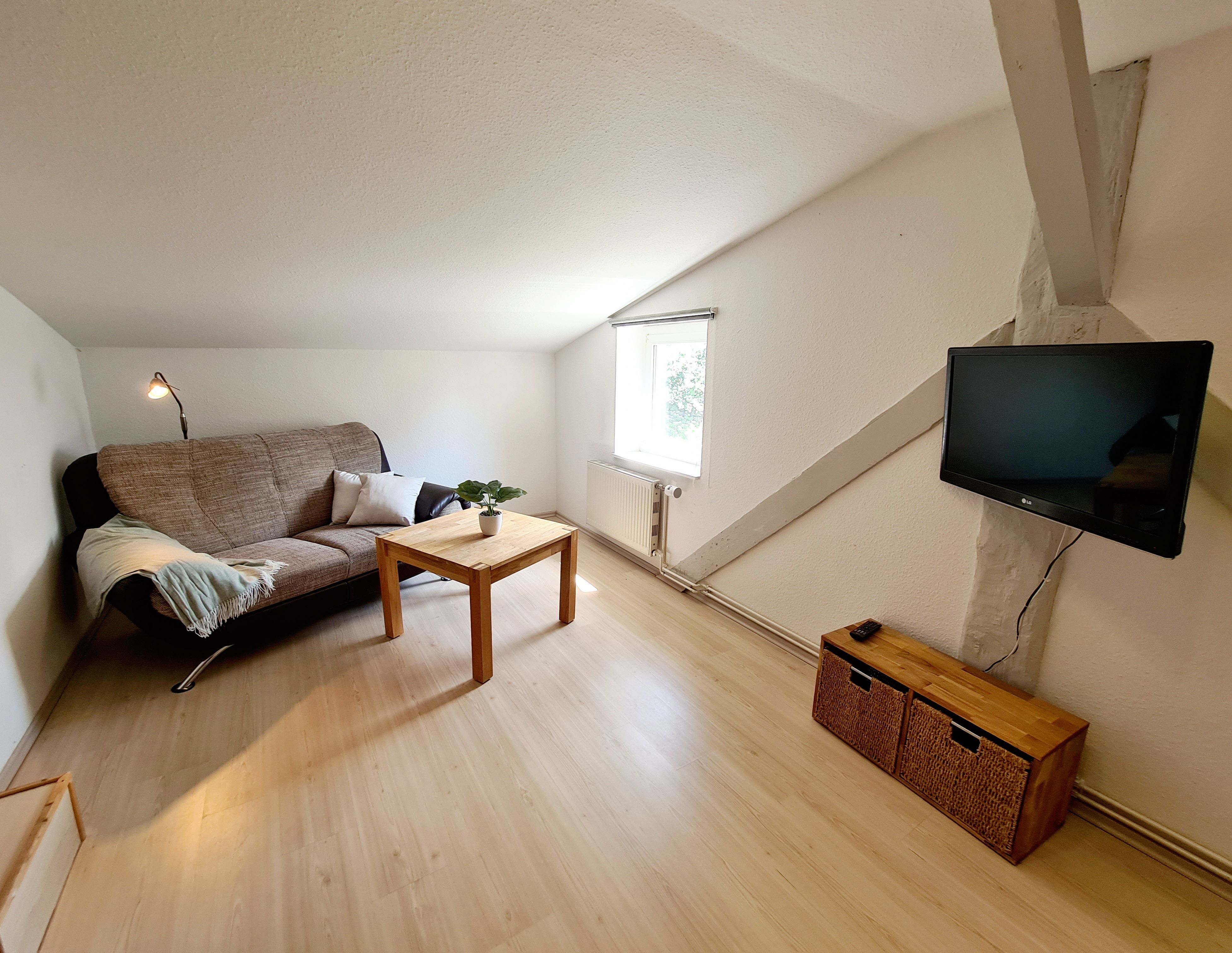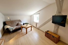 Das Wohnzimmer ist mit einer gemütlichen Sitzecke und einem SAT-TV ausgestattet und ermöglicht dementsprechend das Entspannen in der Wohnung. Das Doppelbett bildet zusammen mit einem Schrank den Schlafbereich. Die kleine Pantry- Küche verfügt über einen 2-Plattenherd, Kaffeemaschine, Wasserkocher und Kühlschrank. Das Badezimmer ist mit einer Dusche, einem WC und einem Bidet ausgestattet. WLAN ist vorhanden. Der kostenfreie Parkplatz befindet sich am Haus.