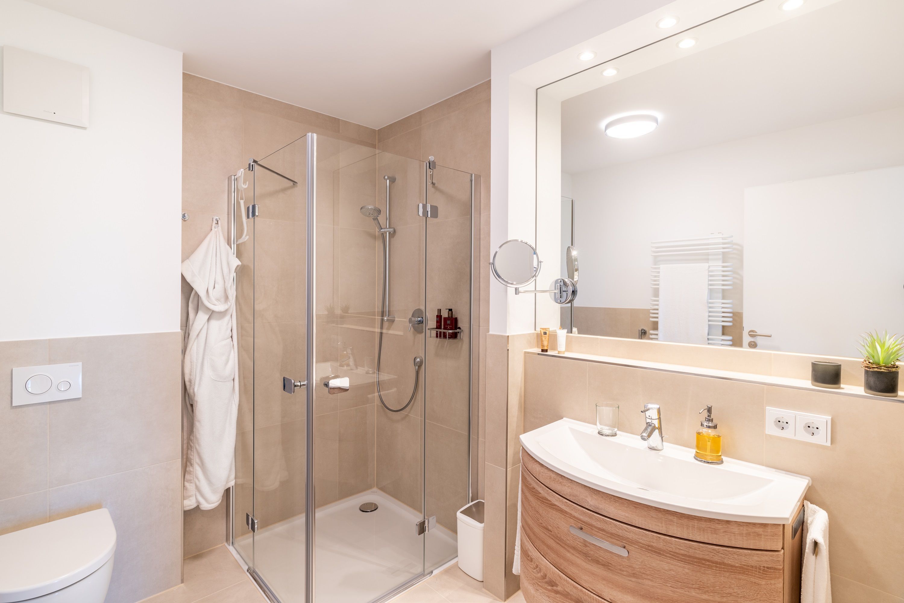 Im zweiten, voll ausgestatteten Badezimmer steht Ihnen eine großzügige Ganzglas-Duschkabine mit den Maßen 90 x 90 cm zur Verfügung.