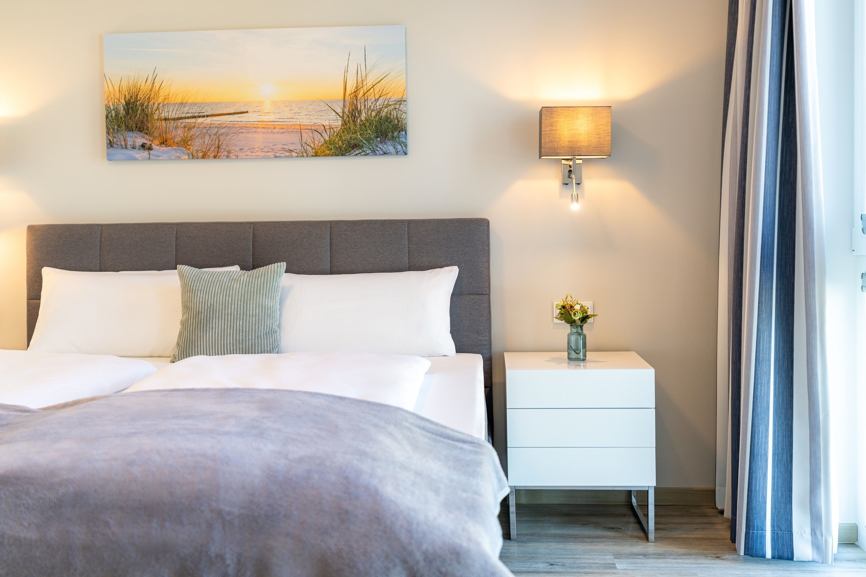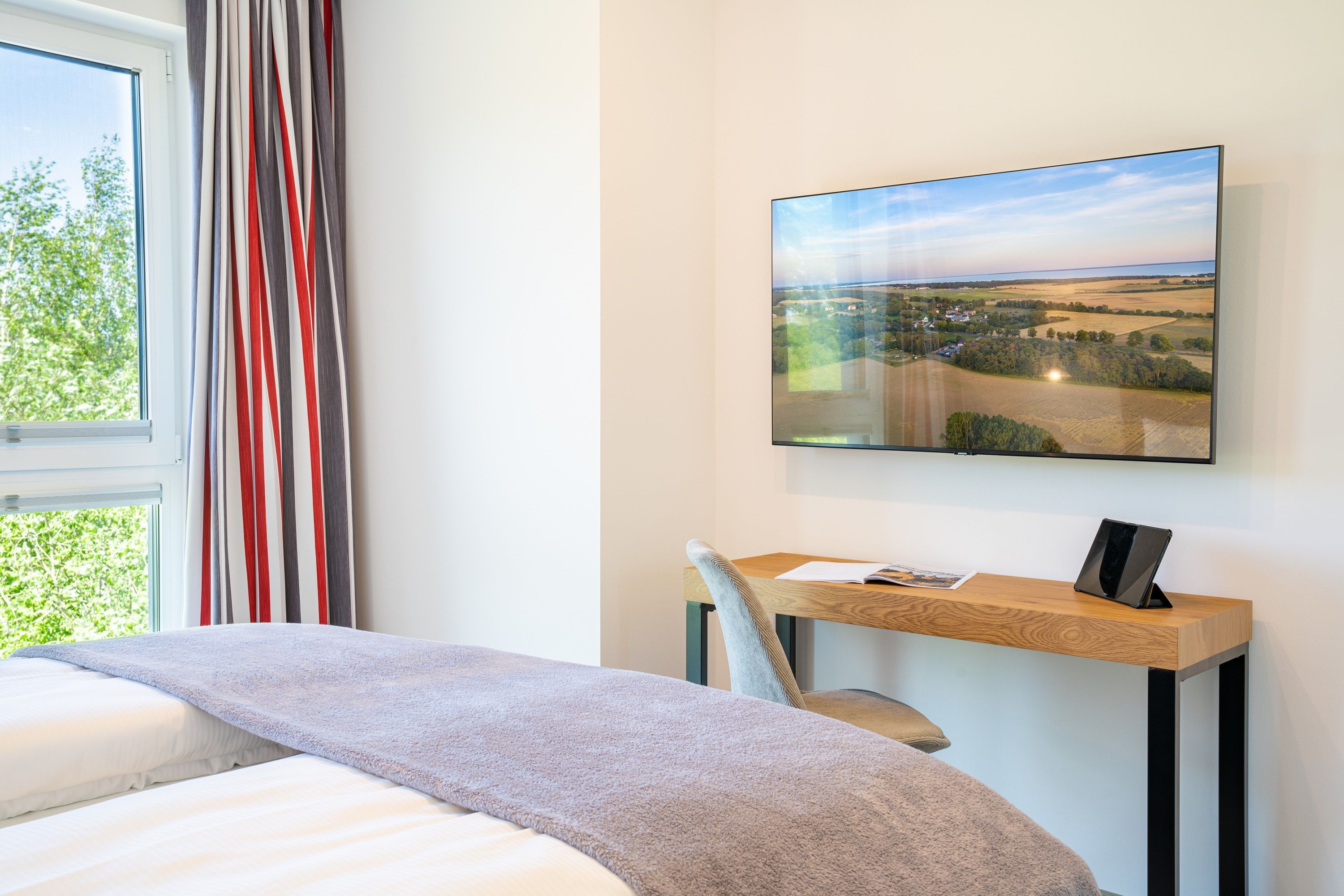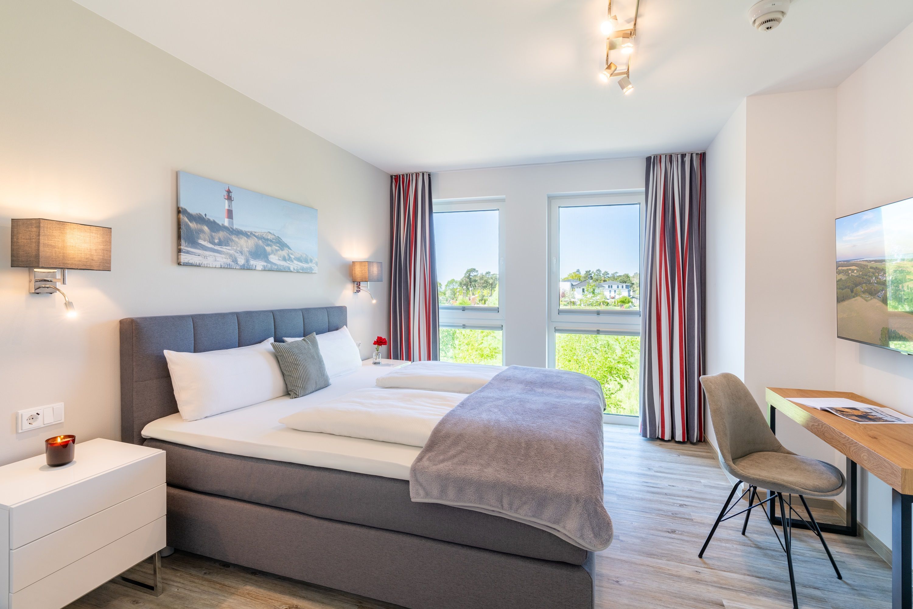 Im zweiten Schlafzimmer finden Sie ebenfalls ein komfortables Boxspringbett (180 x 200 cm), einen Kleiderschrank, einen Schreibtisch und einen Smart-TV vor.