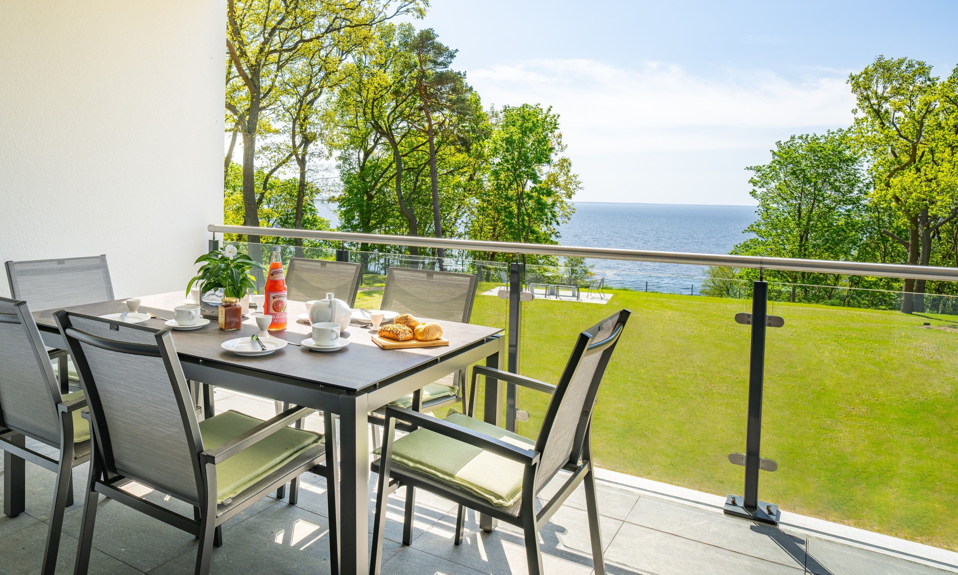 Freuen Sie sich auf den atemberaubenden Meerblick auf das Stettiner Haff vom 18 m² großen, überdachten Sonnenbalkon, der schnell Ihr Lieblingsplatz in diesem Ferienapartment wird.