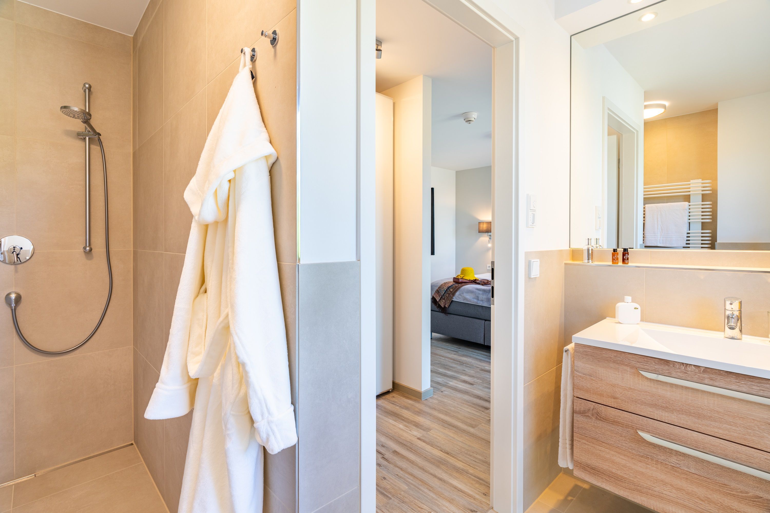 Das Hauptschlafzimmer bietet ein hochwertiges Boxspringbett (180 x 200 cm), einen Kleiderschrank sowie einen Smart-TV. Das en suite Badezimmer mit begehbarer Dusche rundet den Komfort ab.
