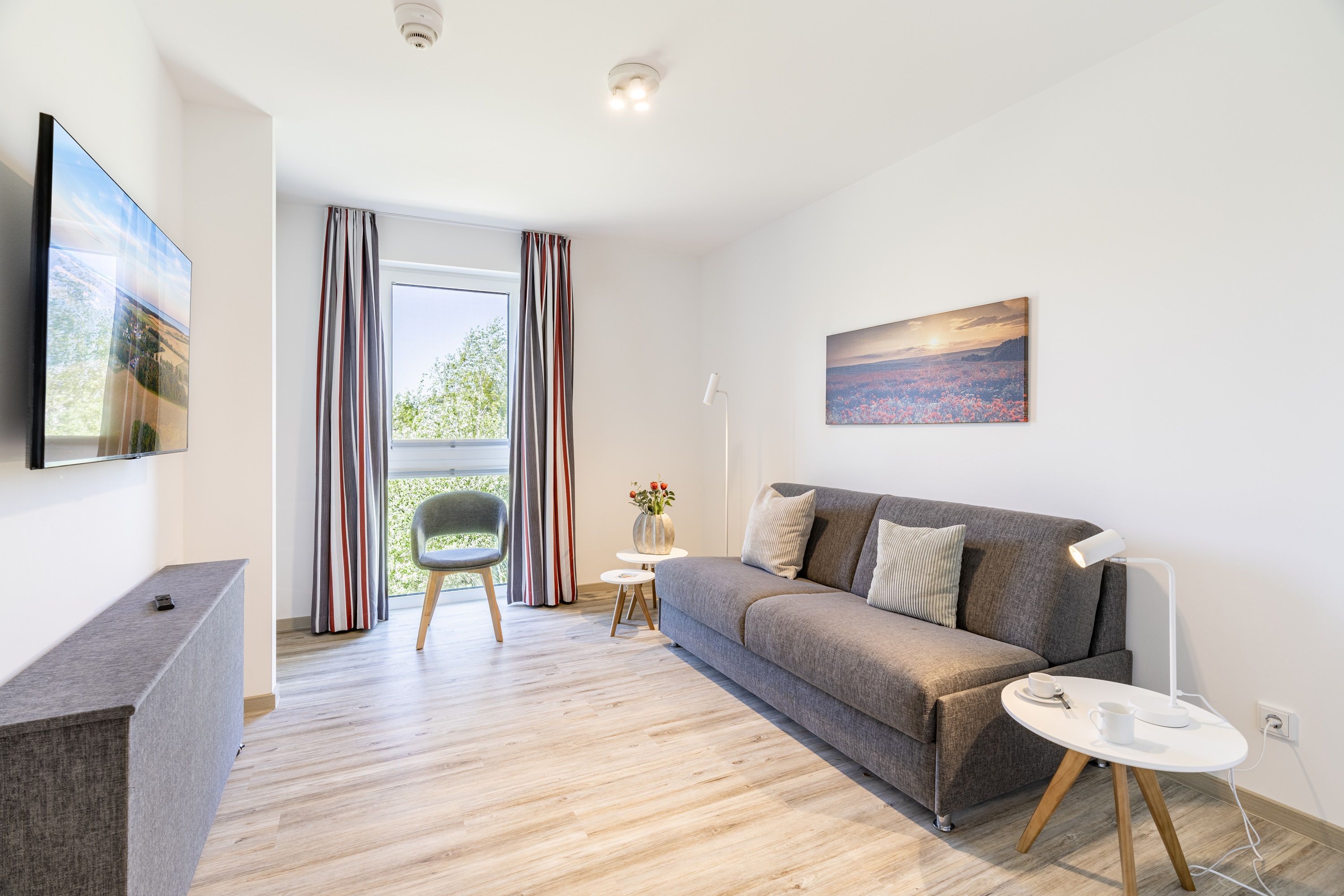 Ihre Gäste oder Kinder finden im dritten Schlafzimmer auf dem äußerst komfortablen Schlafsofa mit Lattenrost und Bultex-Matratze (160 x 200 cm) erholsamen Schlaf. Auch dieses Zimmer ist mit einem Kleiderschrank und einem Smart-TV ausgestattet.