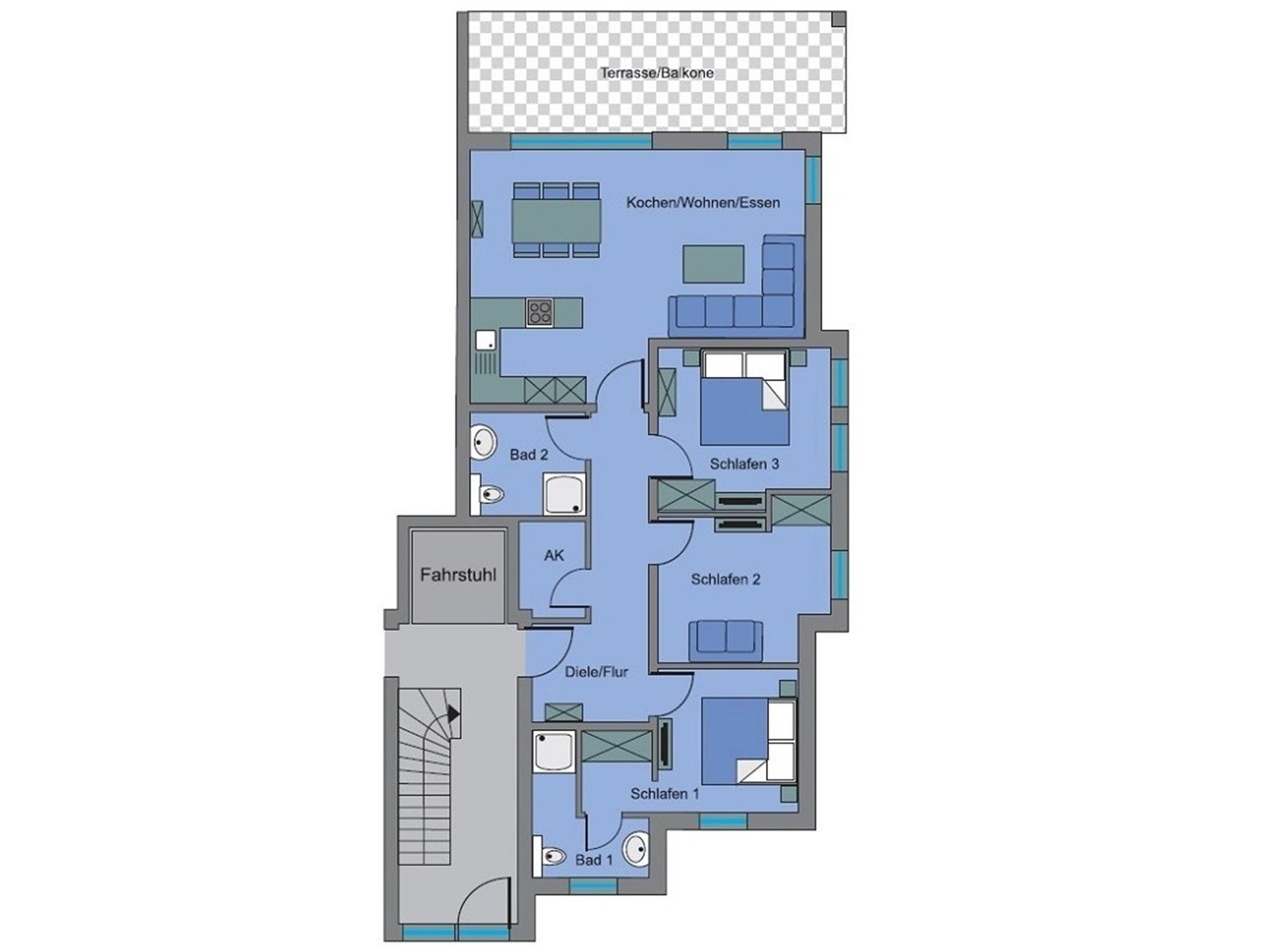 Die barrierefreie und sonnendurchflutete 4-Zimmer-Ferienwohnung liegt im ersten Obergeschoss des 8-Parteienhauses. Ein Aufzug ist vorhanden, der jede Etage anfährt.