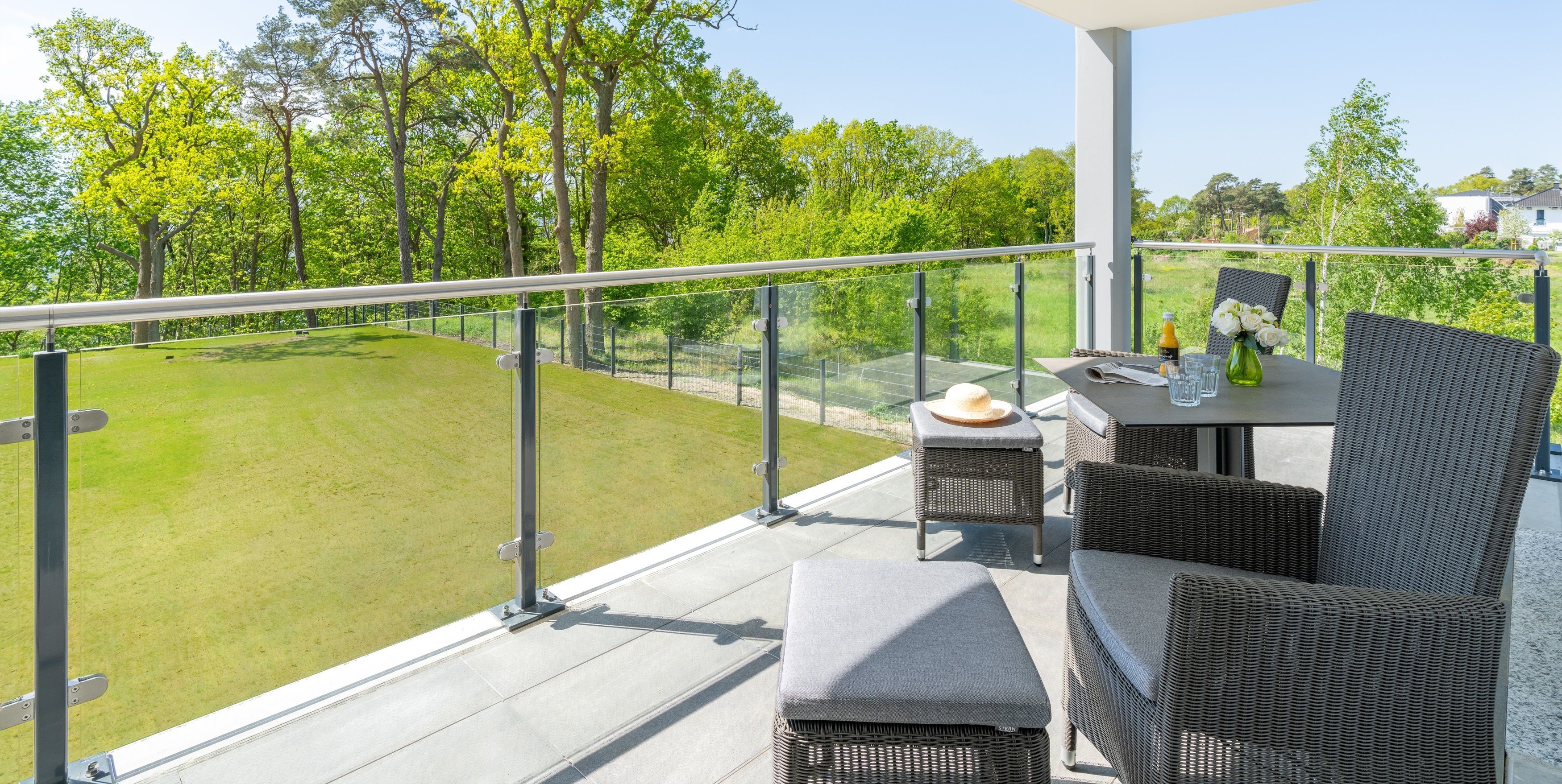 Alle Terrassenwohnungen und Apartments sind hochwertig und modern ausgestattet. Eine weitläufige Außenanlage mit einer gepflegten Rasenfläche und Gehweg zur traumhaften Haff-Terrasse umgeben unser 2024 fertiggestelltes Ferienhaus, das im Gegensatz zu allen anderen Oase am Haff-Häusern auf einem separaten Grundstück, ca. 400 Meter östlich der weiteren Gebäude, liegt. Die gemeinschaftlich nutzbare Haff-Terrasse lädt mit Sitzgelegenheiten an der Steilküste zum Verweilen ein.
