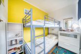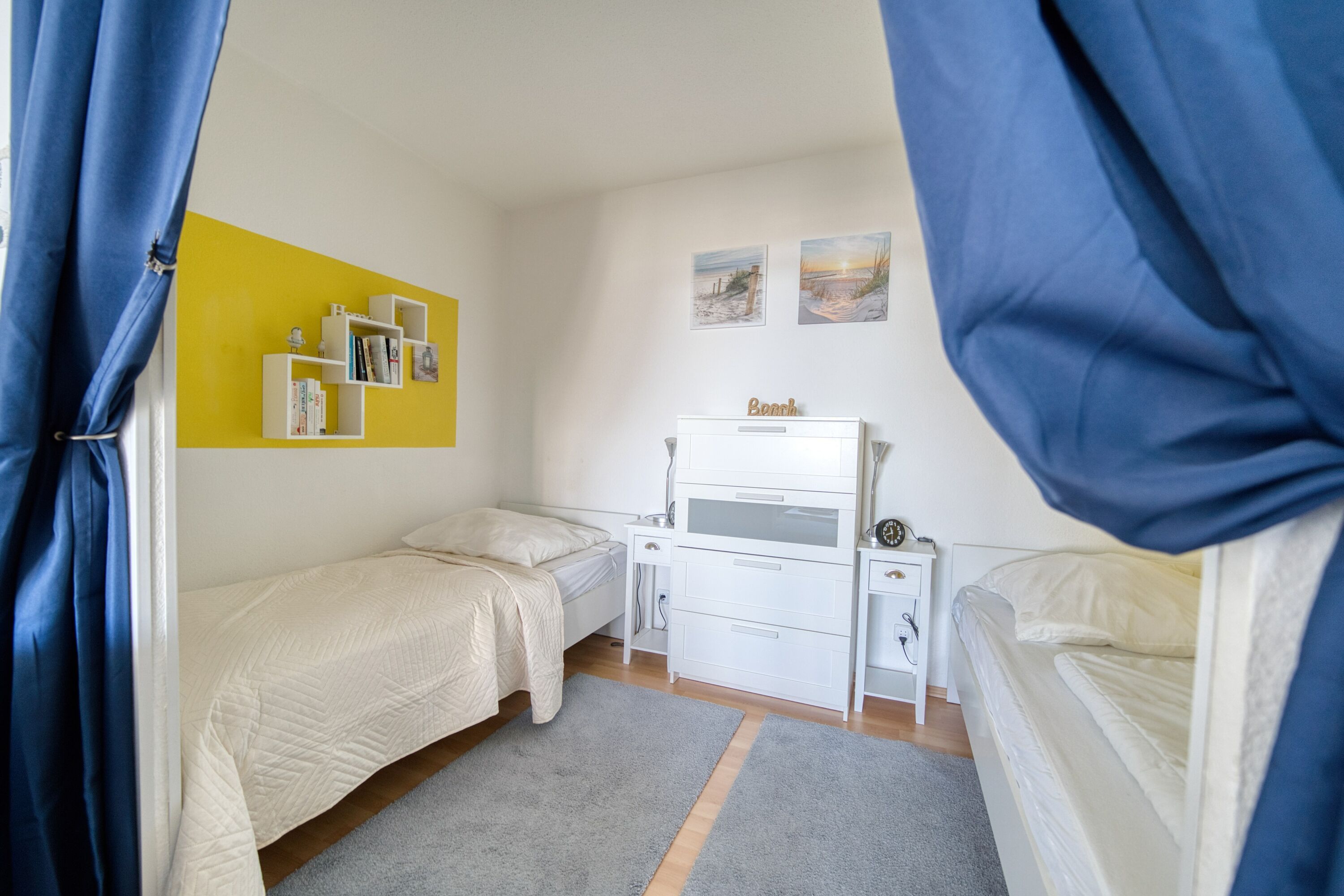 Die Wohnung bietet auf 45 m² einen abgetrennten Elternschlafbereich, ein Wohnzimmer mit Schlafcouch, ein Kinderzimmer mit Etagenbett, Küche, Bad und den Flur.