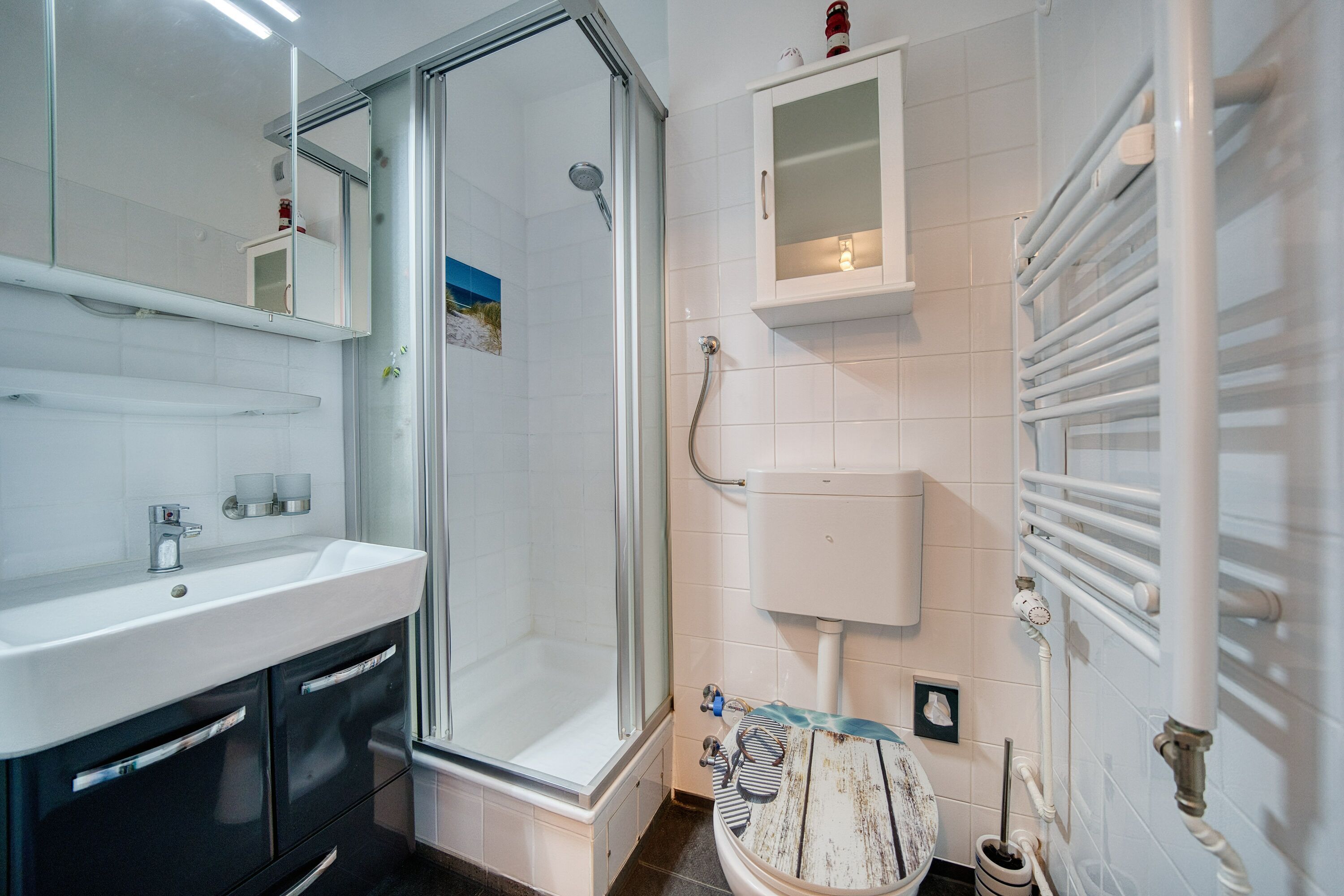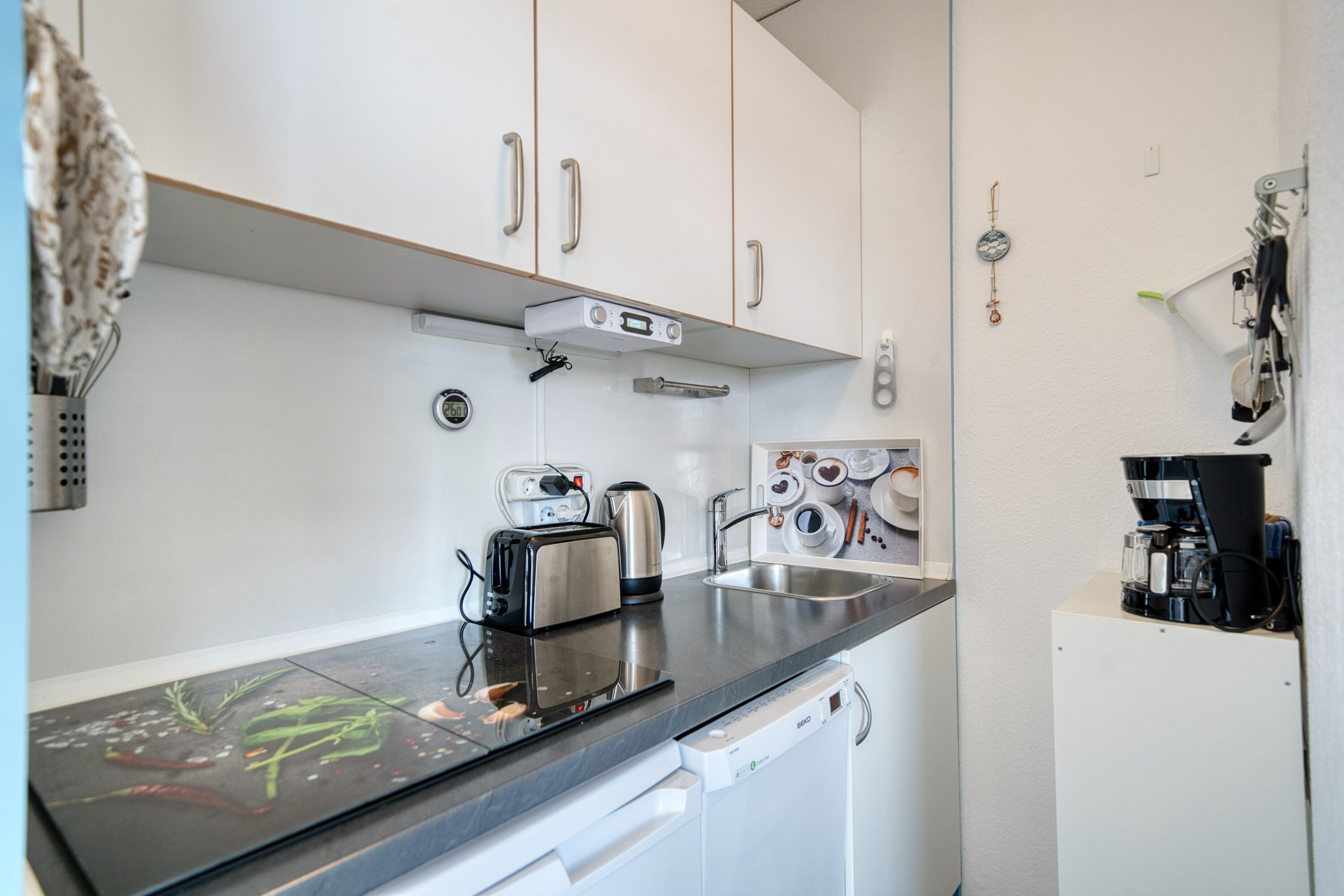 Die Küche ist mit Geschirrspüler, Ceranfeld und Kühlschrank ausgestattet. Im Bad ist eine Duschkabine, sowie ein Handtuchtrockner.