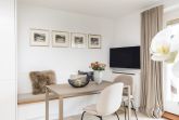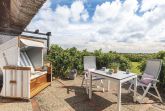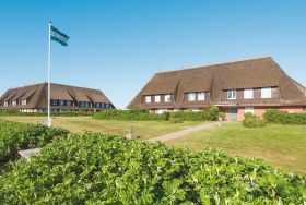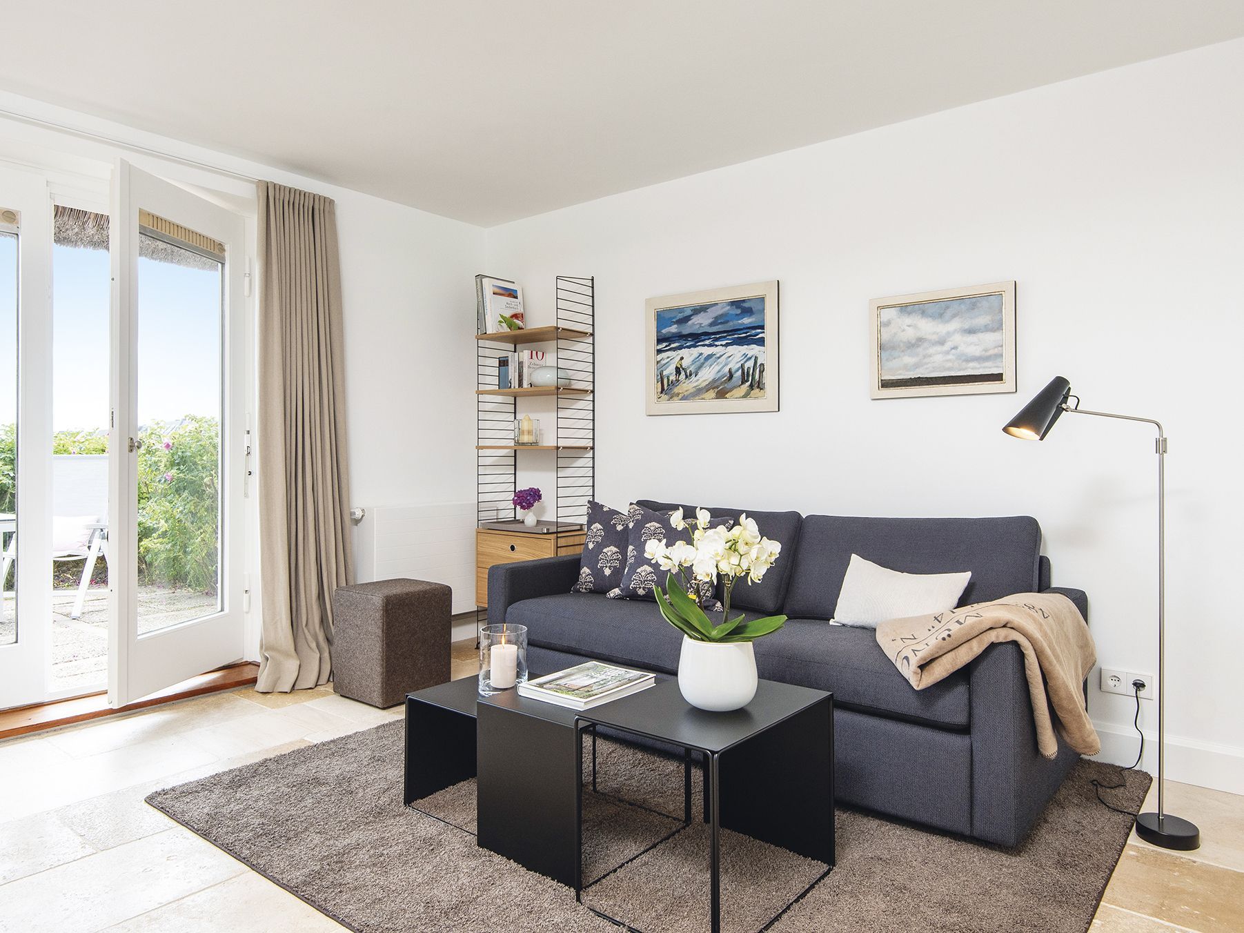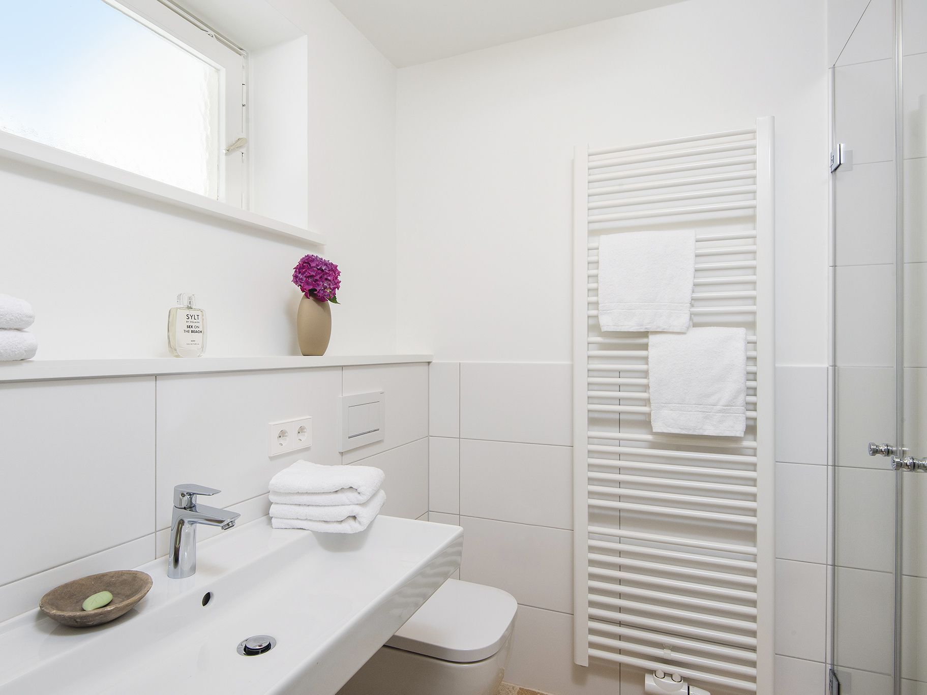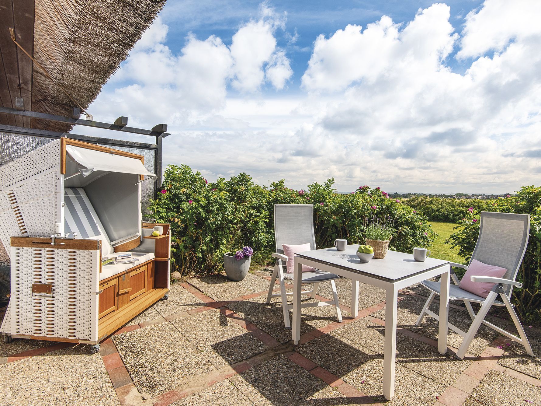 Diese ganz frisch renovierte Erdgeschosswohnung in einem gediegenen Appartementhaus unter Reet strahlt moderne Gemütlichkeit aus sobald man sie betritt. Zur Rechten erwartet Sie das hyggelige Alkovenbett für Zwei und gegenüber zur Linken glänzt das hell gestaltete Bad mit ebenerdiger Dusche. Von dem kleinen Flur gelangen Sie nun ins WohnEsszimmer samt Küchenzeile und Zugang zur Terrasse mit weitem Blick gleich über beide Meere bis nach List. Die Essecke mit Sitzbank lädt zu geselliger Runde ein und in der Sofaecke lässt es sich herrlich in einem Buch schmökern. Das Quartier ist mit beigefarbenem Naturstein ausgelegt und insgesamt ganz in Weiß- und Naturtönen gehalten.