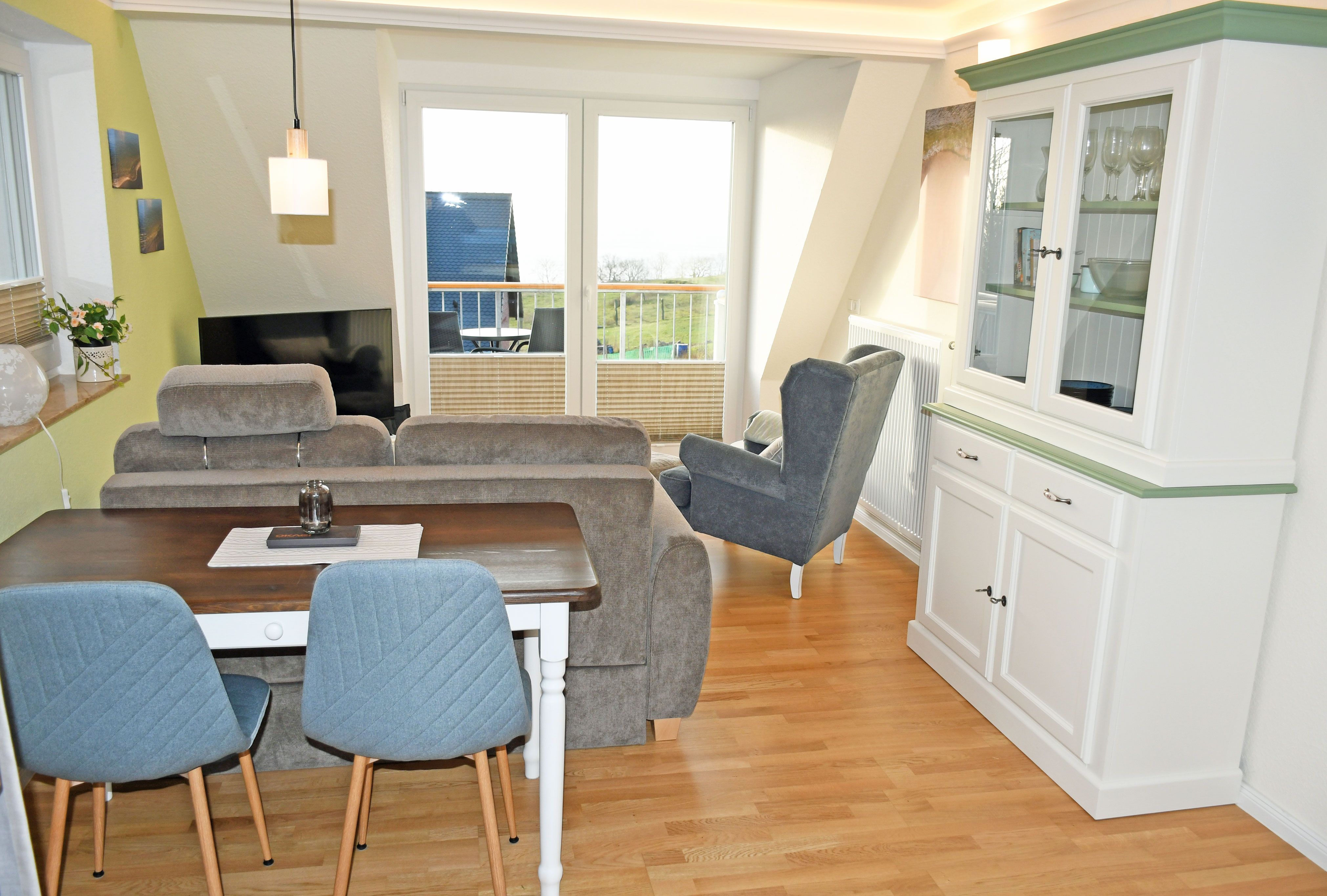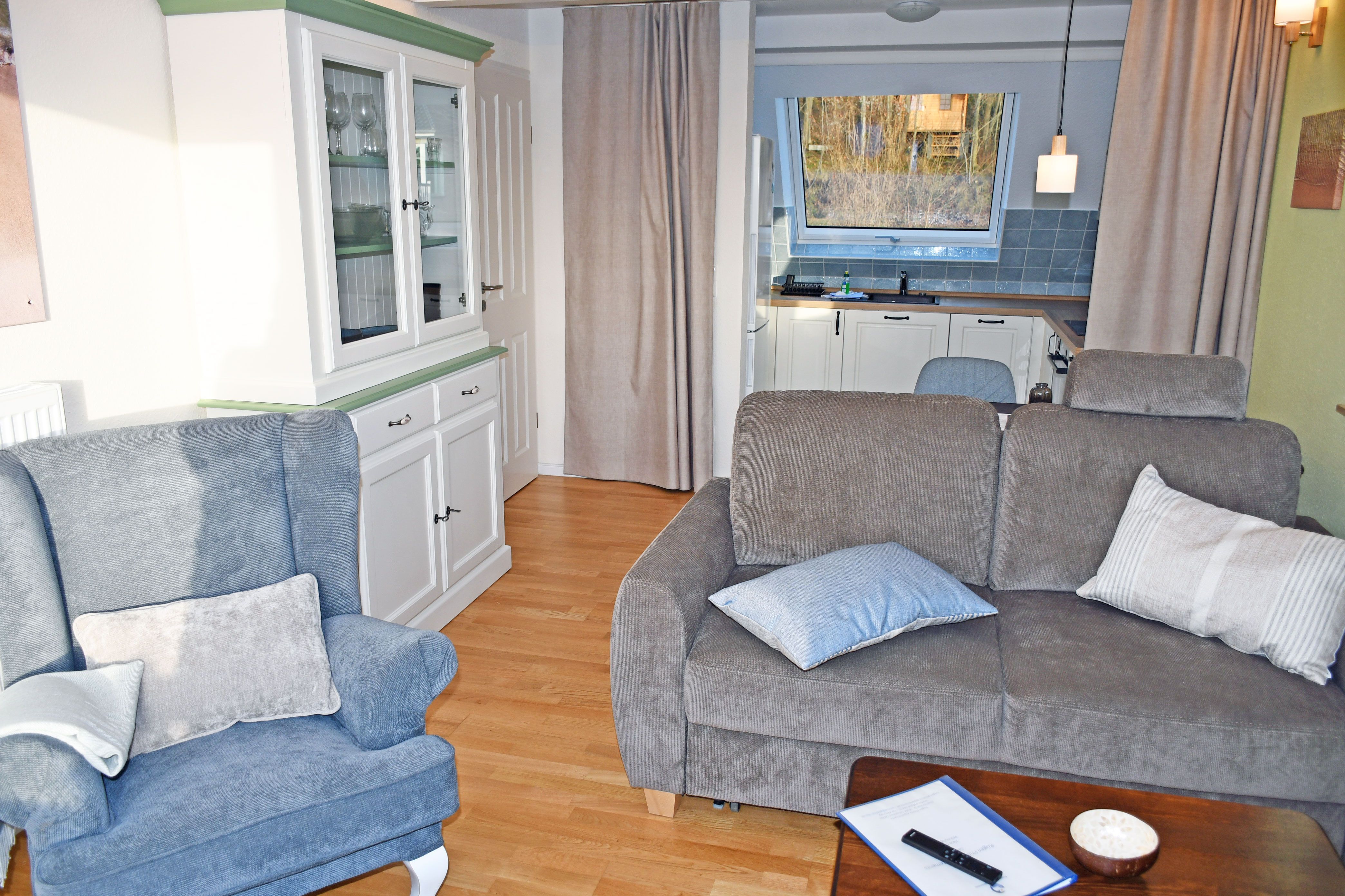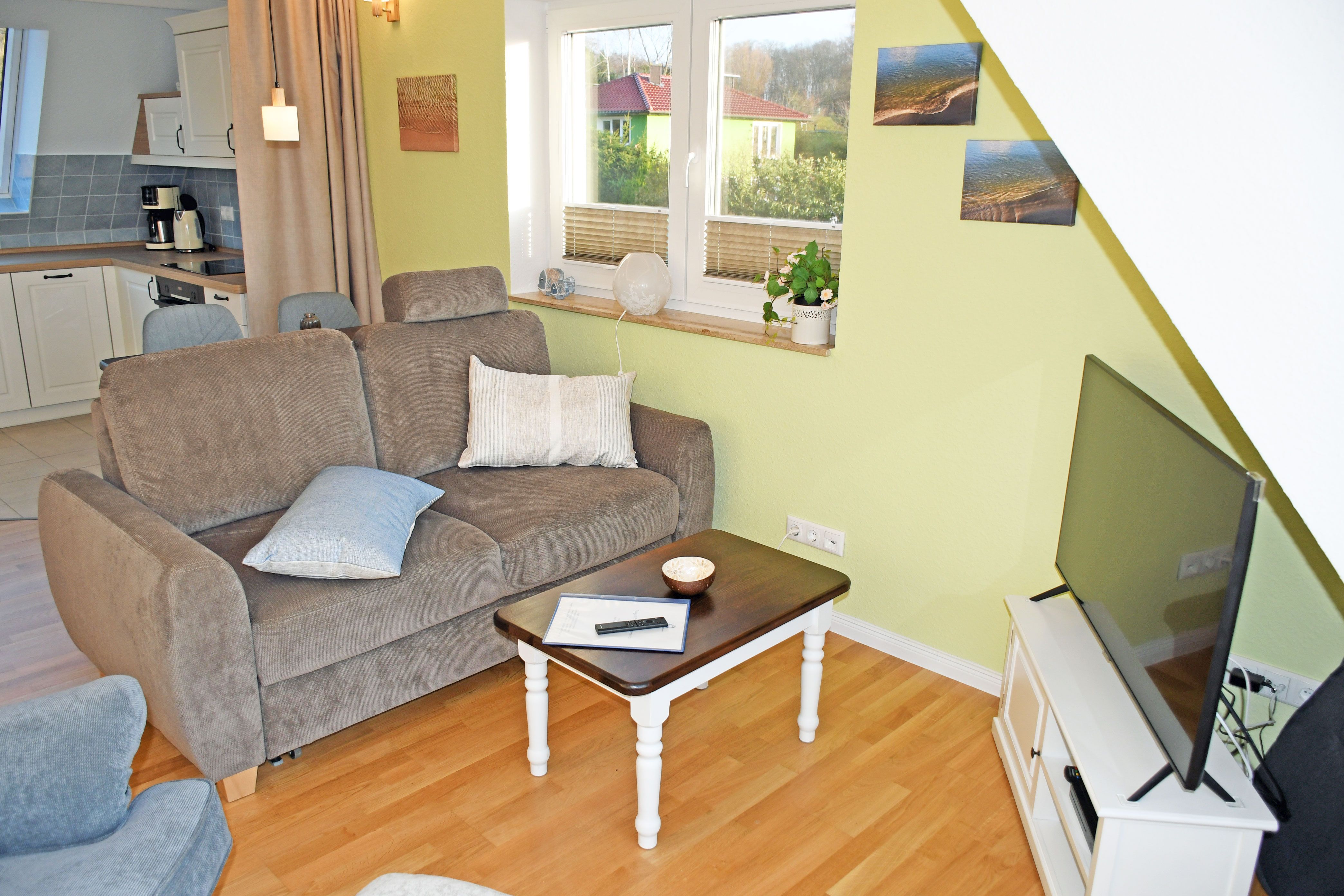 - Wohnbereich mit Schlafsofa, Sessel und Couchtisch, 43- UHD-Smart-TV mit Netflix und Blu-ray-Player, Esstisch mit 3 Stühlen