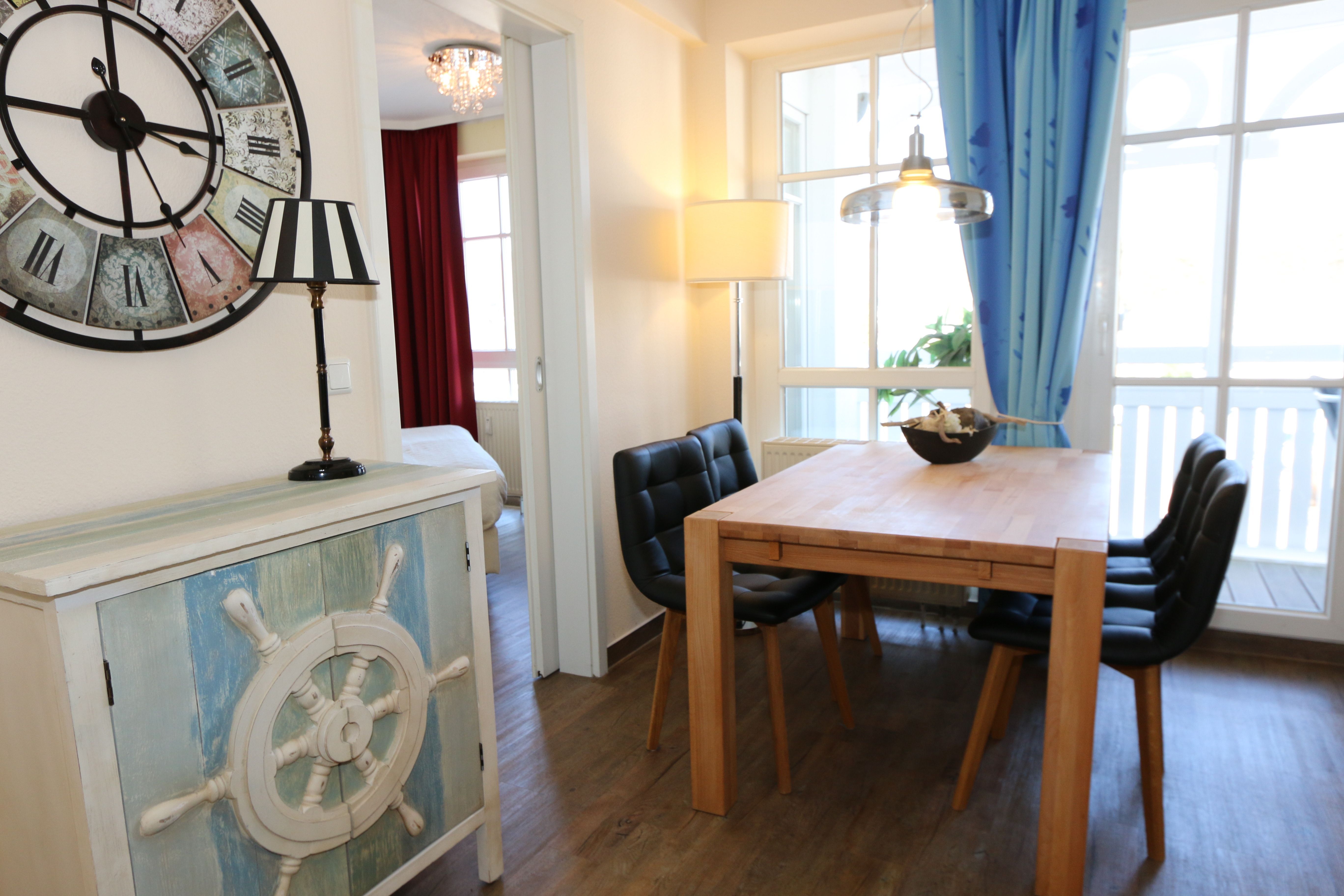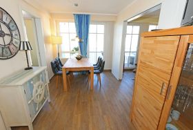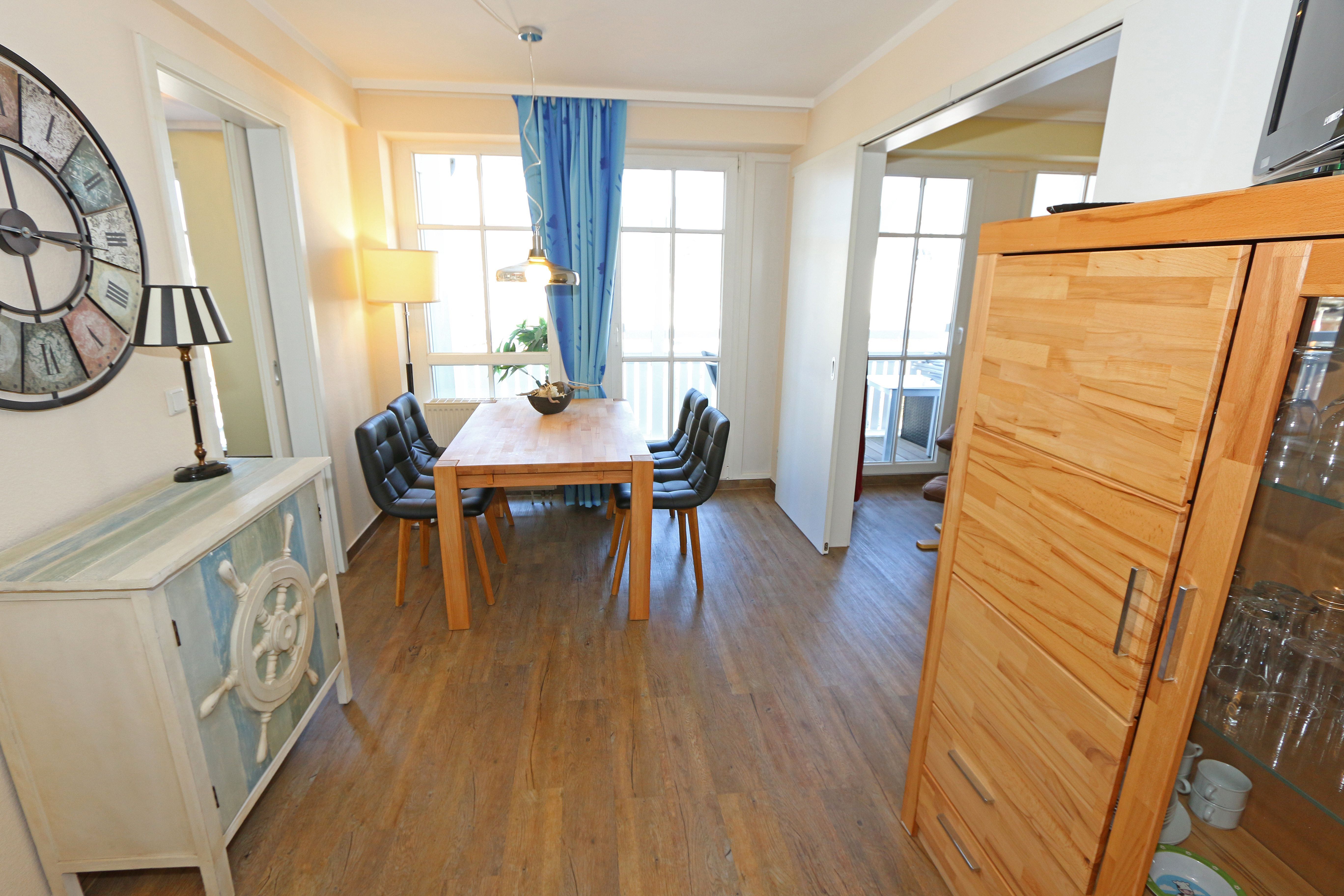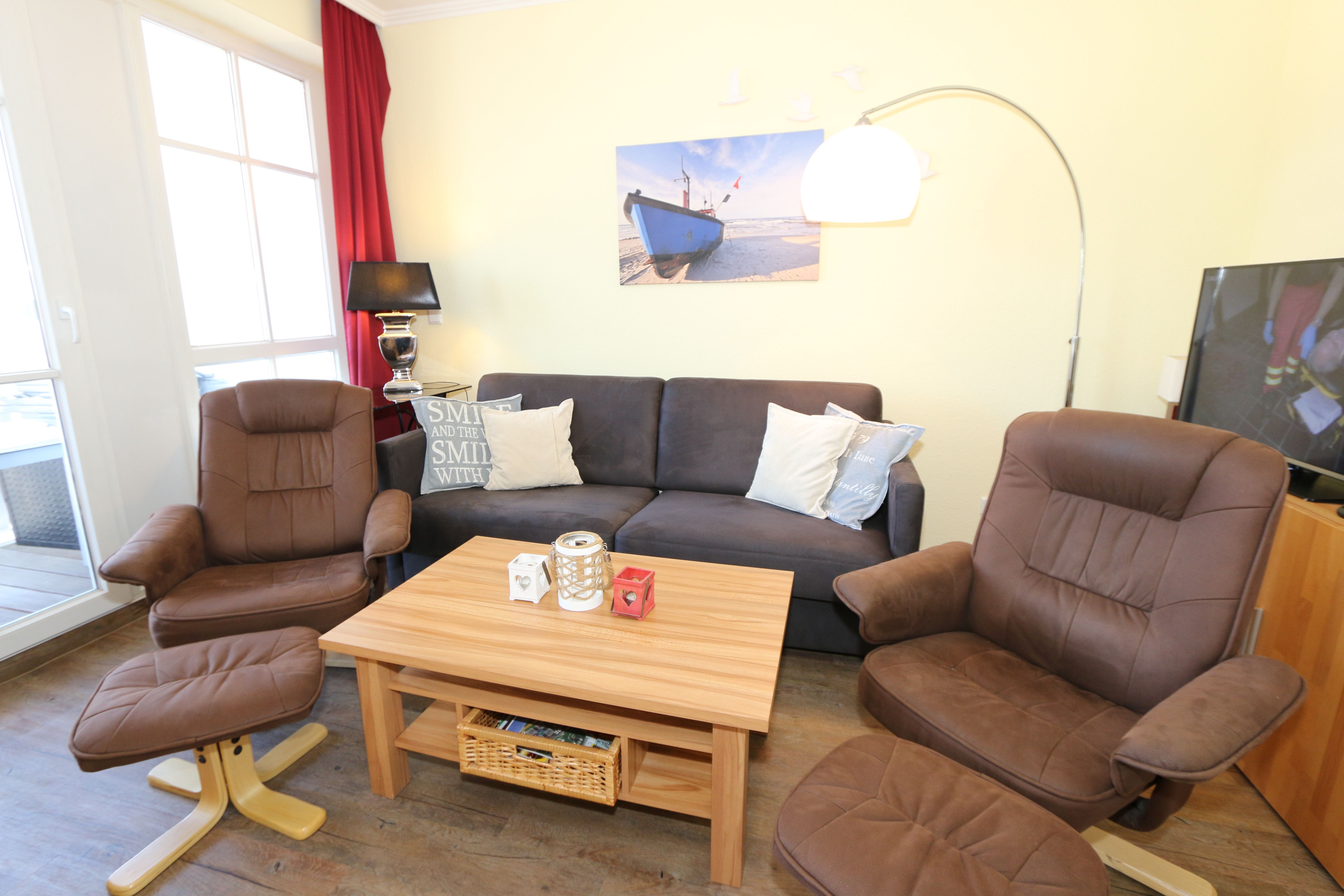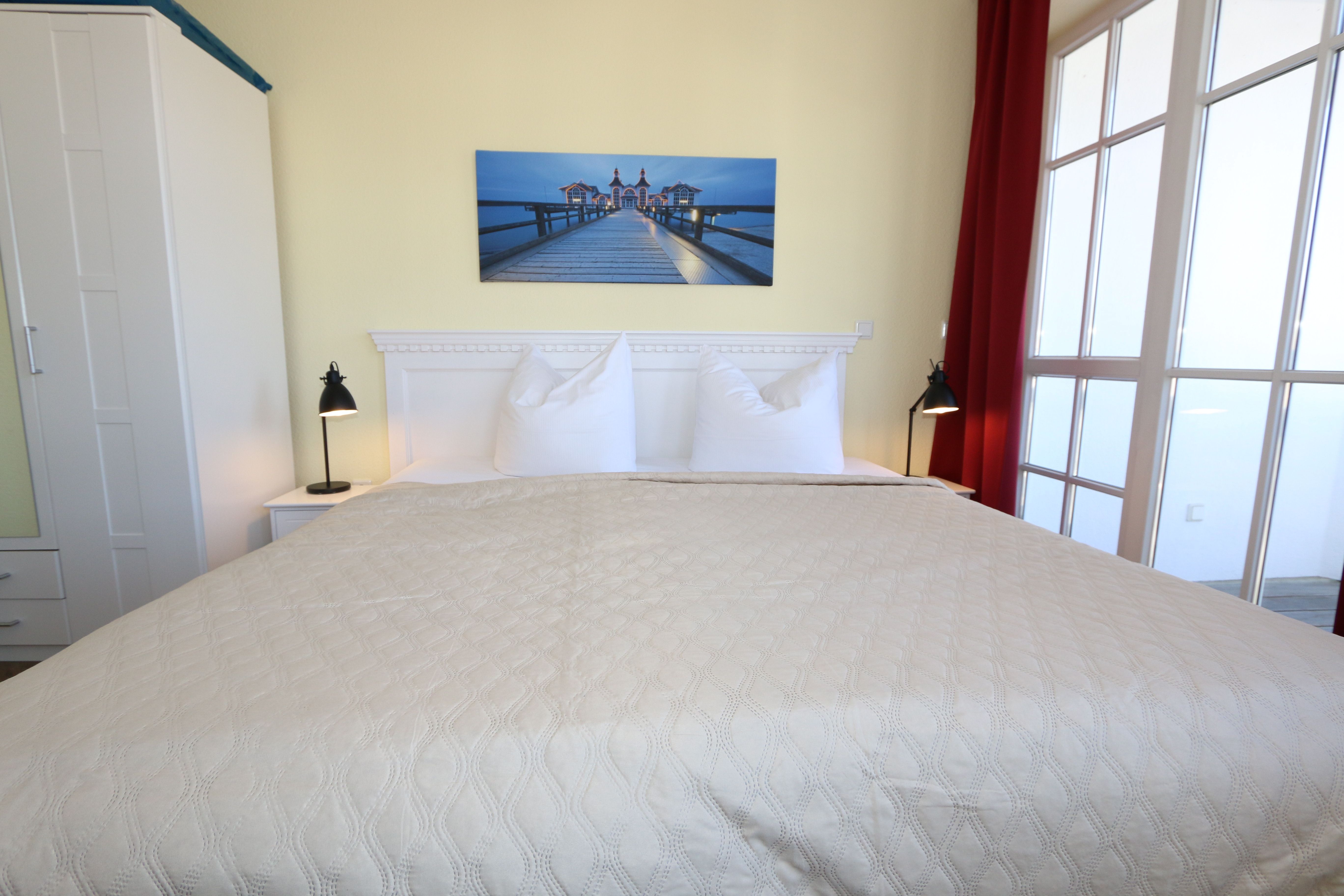 Die gemütlich eingerichtete Nichtraucherwohnung befindet sich in der 2. Etage des Hauses Altensien im Seepark Sellin. Durch die ca. 52 qm große Wohnfläche bietet Sie ausreichend Platz für max. 2 Personen. Der Wohn-/ Essbereich ist mit Schiebetüren voneinander abtrennbar. Der Essbereich verfügt über eine moderne Küchenzeile mit Ceranfeld, Spüle, Kühlschrank, Gefrierfach, Nespresso Maschine, Spülmaschine, Mikrowelle, Backofen, Kaffeemaschine, Toaster, Wasserkocher sowie diversen Küchenutensilien. Angrenzend haben Sie einen hellen und gemütlichen Essbereich, der nicht nur für die Mahlzeiten zum Verweilen einlädt. Zusätzlich haben Sie eine Leselampe, ein Highboard mit Smart-TV und DVD-Player sowie auch ein 2. TV-Flachbild im Wohnbereich. Im Wohnbereich passt sich eine Couch, ein Sessel, ein Couchtisch sowie eine Anrichte mit Mini-Stereo-Anlage dem Raum an. Das geräumige Schlafzimmer bietet Ihnen ein Doppelbett (2x 0,90m x 2,00m), verstellbare Lattenroste, Nachtischkonsolen und Kleiderschrank. Vom Schlaf-/Ess- & Wohnbereich können Sie den bestuhlten Balkon (Osten) erreichen. Das Badezimmer ist in 2 Räume aufgeteilt, wo sich in einem der Räume eine ebenerdige Glasdusche sowie ein Waschtisch mit Fön befindet und in einem weiterem Raum, das WC mit kleinem Waschbecken. Beide Badezimmer sind gefliest. Alle anderen Räumlichkeiten sind mit einem Vinylboden verlegt worden. Ein eigener PKW-Stellplatz (42) steht Ihnen in der Tiefgarage (Höhe 2,00m) zur Verfügung sowie auch eine Fahrradabstellmöglichkeit im Keller. Auch im Urlaub brauchen Sie in Ihrer Wohnung nicht auf einen Internetanschluss (WLAN) verzichten. Dieser ist für Sie inklusive!!! Für unsere kleinen Gästen ist 1x Kinderreisebett mit zusätzlicher Matratze inklusive. 2 Hunde bis Kniehöhe oder 1 Kniehoher Hund (keine Katzen) sind gegen eine Gebühr gern gesehene Gäste in der Wohnung. Die Erstausstattung eines Wäschepaketes (komplette Bettwäsche, 1 Duschhandtuch, 2 kleine Handtücher) können Sie bis 14 Tage vor Anreise gegen einen Aufpreis dazu buchen oder durch eigene ergänzen. Ab 2 gebuchten Paketen erhalten Sie einmalig 1 Geschirrhandtuch und 1 Duschvorleger hinzu.