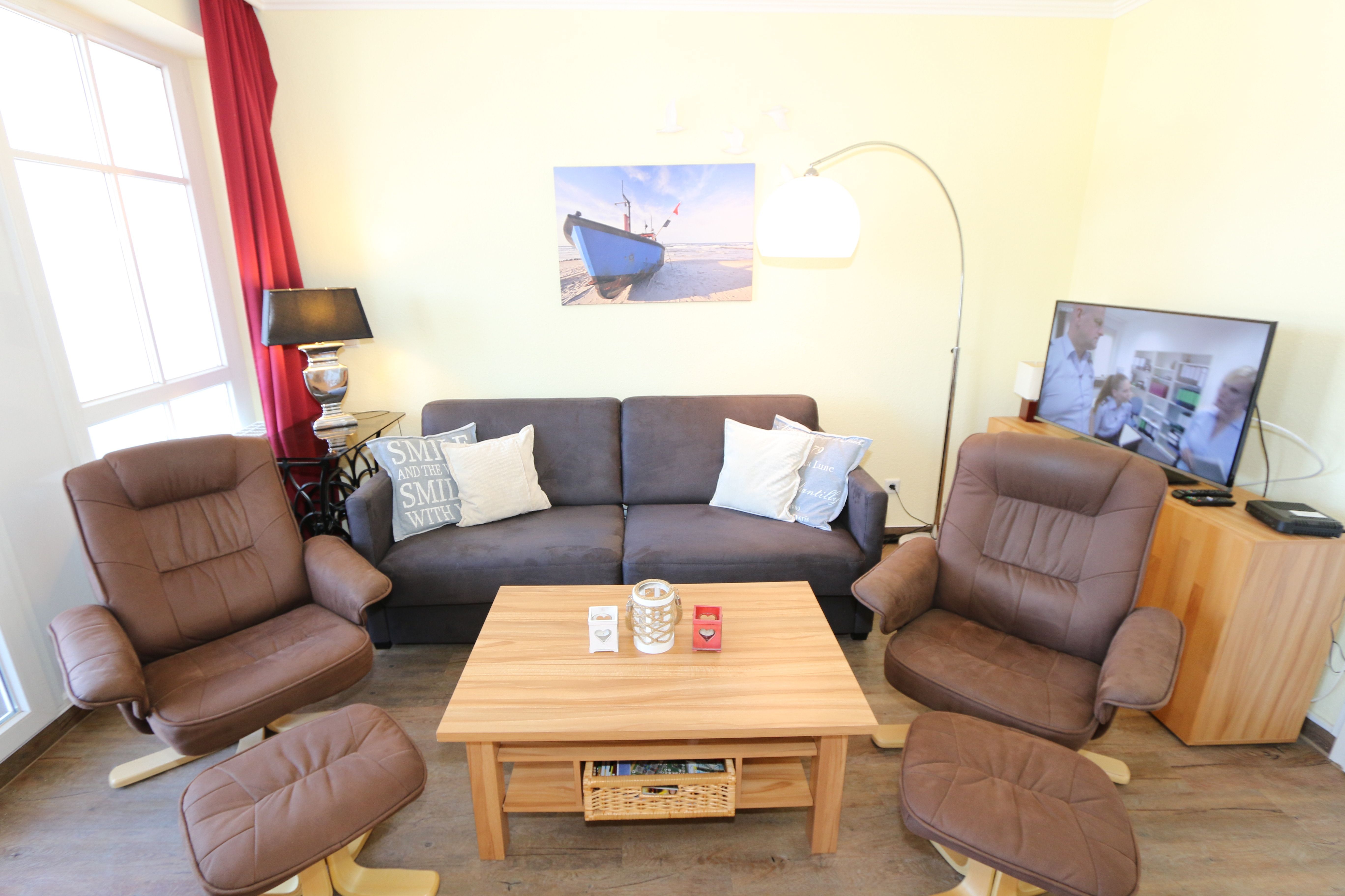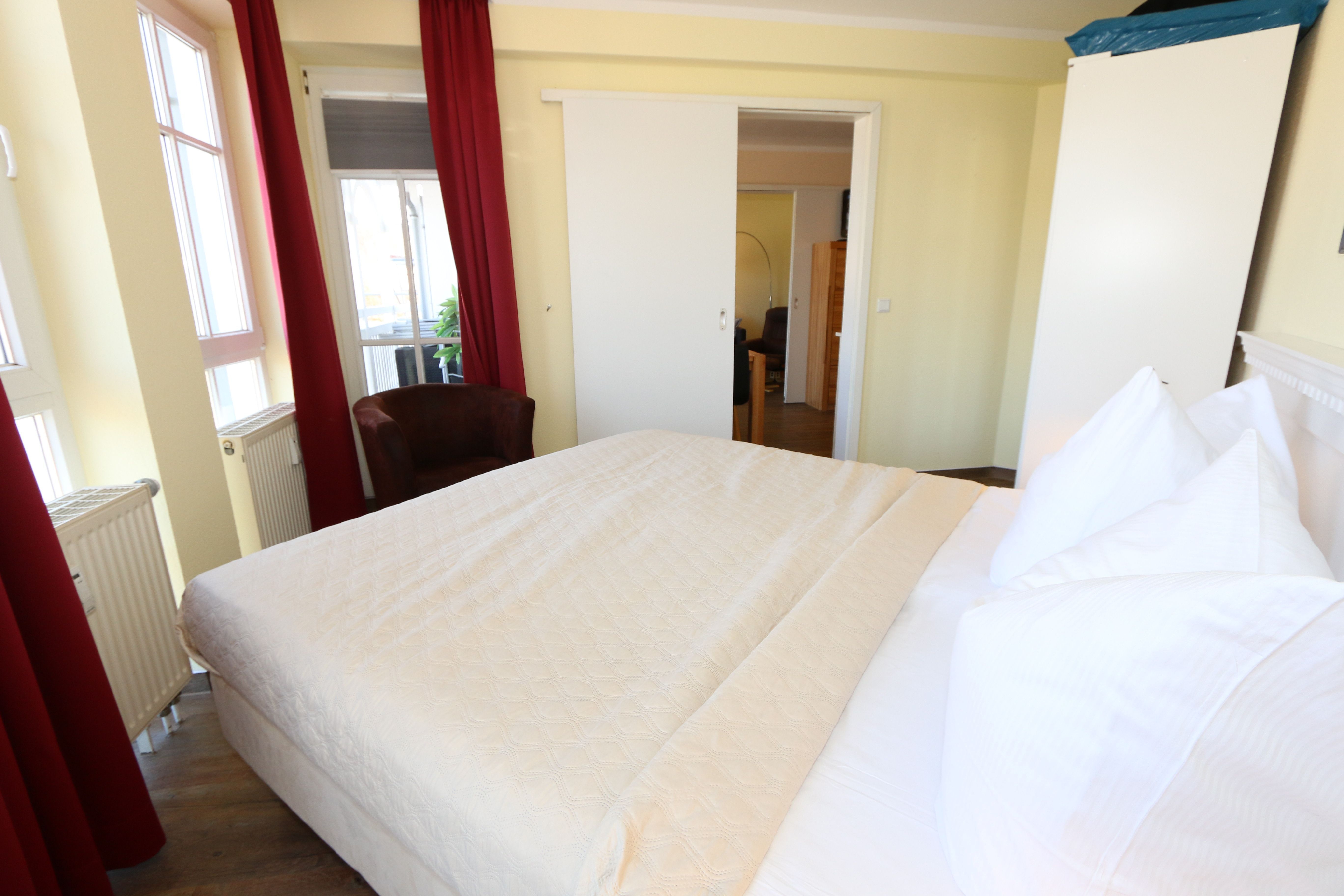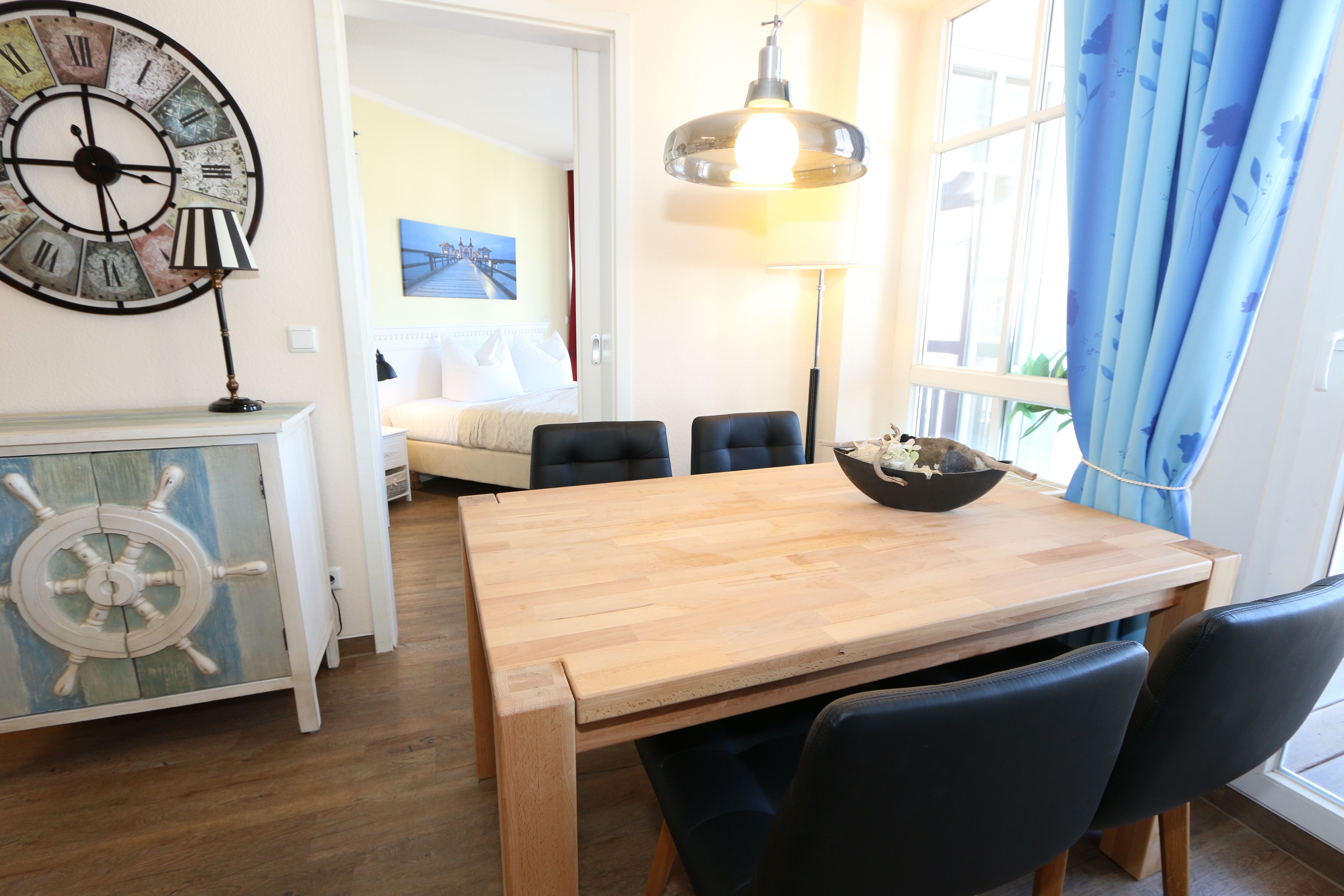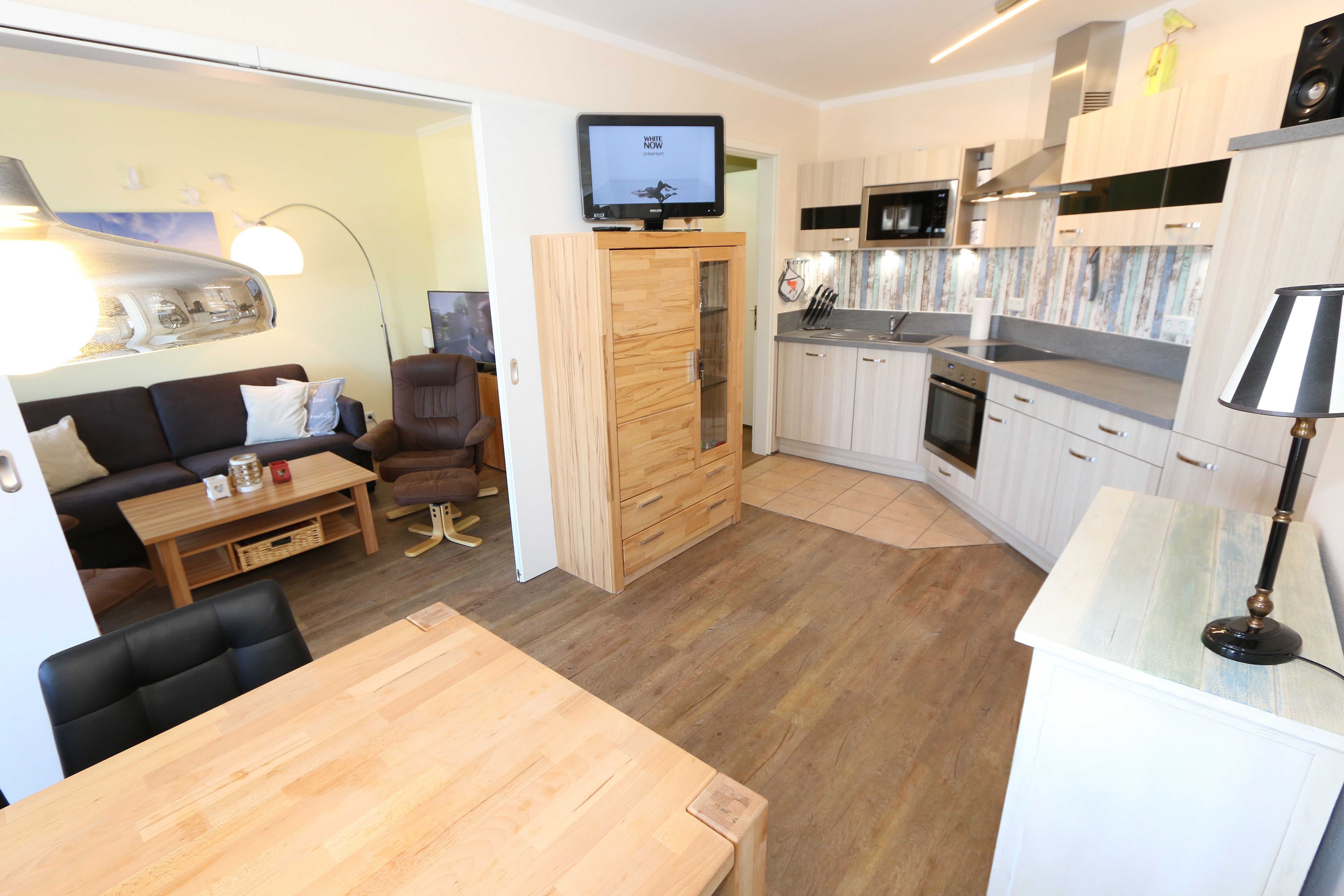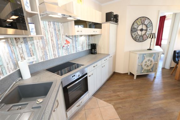 Die gemütlich eingerichtete Nichtraucherwohnung befindet sich in der 2. Etage des Hauses Altensien im Seepark Sellin. Durch die ca. 52 qm große Wohnfläche bietet Sie ausreichend Platz für max. 2 Personen. Der Wohn-/ Essbereich ist mit Schiebetüren voneinander abtrennbar. Der Essbereich verfügt über eine moderne Küchenzeile mit Ceranfeld, Spüle, Kühlschrank, Gefrierfach, Nespresso Maschine, Spülmaschine, Mikrowelle, Backofen, Kaffeemaschine, Toaster, Wasserkocher sowie diversen Küchenutensilien. Angrenzend haben Sie einen hellen und gemütlichen Essbereich, der nicht nur für die Mahlzeiten zum Verweilen einlädt. Zusätzlich haben Sie eine Leselampe, ein Highboard mit Smart-TV und DVD-Player sowie auch ein 2. TV-Flachbild im Wohnbereich. Im Wohnbereich passt sich eine Couch, ein Sessel, ein Couchtisch sowie eine Anrichte mit Mini-Stereo-Anlage dem Raum an. Das geräumige Schlafzimmer bietet Ihnen ein Doppelbett (2x 0,90m x 2,00m), verstellbare Lattenroste, Nachtischkonsolen und Kleiderschrank. Vom Schlaf-/Ess- & Wohnbereich können Sie den bestuhlten Balkon (Osten) erreichen. Das Badezimmer ist in 2 Räume aufgeteilt, wo sich in einem der Räume eine ebenerdige Glasdusche sowie ein Waschtisch mit Fön befindet und in einem weiterem Raum, das WC mit kleinem Waschbecken. Beide Badezimmer sind gefliest. Alle anderen Räumlichkeiten sind mit einem Vinylboden verlegt worden. Ein eigener PKW-Stellplatz (42) steht Ihnen in der Tiefgarage (Höhe 2,00m) zur Verfügung sowie auch eine Fahrradabstellmöglichkeit im Keller. Auch im Urlaub brauchen Sie in Ihrer Wohnung nicht auf einen Internetanschluss (WLAN) verzichten. Dieser ist für Sie inklusive!!! Für unsere kleinen Gästen ist 1x Kinderreisebett mit zusätzlicher Matratze inklusive. 2 Hunde bis Kniehöhe oder 1 Kniehoher Hund (keine Katzen) sind gegen eine Gebühr gern gesehene Gäste in der Wohnung. Die Erstausstattung eines Wäschepaketes (komplette Bettwäsche, 1 Duschhandtuch, 2 kleine Handtücher) können Sie bis 14 Tage vor Anreise gegen einen Aufpreis dazu buchen oder durch eigene ergänzen. Ab 2 gebuchten Paketen erhalten Sie einmalig 1 Geschirrhandtuch und 1 Duschvorleger hinzu.