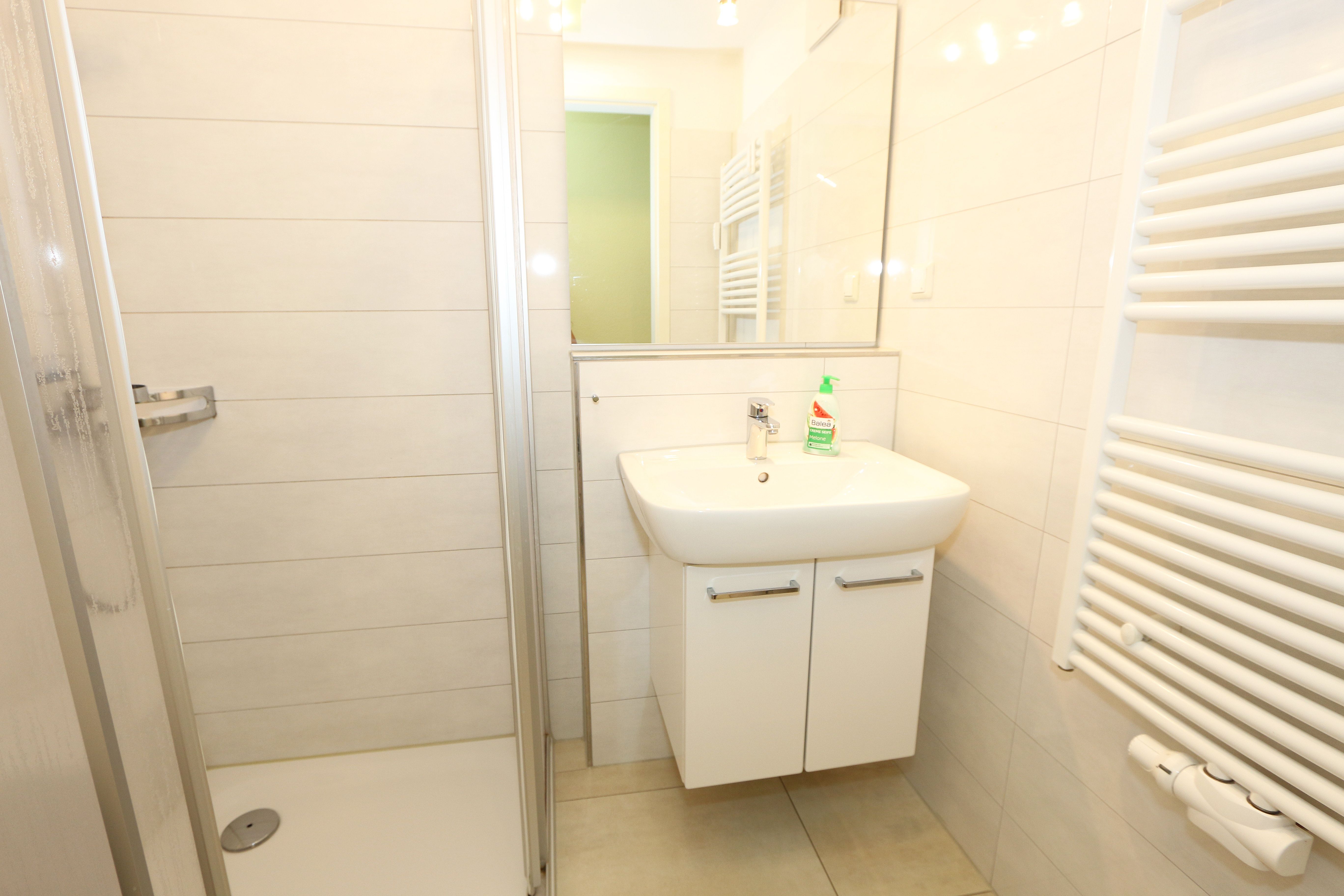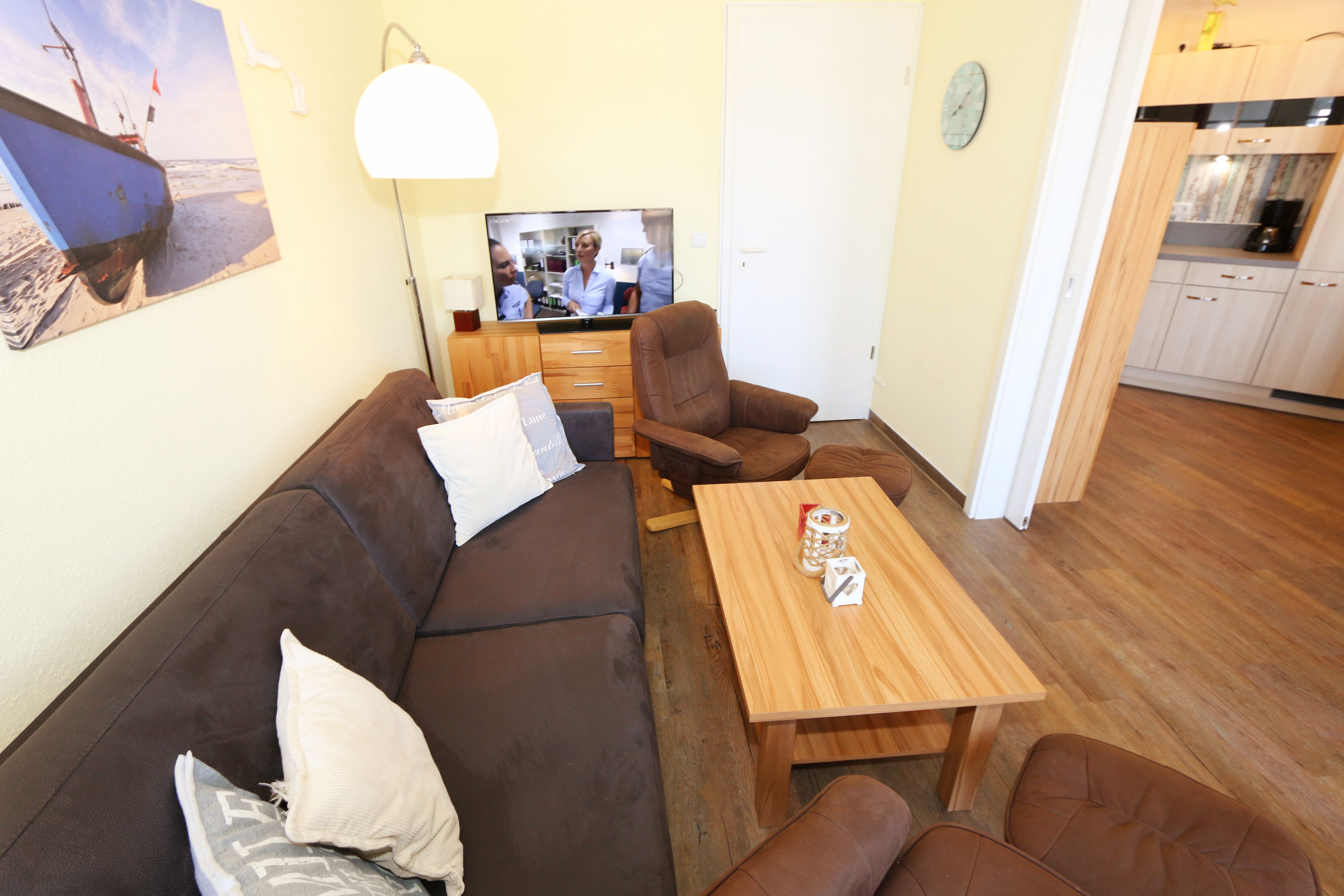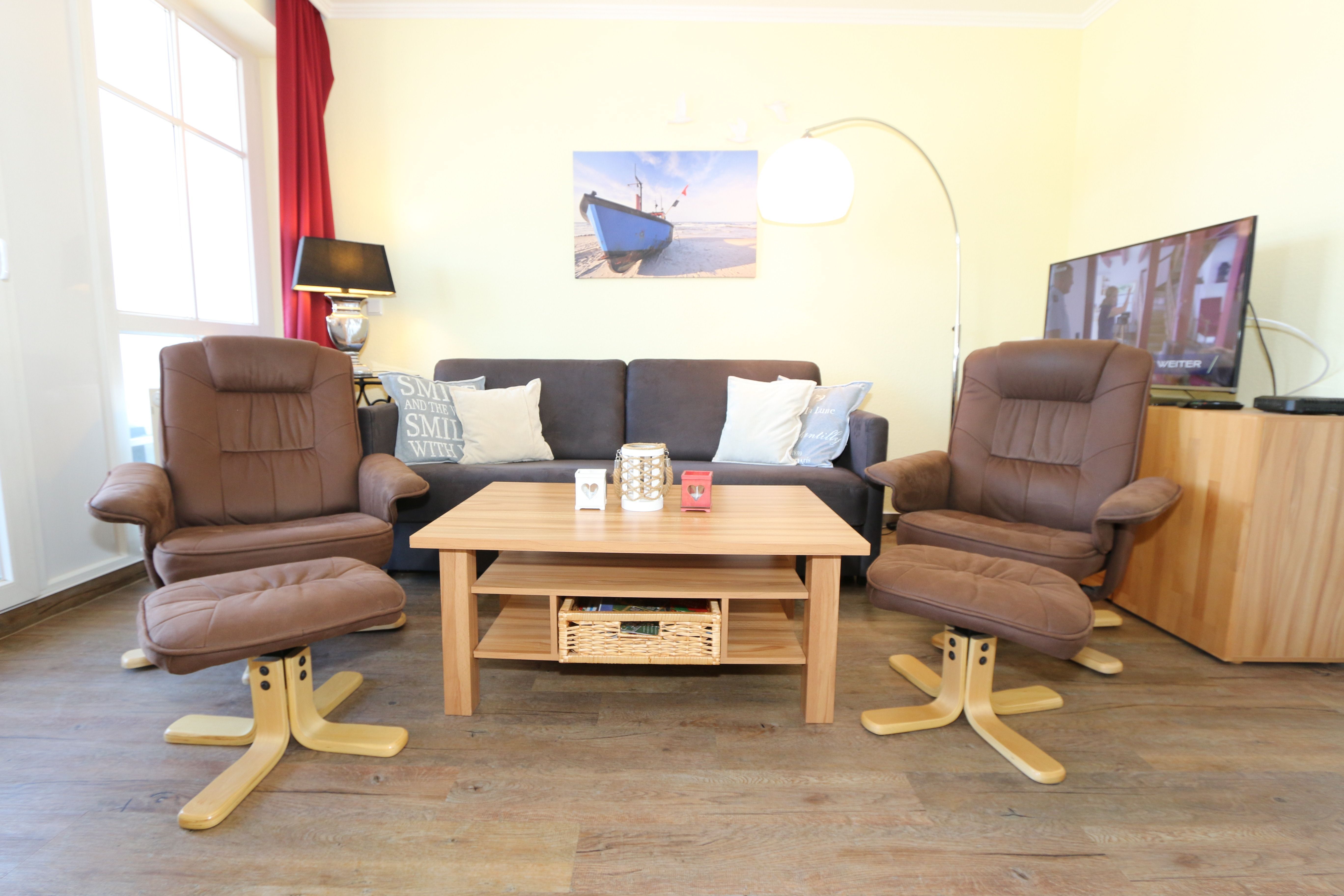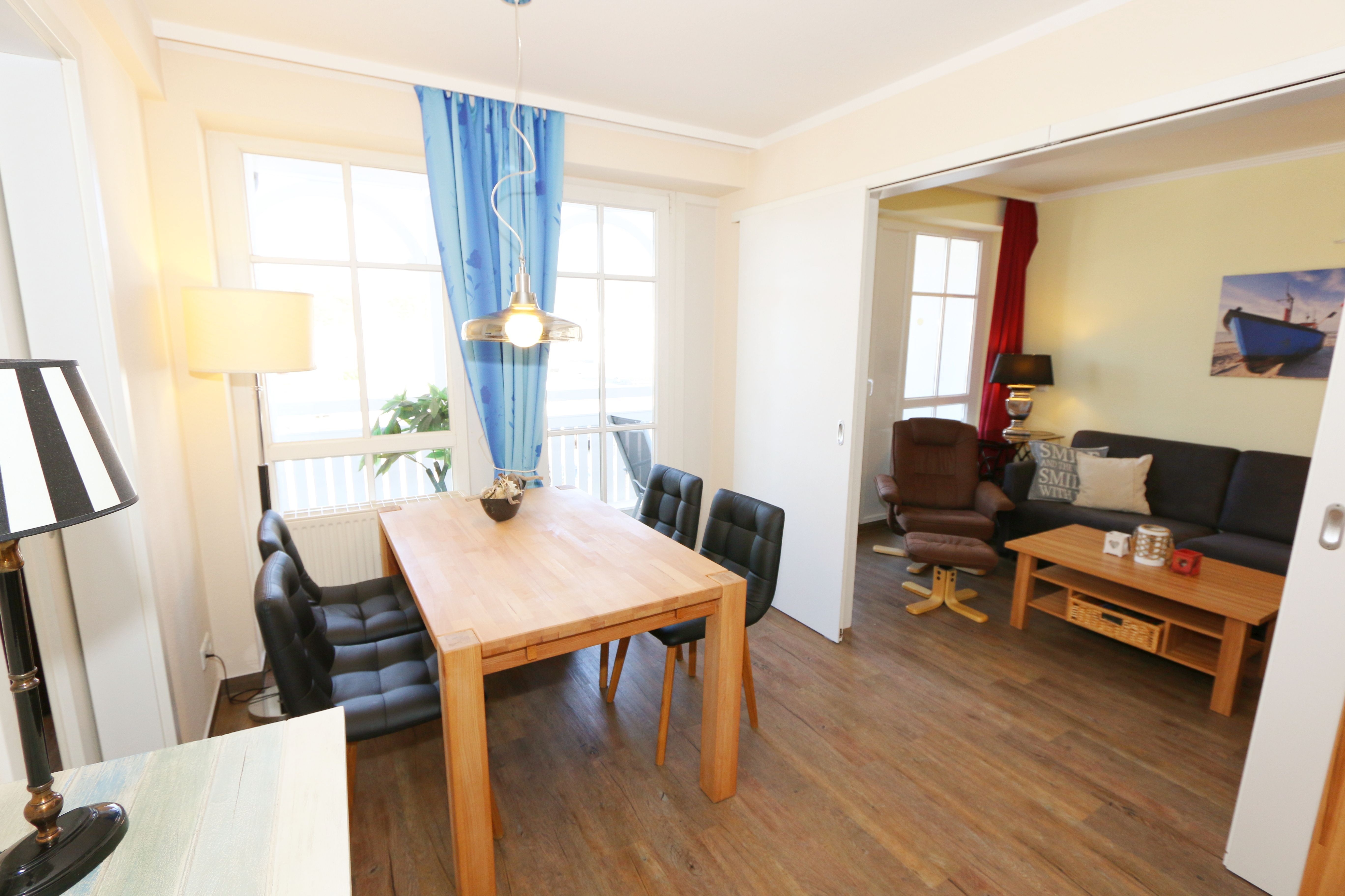 Die gemütlich eingerichtete Nichtraucherwohnung befindet sich in der 2. Etage des Hauses Altensien im Seepark Sellin. Durch die ca. 52 qm große Wohnfläche bietet Sie ausreichend Platz für max. 2 Personen. Der Wohn-/ Essbereich ist mit Schiebetüren voneinander abtrennbar. Der Essbereich verfügt über eine moderne Küchenzeile mit Ceranfeld, Spüle, Kühlschrank, Gefrierfach, Nespresso Maschine, Spülmaschine, Mikrowelle, Backofen, Kaffeemaschine, Toaster, Wasserkocher sowie diversen Küchenutensilien. Angrenzend haben Sie einen hellen und gemütlichen Essbereich, der nicht nur für die Mahlzeiten zum Verweilen einlädt. Zusätzlich haben Sie eine Leselampe, ein Highboard mit Smart-TV und DVD-Player sowie auch ein 2. TV-Flachbild im Wohnbereich. Im Wohnbereich passt sich eine Couch, ein Sessel, ein Couchtisch sowie eine Anrichte mit Mini-Stereo-Anlage dem Raum an. Das geräumige Schlafzimmer bietet Ihnen ein Doppelbett (2x 0,90m x 2,00m), verstellbare Lattenroste, Nachtischkonsolen und Kleiderschrank. Vom Schlaf-/Ess- & Wohnbereich können Sie den bestuhlten Balkon (Osten) erreichen. Das Badezimmer ist in 2 Räume aufgeteilt, wo sich in einem der Räume eine ebenerdige Glasdusche sowie ein Waschtisch mit Fön befindet und in einem weiterem Raum, das WC mit kleinem Waschbecken. Beide Badezimmer sind gefliest. Alle anderen Räumlichkeiten sind mit einem Vinylboden verlegt worden. Ein eigener PKW-Stellplatz (42) steht Ihnen in der Tiefgarage (Höhe 2,00m) zur Verfügung sowie auch eine Fahrradabstellmöglichkeit im Keller. Auch im Urlaub brauchen Sie in Ihrer Wohnung nicht auf einen Internetanschluss (WLAN) verzichten. Dieser ist für Sie inklusive!!! Für unsere kleinen Gästen ist 1x Kinderreisebett mit zusätzlicher Matratze inklusive. 2 Hunde bis Kniehöhe oder 1 Kniehoher Hund (keine Katzen) sind gegen eine Gebühr gern gesehene Gäste in der Wohnung. Die Erstausstattung eines Wäschepaketes (komplette Bettwäsche, 1 Duschhandtuch, 2 kleine Handtücher) können Sie bis 14 Tage vor Anreise gegen einen Aufpreis dazu buchen oder durch eigene ergänzen. Ab 2 gebuchten Paketen erhalten Sie einmalig 1 Geschirrhandtuch und 1 Duschvorleger hinzu.