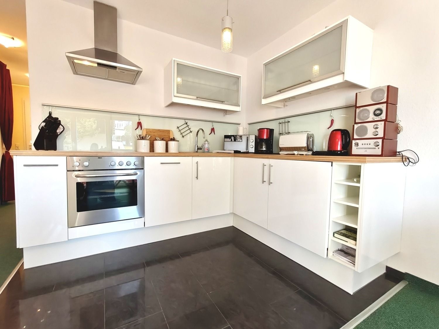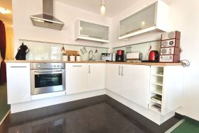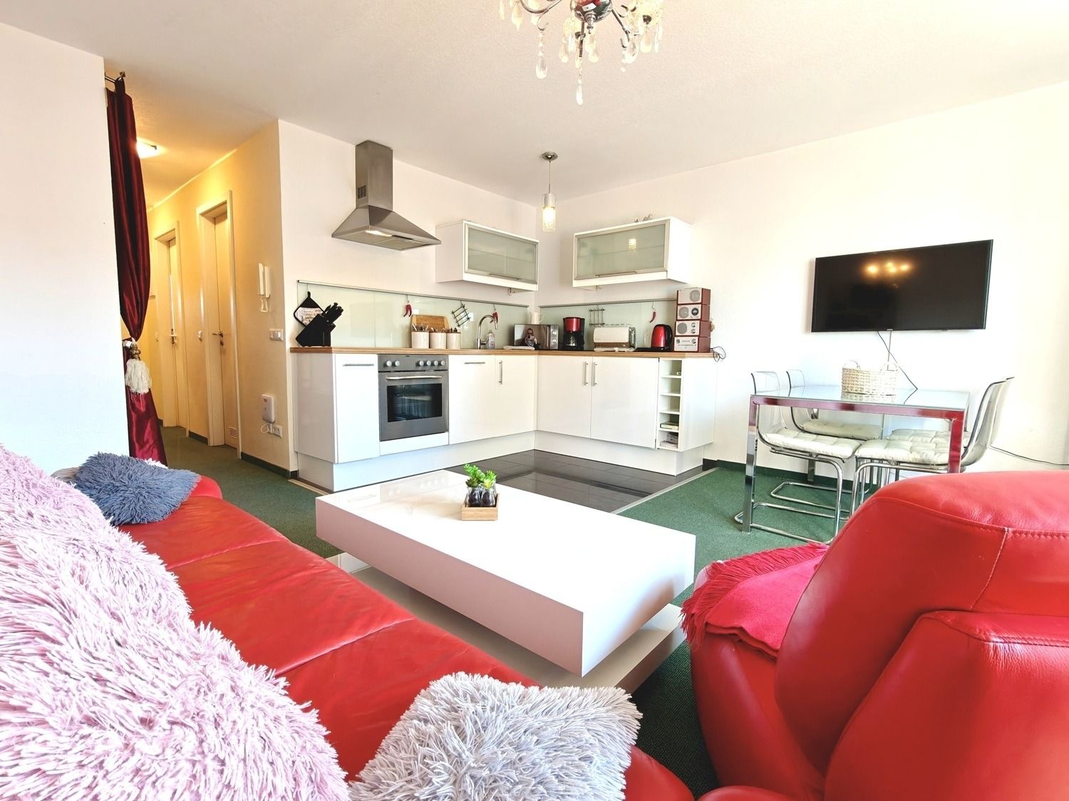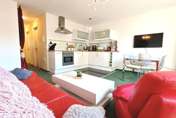 Der helle Wohnbereich mit integrierter Küchenzeile lädt zum Verweilen ein. Die gut ausgestattete Küche verfügt über einen Geschirrspüler, Kühlschrank sowie weitere praktische Küchenutensilien, sodass Sie sich bequem selbst versorgen können.