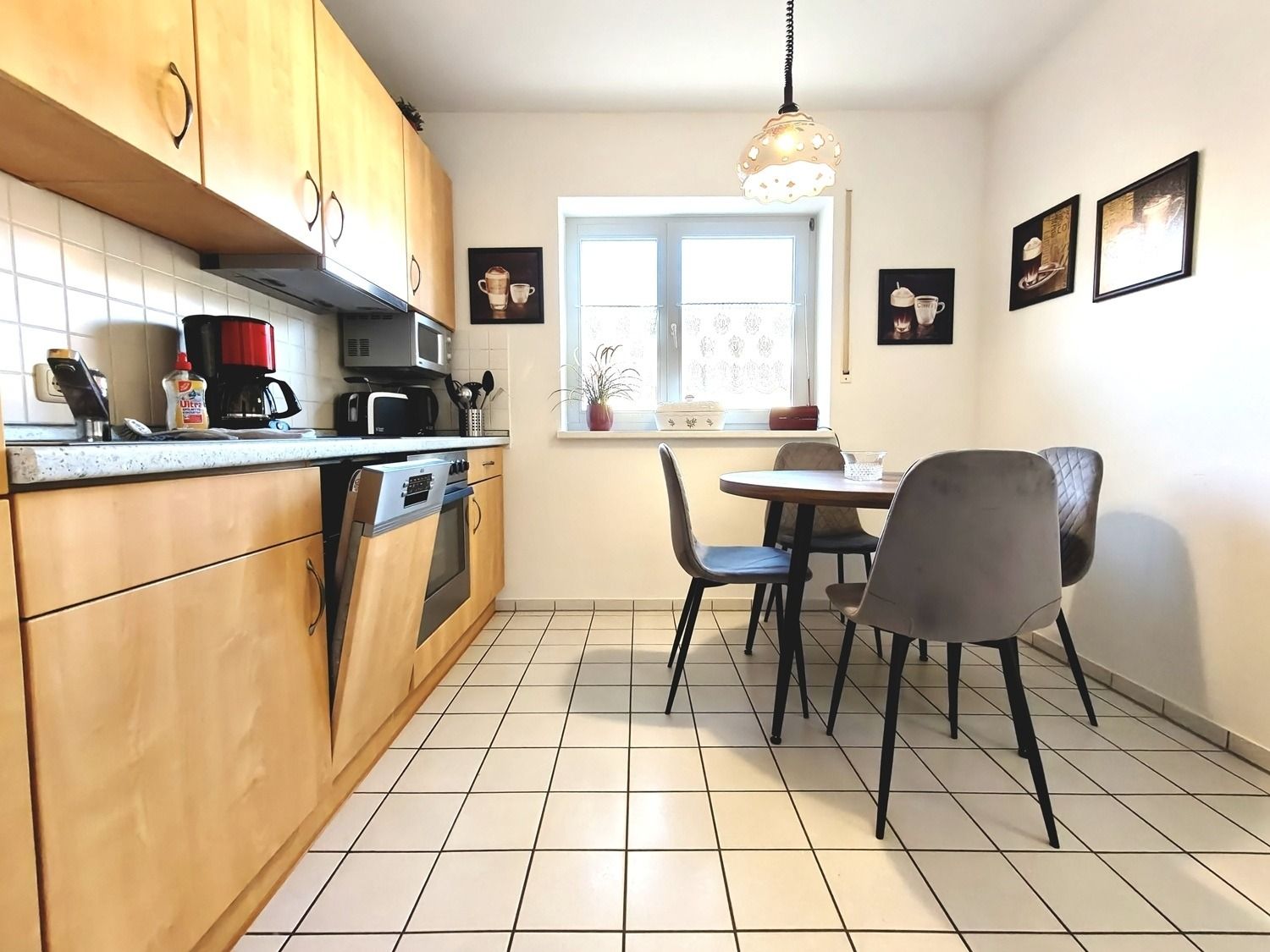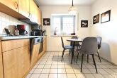 Die Küche ist funktional und gut ausgestattet. Neben einem kleinen Essplatz für das Frühstück oder den Kaffee zwischendurch stehen Ihnen unter anderem ein Geschirrspüler sowie eine Mikrowelle zur Verfügung – für zusätzlichen Komfort während Ihres Aufenthalts.