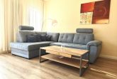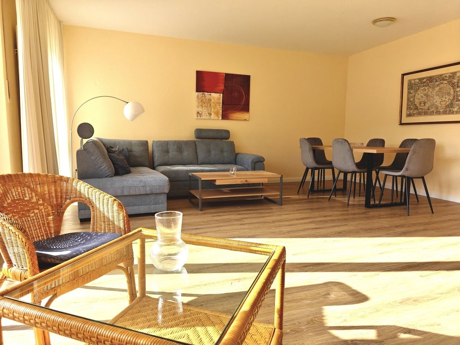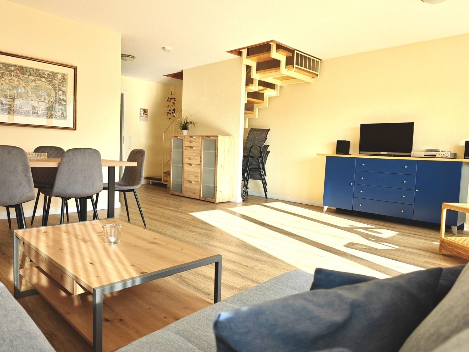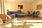 Das große Wohnzimmer bildet den Mittelpunkt der Wohnung. Eine bequeme Eckcouch lädt zum Entspannen ein – perfekt für gemeinsame Abende nach einem erlebnisreichen Strandtag. Der großzügige Esstisch bietet ausreichend Platz für gemeinsame Mahlzeiten, Spieleabende oder gesellige Runden.